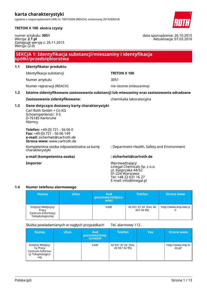 karta charakterystyki zgodnie z rozporządzeniem (WE) nr 1907/2006 (REACH), zmienionej 2015/830/UE TRITON X 100 ekstra czysty numer artykułu: 3051 Wersja: 2.1 pl Zastępuje wersję z: 26.11.2015 Wersja: (2.0) data sporządzenia: 26.10.2015 Aktualizacja: 07.03.2016 SEKCJA 1: Identyfikacja substancji/mieszaniny i identyfikacja spółki/przedsiębiorstwa 1.1 1.2 Identyfikator produktu Identyfikacja substancji TRITON X 100 Numer artykułu 3051 Numer rejestracji (REACH) nie istotne (mieszanina) Istotne zidentyfikowane zastosowania substancji lub mieszaniny oraz zastosowania odradzane Zastosowania zidentyfikowane: 1.3 chemikalia laboratoryjna Dane dotyczące dostawcy karty charakterystyki Carl Roth GmbH + Co KG Schoemperlenstr. 3-5 D-76185 Karlsruhe Niemcy Telefon: +49 (0) 721 - 56 06 0 Fax: +49 (0) 721 - 56 06 149 e-mail: [email protected] Strona www: www.carlroth.de 1.4 Kompetentna osoba odpowiedzialna za kartę charakterystyki : Department Health, Safety and Environment e-mail (kompetentna osoba) : [email protected] Importer Wprowadzający: Linegal Chemicals Sp. z o.o. ul. Kasprzaka 44/52 01-224 Warszawa Tel: +48 22 631 16 27 E-mail: [email protected] Numer telefonu alarmowego Nazwa Ulica Kod pocztowy/miejscowość Telefon Strona www Łódź 42 631 47 24 (Fax: 42 657 42 95) http://www.imp.lodz.p l/ Instytut Medycyny Pracy Centrum Informacji Toksykologicznej Służba powiadamianych w nagłych przypadkach Nazwa Instytut Medycyny Pracy Centrum Informacji Toksykologicznej Polska (pl) Ulica Tel. alarmowy 112 . Kod pocztowy/miejscowość Telefon Łódź 42 631 47 24 (Fax: 42 657 42 95) Fax Strona www http://www.imp.lo dz.pl/ Strona 1 / 13 karta charakterystyki zgodnie z rozporządzeniem (WE) nr 1907/2006 (REACH), zmienionej 2015/830/UE TRITON X 100 ekstra czysty numer artykułu: 3051 SEKCJA 2: Identyfikacja zagrożeń 2.1 Klasyfikacja substancji lub mieszaniny Klasyfikacja zgodnie z rozporządzeniem (WE) nr 1272/2008 (CLP) Klasyfikacja zg. z GHS Sekcja Klasa zagrożenia Klasa i kategoria zagrożenia Zwrot wskazujący rodzaj zagrożenia 3.1O toksyczność ostra (droga pokarmowa) (Acute Tox. 4) H302 3.3 poważne uszkodzenie oczu/działanie drażniące na oczy (Eye Dam. 1) H318 Uwagi Pełny tekst zwrotów wskazujących rodzaj zagrożenia i zwrotów EUH: zob. SEKCJA 16. 2.2 Elementy oznakowania Oznakowania zgodnie z rozporządzeniem (WE) nr 1272/2008 (CLP) Hasło ostrzegawcze Niebezpieczeństwo Piktogramy Zwroty wskazujące rodzaj zagrożenia H302 H318 Działa szkodliwie po połknięciu. Powoduje poważne uszkodzenie oczu. Zwroty wskazujące środki ostrożności Zwroty wskazujące środki ostrożności - zapobieganie P280 Stosować rodzież ochronną/ ochronę oczu. Zwroty wskazujące środki ostrożności - reagowanie P301+P312 P305+P351+P338 W PRZYPADKU POŁKNIĘCIA: W przypadku złego samopoczucia skontaktować się z OŚRODKIEM ZATRUĆ/lekarzem/…. W PRZYPADKU DOSTANIA SIĘ DO OCZU: ostrożnie płukać wodą przez kilka minut. Wyjąć soczewki kontaktowe, jeżeli są i można je łatwo usunąć. Kontynuować płukanie. Niebezpieczne składniki do oznakowania: Polska (pl) Polietylen eter glikolu oktylofenylo Strona 2 / 13 karta charakterystyki zgodnie z rozporządzeniem (WE) nr 1907/2006 (REACH), zmienionej 2015/830/UE TRITON X 100 ekstra czysty numer artykułu: 3051 Oznakowanie opakowań, których zawartość nie przekracza 125 ml Hasło ostrzegawcze: Niebezpieczeństwo Symbol(-e) H318 Powoduje poważne uszkodzenie oczu. P280 Stosować rękawice ochronne/odzież ochronną/ochronę oczu/ochronę twarzy. P305+P351+P338 W PRZYPADKU DOSTANIA SIĘ DO OCZU: ostrożnie płukać wodą przez kilka minut. Wyjąć soczewki kontaktowe, jeżeli są i można je łatwo usunąć. Kontynuować płukanie. zawiera: Polietylen eter glikolu oktylofenylo 2.3 Inne zagrożenia Nie ma dodatkowych informacji. SEKCJA 3: Skład/informacja o składnikach 3.2 Mieszaniny Opis mieszanki Skład/informacja o składnikach. Nazwa substancji Identyfikator wt% Klasyfikacja zg. z 1272/2008/WE Polietylen eter glikolu oktylofenylo Nr. CAS 9036-19-5 97 Acute Tox. 4 / H302 Eye Dam. 1 / H318 Aquatic Chronic 2 / H411 Piktogramy Specyficzne stężenia graniczne Substancja stanowiąca bardzo duże zagrożenie (SVHC) Nazwa substancji Nr. CAS Polietylen eter glikolu oktylofenylo Wt% Uwagi 97 Uwagi Pełny tekst zwrotów wskazujących rodzaj zagrożenia i zwrotów EUH: zob. SEKCJA 16. SEKCJA 4: Środki pierwszej pomocy 4.1 Opis środków pierwszej pomocy Uwagi ogólne Zdjąć zanieczyszczoną odzież. Polska (pl) Strona 3 / 13 karta charakterystyki zgodnie z rozporządzeniem (WE) nr 1907/2006 (REACH), zmienionej 2015/830/UE TRITON X 100 ekstra czysty numer artykułu: 3051 Po narażeniu przez drogi oddechowe Zapewnić dostęp do świeżego powietrza. Zasięgnąć porady lekarza w przypadku pojawienia się jakichkolwiek wątpliwości, lub jeżeli objawy nie ustępują. Po kontakcie ze skórą Spłukać skórę pod strumieniem wody/prysznicem. Zasięgnąć porady lekarza w przypadku pojawienia się jakichkolwiek wątpliwości, lub jeżeli objawy nie ustępują. Po kontakcie z oczami W przypadku przedostania się do oczu natychmiast przemywać przez 10 do 15 minut przy otwartej powiece bieżącą wodą i zasięgnąć porady lekarza. Po narażeniu przez przewód pokarmowy Przepłukać usta wodą (tylko, gdy osoba jest przytomna). Skontaktować się z lekarzem. 4.2 Najważniejsze ostre i opóźnione objawy oraz skutki narażenia Jeśli nastąpił kontakt z oczami: Obrzęk spojówki (chemosis) oczu, Przekrwienie spojówek oczu, Ryzyko poważnego uszkodzenia oczu, W następstwie kontaktu ze skórą: Skutki podrażniające, W wyniku zakrztuszenia: Wymioty, Po wdechu: Kaszel, ból, krztuszenie i trudności w oddychaniu 4.3 Wskazania dotyczące wszelkiej natychmiastowej pomocy lekarskiej i szczególnego postępowania z poszkodowanym żadne SEKCJA 5: Postępowanie w przypadku pożaru 5.1 Środki gaśnicze Odpowiednie środki gaśnicze Środki gaśnicze na