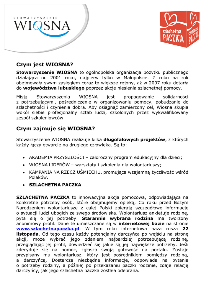 Czym jest WIOSNA? Stowarzyszenie WIOSNA to ogólnopolska organizacja pożytku publicznego działająca od 2001 roku, najpierw tylko w Małopolsce. Z roku na rok obejmowała swym zasięgiem coraz to większe rejony, aż w 2007 roku dotarła do województwa lubuskiego poprzez akcje niesienia szlachetnej pomocy. Misją Stowarzyszenia WIOSNA jest propagowanie solidarności z potrzebującymi, pośredniczenie w organizowaniu pomocy, pobudzanie do szlachetności i czynienia dobra. Aby osiągnąć zamierzony cel, Wiosna skupia wokół siebie profesjonalny sztab ludzi, szkolonych przez wykwalifikowany zespół szkoleniowców. Czym zajmuje się WIOSNA? Stowarzyszenie WIOSNA realizuje kilka długofalowych projektów, z których każdy łączy otwarcie na drugiego człowieka. Są to: AKADEMIA PRZYSZŁOŚCI – całoroczny program edukacyjny dla dzieci; WIOSNA LIDERÓW – warsztaty i szkolenia dla wolontariuszy; KAMPANIA NA RZECZ UŚMIECHU, promująca wzajemną życzliwość wśród Polaków. SZLACHETNA PACZKA SZLACHETNA PACZKA to innowacyjna akcja pomocowa, odpowiadająca na konkretne potrzeby osób, które obejmujemy opieką. Co roku przed Bożym Narodzeniem wolontariusze z całej Polski zbierają szczegółowe informacje o sytuacji ludzi ubogich ze swego środowiska. Wolontariusz ankietuje rodzinę, pyta się o jej potrzeby. Starannie wybrana rodzina ma tworzony anonimowy profil. Dane te umieszczane są w internetowej bazie na stronie www.szlachetnapaczka.pl. W tym roku internetowa baza rusza 22 listopada. Od tego czasu każdy potencjalny darczyńca po wejściu na stronę akcji, może wybrać jego zdaniem najbardziej potrzebującą rodzinę, przeglądając jej profil, dowiedzieć się jakie są jej największe potrzeby. Jeśli zdecyduje się na pomoc, zgłasza swoją gotowość na portalu. Zostaje przypisany mu wolontariusz, który jest pośrednikiem pomiędzy rodziną, a darczyńcą. Dostarcza niezbędne informacje, odpowiada na pytania o potrzeby rodziny, a później po przekazaniu paczki rodzinie, zdaje relację darczyńcy, jak jego szlachetna paczka została odebrana. Wszelki prace wolontariuszy nadzorowane są przez liderów sztabów, którzy na bieżąco monitorują postępy akcji, oraz wspierają swoich wolontariuszy. Dana rodzina może być tylko jeden raz wybrana z bazy. Przygotowanie paczki wymaga przemyślenia, czasu i energii, a przynosi ogromną radość obdarowywania. Darczyńcami PACZKI stają się nie tylko pojedyncze osoby ale i całe grupy: rodziny, uczniowie w klasach, pracownicy firm, grupa znajomych. Naszym celem jest przekazanie szlachetnej, wigilijnej pomocy 5 tysiącom ubogich rodzin w całej Polsce. Z czego aż do 450 rodzin w województwie lubuskim. Dlatego tworzymy 15 sztabów w województwie. Nieodłącznym elementem Szlachetnej Paczki są media. To dzięki nim zdobywamy wolontariuszy i darczyńców, czego finalnym efektem jest stworzenie konkretnej paczki konkretnej rodzinie. Przez cały okres trwania akcji ogromne wsparcie niesie prasa, telewizja, radio. Na każdym etapie akcji media monitorują i informują o postępach Szlachetnej Paczki. W ubiegłym roku naszą Szlachetną PACZKĘ tworzyła rekordowa liczba 2270 wolontariuszy oraz 53 086 darczyńców. Dzięki temu świąteczną pomoc o łącznej wartości 3,3 mln zł otrzymało 4826 rodzin z całej Polski. Już z poprzednich edycji „Paczki” wyłania się obraz ludzi dobrej woli, którzy z ogromnym zapałem angażują się w akcję. Są nimi wolontariusze, liderzy sponsorzy, darczyńcy, kierowcy, dziennikarze, patroni medialni oraz honorowi. Wszak szlachetność nie zna wieku, ani profesji. Po prostu się ją ma. Czasem trzeba ją jedynie obudzić. Więc dołącz do Paczki. Więcej informacji: Agata Izdebska Koordynator regionalny akcji SZLACHETNA PACZKA Stowarzyszenie WIOSNA tel. 696 891 112, e-mail: [email protected] Tomasz Szydło Lubuski Specjalista PR akcji SZLACHETNA PACZKA Stowarzyszenie WIOSNA tel. 781 047 331, e-mail: [email protected]