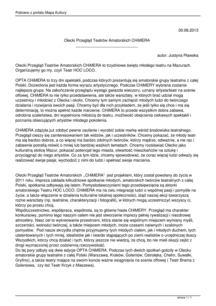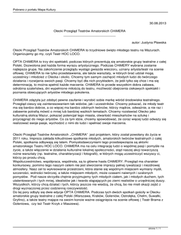 Pobrano z portalu Mapa Kultury 30.08.2013 Olecki Przegląd Teatrów Amatorskich CHiMERA ____________________________ autor: Justyna Pławska Olecki Przegląd Teatrów Amatorskich CHiMERA to trzydniowe święto młodego teatru na Mazurach. Organizujemy go my, czyli Teatr HOC LOCO. OPTA CHiMERA to trzy dni spektakli, podczas których prezentują się amatorskie grupy teatralne z całej Polski. Dozwolona jest każda forma wyrazu artystycznego. Podczas CHiMERY wybrana zostanie najlepsza grupa. Na zakończenie przeglądu wystąpi gwiazda wieczoru, uznany artysta/teatr na scenie offowej. CHiMERA to nie tylko przedstawienia, ale także warsztaty, w których brać udział mogą uczestnicy i młodzież z Olecka i okolic. Chcemy tym samym zachęcić młodych ludzi do twórczego działania i rozwijania swoich pasji. Chcemy być dla nich przykładem, że jeśli tylko się chce i ma się determinację, to można spełnić każde marzenie. CHiMERA to przede wszystkim dobra zabawa, odrobina szaleństwa, dni wypełnione miłością do teatru, możliwość obejrzenia ciekawych spektakli i poznania obiecujących artystów młodego pokolenia. CHiMERA zdążyła już zdobyć pewne zaufanie i wyrobić sobie markę wśród środowiska teatralnego. Przegląd cieszy się zainteresowaniem tak widzów, jak i uczestników. Chcemy pokazać, że młody teatr ma się bardzo dobrze, a co więcej ma bardzo zdolnych twórców, którzy mądrze, odważnie, a nie raz i zabawnie potrafią mówić o mniej lub bardziej ważkich tematach. Chcemy rozsławiać Olecko jako kulturalną stolicę Mazur, pokazać potencjał tego miasta, otwartość mieszkańców na sztukę i przyciągnąć do niego artystów. Co za tym idzie, chcemy spowodować, że coraz więcej ludzi odważy się realizować swoje pasje, wychodzić z nimi do ludzi i spełniać swoje marzenia. Olecki Przegląd Teatrów Amatorskich ,,CHiMERA” jest projektem, który został powołany do życia w 2011 roku. Impreza zakłada kilkudniowe spotkanie młodych, amatorskich twórców teatralnych z całej Polski, spotkania odbywają się latem. Pomysłodawczyniami tego przedsięwzięcia są aktorki amatorskiego Teatru HOC LOCO. CHiMERA ma na celu integrację ludzi o wspólnej pasji i pomyśle na życie, a także włączenie w działania kulturalne lokalnej społeczności, stąd naszej akcji towarzyszą rożne warsztaty (np. teatralne, charakteryzacji i fotografii), w których mogą uczestniczyć wszyscy ci, którzy po prostu chcą. Współuczestnictwo, współpraca, wspólnota, są to główne hasła CHiMERY. Przegląd ma charakter konkursowy, pomimo tego naszym celem nie jest stworzenie imprezy pełnej rywalizacji i niezdrowej atmosfery. Nasz cel to wykreowanie przestrzeni, która stanie się wspólnym miejscem wymiany myśli, szczerości, wolności twórczej, a także miejscem młodych, może czasami naiwnych i szalonych pomysłów. Pod nasze skrzydła chętnie przyjmujemy tych młodych ciałem, jak i młodych duchem, tych utalentowanych i tych mniej, idealistów jak i twardo stąpających po ziemi realistów o urzędniczej duszy. Wszystkich, którzy chcą działać i tych, którzy jeszcze nie wiedzą, że chcą, bo nie mieli okazji zejść z drogi wyznaczonej przez codzienną rzeczywistość. Do tej pory odbyły się dwie edycje OPTA CHiMERA. Podczas tych dwóch spotkań gościły w Olecku amatorskie grupy teatralne z całej Polski (Warszawa, Kraków, Goleniów, Ostrołęka, Chełm, Suwałki, Gryfino), a także teatry mające na swoim koncie ważne osiągnięcia na scenie offowej ( Teatr Brama z Goleniowa, czy też Teatr Krzyk z Maszewa). strona 1 / 1