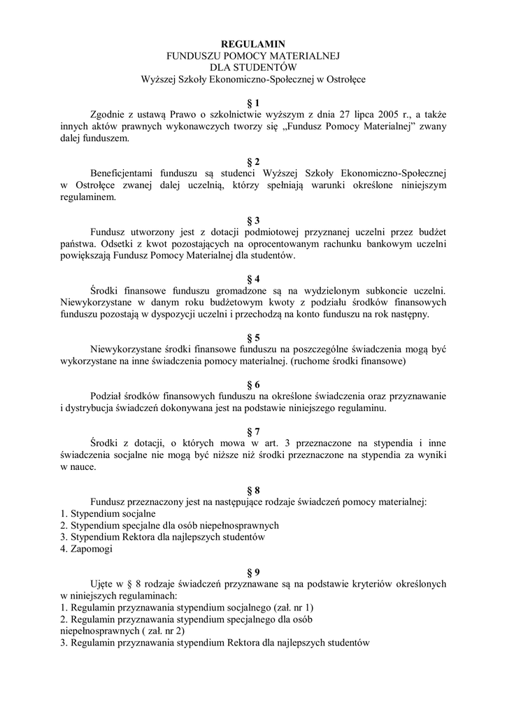 REGULAMIN FUNDUSZU POMOCY MATERIALNEJ DLA STUDENTÓW Wyższej Szkoły Ekonomiczno-Społecznej w Ostrołęce §1 Zgodnie z ustawą Prawo o szkolnictwie wyższym z dnia 27 lipca 2005 r., a także innych aktów prawnych wykonawczych tworzy się „Fundusz Pomocy Materialnej” zwany dalej funduszem. §2 Beneficjentami funduszu są studenci Wyższej Szkoły Ekonomiczno-Społecznej w Ostrołęce zwanej dalej uczelnią, którzy spełniają warunki określone niniejszym regulaminem. §3 Fundusz utworzony jest z dotacji podmiotowej przyznanej uczelni przez budżet państwa. Odsetki z kwot pozostających na oprocentowanym rachunku bankowym uczelni powiększają Fundusz Pomocy Materialnej dla studentów. §4 Środki finansowe funduszu gromadzone są na wydzielonym subkoncie uczelni. Niewykorzystane w danym roku budżetowym kwoty z podziału środków finansowych funduszu pozostają w dyspozycji uczelni i przechodzą na konto funduszu na rok następny. §5 Niewykorzystane środki finansowe funduszu na poszczególne świadczenia mogą być wykorzystane na inne świadczenia pomocy materialnej. (ruchome środki finansowe) §6 Podział środków finansowych funduszu na określone świadczenia oraz przyznawanie i dystrybucja świadczeń dokonywana jest na podstawie niniejszego regulaminu. §7 Środki z dotacji, o których mowa w art. 3 przeznaczone na stypendia i inne świadczenia socjalne nie mogą być niższe niż środki przeznaczone na stypendia za wyniki w nauce. §8 Fundusz przeznaczony jest na następujące rodzaje świadczeń pomocy materialnej: 1. Stypendium socjalne 2. Stypendium specjalne dla osób niepełnosprawnych 3. Stypendium Rektora dla najlepszych studentów 4. Zapomogi §9 Ujęte w § 8 rodzaje świadczeń przyznawane są na podstawie kryteriów określonych w niniejszych regulaminach: 1. Regulamin przyznawania stypendium socjalnego (zał. nr 1) 2. Regulamin przyznawania stypendium specjalnego dla osób niepełnosprawnych ( zał. nr 2) 3. Regulamin przyznawania stypendium Rektora dla najlepszych studentów (zał. nr 3) 4. Regulamin przyznawania zapomogi (zał. nr 4) 5. Regulaminy ujęte w ust. 1,2,3,4, są integralnymi częściami składowymi niniejszego regulaminu. § 10 Stypendia, o których mowa w § 8 ust. 1,2,3,4 przyznawane są na wniosek studenta przez komisję stypendialną. § 11 Po uzyskaniu pozytywnej opinii senatu i kanclerza uczelni rektor w porozumieniu z uczelnianym organem samorządu studenckiego, podejmuje decyzję o podziale dotacji na rodzaje świadczeń określonych w § 8 ust. 1,2,3,4 a także ustala regulamin Funduszu Pomocy Materialnej w tym szczegółowe zasady ustalania wysokości, przyznawania i wypłacania świadczeń pomocy materialnej dla studentów, a także szczegółowe kryteria i tryb udzielania świadczeń pomocy materialnej dla studentów, wzór wniosku o przyznanie świadczeń pomocy materialnej oraz sposób udokumentowania sytuacji materialnej. § 12 Świadczenia określone w § 8 ust. 1,2,3,4 przyznaje komisja stypendialna powołana na wniosek Uczelnianej Rady Samorządu Studenckiego przez rektora, który sprawuje nad nią nadzór oraz może uchylić jej decyzje niezgodne z ustawą lub regulaminem. W skład komisji wchodzi 7 osób w tym 4 studentów uczelni delegowanych przez Uczelnianą Radę Samorządu Studenckiego oraz 3 pracowników wskazanych przez rektora. O decyzji komisji informuje wnioskodawcę na piśmie jej przewodniczący lub z-ca przewodniczącego ciągu 7 dni od dnia jej podjęcia. § 13 Od decyzji Komisji Stypendialnej studentowi przysługuje odwołanie do Odwoławczej Komisji Stypendialnej. Odwołanie powinno nastąpić w ciągu 14 dni od daty otrzymania decyzji. § 14 Stypendia, o których mowa w § 8 ust. 1,2,3 przyznawane są na semestr, a stypendium ujęte w § 8 ust.6 na bieżący rok akademicki. Świadczenia powyższe student może otrzymać w danym roku akademickim przez okres 10 m-cy, wypłacane co miesiąc z wyjątkiem zapomogi, która jest świadczeniem jednorazowym. § 15 Odwoławczą Komisję Stypendialną powołuje na wniosek Uczelnianej Rady Samorządu Studenckiego rektor i sprawuje nad nią nadzór. Może też uchylić jej decyzje podjęte niezgodnie z ustawą lub niniejszym regulaminem. W skład Odwoławczej Komisji Stypendialnej wchodzi 5 osób w tym 3 studentów uczelni wskazanych przez Uczelnianą Radę Samorządu Studenckiego i 2 pracowników wskazanych przez rektora. Komisja rozpatruje odwołania w ciągu 14 dni od daty wpłynięcia wniosku. O decyzji Komisji powiadamia wnioskodawcę na piśmie jej przewodniczący lub z-ca przewodniczącego. § 16 Od decyzji Odwoławczej Komisji Stypendialnej studentowi przysługuje prawo odwołania do właściwego wojewódzkiego sądu administracyjnego. § 17 Sytuacje nietypowe studentów, których nie da się jednoznacznie przyporządkować do istniejących przepisów prawnych interpretują organy uczelni wymienione w niniejszym regulaminie, odpowiedzialne za proces przyznawania stypendium. § 18 Komisja Stypendialna ma prawo cofnąć przyznane świadczenia w ramach pomocy materialnej w przypadku gdy student został skreślony z listy studentów lub nie podejmie przyznanych świadczeń wymienionych w § 8 niniejszego regulaminu do końca roku akademickiego, w którym świadczenie zostało przyznane. Niewykorzystane środki pozostają na koncie funduszu. § 19 Do decyzji podjętych w indywidualnych sprawach studenckich mają zastosowanie przepisy Kodeksu Postępowania Administracyjnego oraz przepisy o zaskarżaniu decyzji do sądu administracyjnego. § 20 Student studiujący równocześnie na kilku kierunkach studiów może otrzymać stypendium socjalne, stypendium specjalne dla osób niepełnosprawnych, stypendium Rektora dla najlepszych studentów, zapomogi tylko na jednej uczelni i jednym z kierunku. § 21 Student może otrzymać jednocześnie kilka świadczeń pomocy materialnej np. stypendium socjalne razem ze stypendium za wyniki w nauce lub sporcie i stypendium specjal