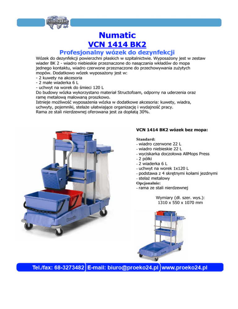 Numatic VCN 1414 BK2 Profesjonalny wózek do dezynfekcji Wózek do dezynfekcji powierzchni płaskich w szpitalnictwie. Wyposażony jest w zestaw wiader BK 2 - wiadro niebieskie przeznaczone do nasączania wkładów do mopa jednego kontaktu, wiadro czerwone przeznaczone do przechowywania zużytych mopów. Dodatkowo wózek wyposażony jest w: - 2 kuwety na akcesoria - 2 małe wiaderka 6 L - uchwyt na worek do śmieci 120 L Do budowy wózka wykorzystano materiał Structofoam, odporny na uderzenia oraz ramę metalową malowaną proszkowo. Istnieje możliwość wyposażenia wózka w dodatkowe akcesoria: kuwety, wiadra, uchwyty, pojemniki, stelaże ułatwiające organizację i wydajność pracy. Rama ze stali nierdzewnej oferowana jest za dopłatą 30%. VCN 1414 BK2 wózek bez mopa: Standard: - wiadro czerwone 22 L - wiadro niebieskie 22 L - wyciskarka doczołowa AllMops Press - 2 półki - 2 wiaderka 6 L - uchwyt na worek 1x120 L - podstawa z 4 skrętnymi kołami jezdnymi - stelaż metalowy Opcjonalnie: - rama ze stali nierdzewnej Wymiary (dł. szer. wys.): 1310 x 550 x 1070 mm -