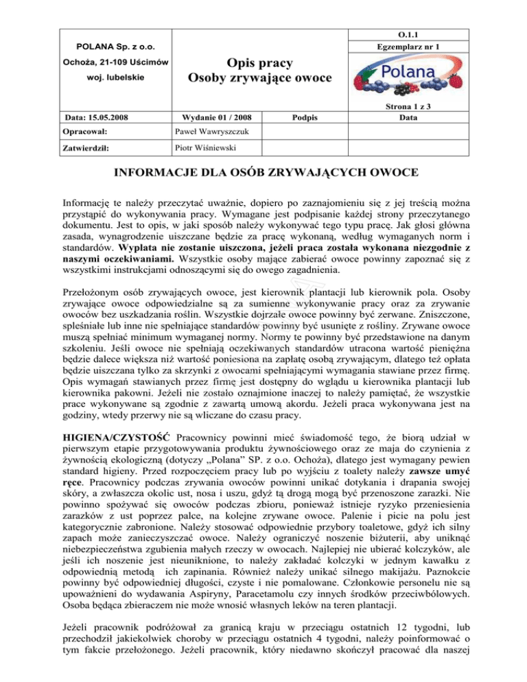 O.1.1 Egzemplarz nr 1 POLANA Sp. z o.o. OchoŜa, 21-109 Uścimów woj. lubelskie Data: 15.05.2008 Opis pracy Osoby zrywające owoce Wydanie 01 / 2008 Opracował: Paweł Wawryszczuk Zatwierdził: Piotr Wiśniewski Podpis Strona 1 z 3 Data INFORMACJE DLA OSÓB ZRYWAJĄCYCH OWOCE Informację te naleŜy przeczytać uwaŜnie, dopiero po zaznajomieniu się z jej treścią moŜna przystąpić do wykonywania pracy. Wymagane jest podpisanie kaŜdej strony przeczytanego dokumentu. Jest to opis, w jaki sposób naleŜy wykonywać tego typu pracę. Jak głosi główna zasada, wynagrodzenie uiszczane będzie za pracę wykonaną, według wymaganych norm i standardów. Wyplata nie zostanie uiszczona, jeŜeli praca została wykonana niezgodnie z naszymi oczekiwaniami. Wszystkie osoby mające zabierać owoce powinny zapoznać się z wszystkimi instrukcjami odnoszącymi się do owego zagadnienia. PrzełoŜonym osób zrywających owoce, jest kierownik plantacji lub kierownik pola. Osoby zrywające owoce odpowiedzialne są za sumienne wykonywanie pracy oraz za zrywanie owoców bez uszkadzania roślin. Wszystkie dojrzałe owoce powinny być zerwane. Zniszczone, spleśniałe lub inne nie spełniające standardów powinny być usunięte z rośliny. Zrywane owoce muszą spełniać minimum wymaganej normy. Normy te powinny być przedstawione na danym szkoleniu. Jeśli owoce nie spełniają oczekiwanych standardów utracona wartość pienięŜna będzie dalece większa niŜ wartość poniesiona na zapłatę osobą zrywającym, dlatego teŜ opłata będzie uiszczana tylko za skrzynki z owocami spełniającymi wymagania stawiane przez firmę. Opis wymagań stawianych przez firmę jest dostępny do wglądu u kierownika plantacji lub kierownika pakowni. JeŜeli nie zostało oznajmione inaczej to naleŜy pamiętać, Ŝe wszystkie prace wykonywane są zgodnie z zawartą umową akordu. JeŜeli praca wykonywana jest na godziny, wtedy przerwy nie są wliczane do czasu pracy. HIGIENA/CZYSTOŚĆ Pracownicy powinni mieć świadomość tego, Ŝe biorą udział w pierwszym etapie przygotowywania produktu Ŝywnościowego oraz ze maja do czynienia z Ŝywnością ekologiczną (dotyczy „Polana” SP. z o.o. OchoŜa), dlatego jest wymagany pewien standard higieny. Przed rozpoczęciem pracy lub po wyjściu z toalety naleŜy zawsze umyć ręce. Pracownicy podczas zrywania owoców powinni unikać dotykania i drapania swojej skóry, a zwłaszcza okolic ust, nosa i uszu, gdyŜ tą drogą mogą być przenoszone zarazki. Nie powinno spoŜywać się owoców podczas zbioru, poniewaŜ istnieje ryzyko przeniesienia zarazków z ust poprzez palce, na kolejne zrywane owoce. Palenie i picie na polu jest kategorycznie zabronione. NaleŜy stosować odpowiednie przybory toaletowe, gdyŜ ich silny zapach moŜe zanieczyszczać owoce. NaleŜy ograniczyć noszenie biŜuterii, aby uniknąć niebezpieczeństwa zgubienia małych rzeczy w owocach. Najlepiej nie ubierać kolczyków, ale jeśli ich noszenie jest nieuniknione, to naleŜy zakładać kolczyki w jednym kawałku z odpowiednią metodą ich zapinania. RównieŜ naleŜy unikać silnego makijaŜu. Paznokcie powinny być odpowiedniej długości, czyste i nie pomalowane. Członkowie personelu nie są upowaŜnieni do wydawania Aspiryny, Paracetamolu czy innych środków przeciwbólowych. Osoba będąca zbieraczem nie moŜe wnosić własnych leków na teren plantacji. JeŜeli pracownik podróŜował za granicą kraju w przeciągu ostatnich 12 tygodni, lub przechodził jakiekolwiek choroby w przeciągu ostatnich 4 tygodni, naleŜy poinformować o tym fakcie przełoŜonego. JeŜeli pracownik, który niedawno skończył pracować dla naszej O.1.1 Egzemplarz nr 1 POLANA Sp. z o.o. OchoŜa, 21-109 Uścimów woj. lubelskie Data: 15.05.2008 Opis pracy Osoby zrywające owoce Wydanie 01 / 2008 Opracował: Paweł Wawryszczuk Zatwierdził: Piotr Wiśniewski Podpis Strona 2 z 3 Data firmy, zachoruje jest proszony o udzielenie nam na ten temat jakiejkolwiek informacji, gdyŜ naleŜy brać pod uwagę długi okres inkubacji choroby. KaŜdy wypadek musi być zgłoszony do któregoś z członków personelu i musi to zostać odnotowane w księdze wypadków, która znajduje się w biurze. Pracownik jest zobowiązany do sprawdzenia, czy opakowania, których uŜywa są czyste. Nigdy nie moŜna uŜywać brudnych opakowań. JeŜeli nie ma czystych opakowań lub skrzynek naleŜy poinformować o tym przełoŜonego. TO PRACOWNIK PONOSI ODPOWIEDZIALNOŚĆ ZA SPRAWDZENIE CZY ILOŚĆ ZEBRANYCH PRZEZ NIEGO OWOCÓW ZOSTAŁA ZAPISANA POPRAWNIE. DOCHODZENIE ILOŚCI ZEBRANYCH OWOCÓW NIE MOśE BYĆ PRZEPROWADZONE PO KILKU DNIACH. Na koniec kaŜdego dnia naleŜy sprawdzić liczbę zebranych skrzynek w stosunku do zapisanej liczby skrzynek. JeŜeli zakończył się zbiór na danym polu NIGDY nie moŜna przejść samowolnie na nowe pole. MoŜna to uczynić dopiero po zezwoleniu udzielonym przez przełoŜonego. OGÓLNE: 1) Nie wolno jeść, pić i palić podczas zbioru i pakowania owoców. MoŜna to robić tylko w specjalnie wyznaczonych do tego celu miejscach. Wszyscy wizytujący muszą udać się najpierw do biura. Zwierzęta nie mogą znajdować się w Ŝadnym miejscu farmy. Dzieci nie mogą znajdować się w miejscu gdzie pakuje się owoce, w chłodni lub w magazynie, ze względu na higienę. śadne napoje i Ŝadna Ŝywność nie moŜe znajdować się w chłodni. Napoje i Ŝywność znalezione w chłodni zostaną usunięte i zniszczone, bez Ŝadnego ostrzeŜenia. Do tych przepisów naleŜy się zawsze dostosowywać, aby mieć pewność, Ŝe pracownicy mogą szybko i sprawnie pracować, bez Ŝadnych zakłóceń oraz, Ŝe owoce są zrywane i pakowane w higienicznie czystym środowisku. 2) Ogólne bezpieczeństwo: NaleŜy uwaŜać na traktory, wózki widłowe oraz roŜnego rodzaju maszyny znajdujące się na placu firmy jak i na samej plantacji. JeŜeli są stosowane pestycydy (wzmianka nie dotyczy ekologicznej plantacji w OchoŜy poniewaŜ