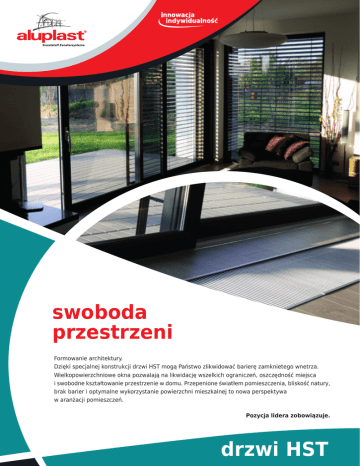swoboda przestrzeni Formowanie architektury. Dzięki specjalnej konstrukcji drzwi HST mogą Państwo zlikwidować barierę zamknietego wnetrza. Wielkopowierzchniowe okna pozwalają na likwidację wszelkich ograniczeń, oszczędność miejsca i swobodne kształtowanie przestrzenie w domu. Przepenione światłem pomieszczenia, bliskość natury, brak barier i optymalne wykorzystanie powierzchni mieszkalnej to nowa perspektywa w aranżacji pomieszczeń. Pozycja lidera zobowiązuje. drzwi HST drzwi HST System drzwi unoszono-przesuwnych HST to idealne rozwiązanie optymalnego wykorzystania powierzchni w obrębie wyjść tarasowych lub ogrodowych. Specjalna konstrukcja systemu umożliwia budowę drzwi tarasowych o bardzo dużych przeszkleniach. Szerokość skrzydła może mieć wymiar od 800 mm do 3000 mm szerokości i wysokość do 2500 mm w białym kolorze, a specjalne mechanizmy okuciowe pozwalają na przesuwanie ogromnych skrzydeł przy użyciu minimalnej siły. Drzwi balkonowe typu HST mogą występować w co najmniej w kilku różnych wersjach i układach skrzydeł oraz części nieotwieranych. Rozwiązanie nowoczesne i bezpieczne, tworzone z myślą o likwidacji wszechobecnych barier architektonicznych dzięki zastosowaniu „niskiego progu”. Podział konstrukcji progu na część zewnętrzną wykonaną z aluminium i część zewnętrzną wykonaną z PVC pozwala natomiast na uniknięcie występowania mostków termicznych. Przepełnione światłem pomieszczenia, bliskość natury, brak barier i optymalne wykorzystanie powierzchni mieszkalnej to nowa perspektywa w aranżacji pomieszczeń. aluplast Sp. z o.o. ul. Gołężycka 25A, 61-357 Poznań tel. 61 654 34 00, fax 61 654 34 99, [email protected], www.aluplast.com.pl