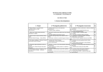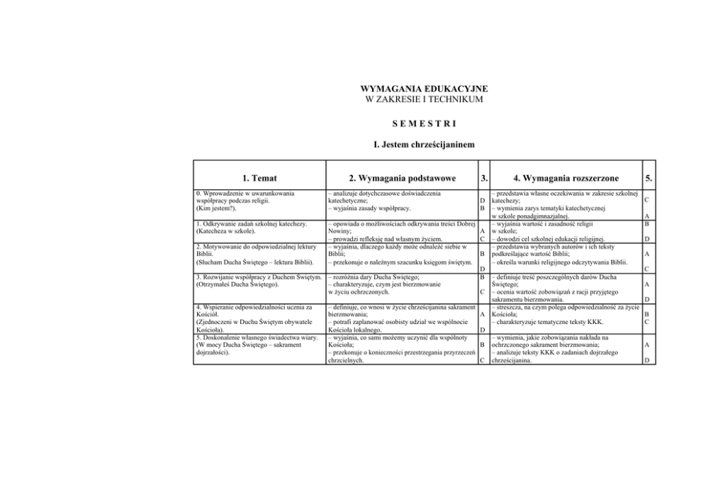 WYMAGANIA EDUKACYJNE W ZAKRESIE I TECHNIKUM SEMESTRI I. Jestem chrześcijaninem 1. Temat 0. Wprowadzenie w uwarunkowania współpracy podczas religii. (Kim jestem?). 2. Wymagania podstawowe – analizuje dotychczasowe doświadczenia katechetyczne; – wyjaśnia zasady współpracy. 3. D B 1. Odkrywanie zadań szkolnej katechezy. (Katecheza w szkole). – opowiada o możliwościach odkrywania treści Dobrej Nowiny; A – prowadzi refleksję nad własnym życiem. C 2. Motywowanie do odpowiedzialnej lektury – wyjaśnia, dlaczego każdy może odnaleźć siebie w Biblii. Biblii; B (Słucham Ducha Świętego – lektura Biblii). – przekonuje o należnym szacunku księgom świętym. D 3. Rozwijanie współpracy z Duchem Świętym. – rozróżnia dary Ducha Świętego; B (Otrzymałeś Ducha Świętego). – charakteryzuje, czym jest bierzmowanie w życiu ochrzczonych. C 4. Wspieranie odpowiedzialności ucznia za Kościół. (Zjednoczeni w Duchu Świętym obywatele Kościoła). 5. Doskonalenie własnego świadectwa wiary. (W mocy Ducha Świętego – sakrament dojrzałości). – definiuje, co wnosi w życie chrześcijanina sakrament bierzmowania; – potrafi zaplanować osobisty udział we wspólnocie Kościoła lokalnego. – wyjaśnia, co sami możemy uczynić dla wspólnoty Kościoła; – przekonuje o konieczności przestrzegania przyrzeczeń chrzcielnych. A 4. Wymagania rozszerzone – przedstawia własne oczekiwania w zakresie szkolnej katechezy; – wymienia zarys tematyki katechetycznej w szkole ponadgimnazjalnej. – wyjaśnia wartość i zasadność religii w szkole; – dowodzi cel szkolnej edukacji religijnej. – przedstawia wybranych autorów i ich teksty podkreślające wartość Biblii; – określa warunki religijnego odczytywania Biblii. 5. C A B D A C – definiuje treść poszczególnych darów Ducha Świętego; – ocenia wartość zobowiązań z racji przyjętego sakramentu bierzmowania. – streszcza, na czym polega odpowiedzialność za życie Kościoła; – charakteryzuje tematyczne teksty KKK. A D B C D B C – wymienia, jakie zobowiązania nakłada na ochrzczonego sakrament bierzmowania; – analizuje teksty KKK o zadaniach dojrzałego chrześcijanina. A D 6. Wspomaganie realizacji chrześcijańskich zadań. (Liturgia sakramentu bierzmowania). – wymienia obrzędy sakramentu bierzmowania. – uczestniczy w realizacji chrześcijańskich zadań. A – opisuje znaczenie poszczególnych obrzędów w sakramencie bierzmowania; – prowadzi refleksję nad własnym życiem. B C D II. Taka jest nasza wiara 7. Rozpoznawanie prawdy. (Poszukiwanie prawdy). 8. Odkrywanie istoty wiary. (Istota wiary). 9. Dostrzeganie współzależności wiary i rozumu. (Zrozum, abyś uwierzył; uwierz, abyś zrozumiał). 10. Rozeznawanie dróg poznania Boga. (Drogi poznania Boga). 11. Wspomaganie wiary słowu Boga. (Wierzę słowu Bożemu). 12. Odkrywanie Jezusa w pełni Jego Objawienia. (Jezus Chrystus szczytem Objawienia). – analizuje, co znaczy odkrywać prawdę, głosić ją, być – interpretuje, dlaczego Papież wzywa młodych do jej wiernym; D poszukiwania Prawdy, którą jest Jezus; – definiuje, czym jest prawda. A – przedstawia fundamentalne wyjaśnienia w Fides et ratio. – określa, czym jest wiara; C – wymienia, jakie znaczenie posiada wiara – opisuje, czego wymaga od człowieka wiara. B w codziennym życiu; – uzasadnia własne odniesienie do wiary. – streszcza zakresy wchodzące w sferę poznania rozumu i – identyfikuje pojęcia: agnostycyzm, ateizm, fideizm, tradycjonalizm, racjonalizm, ontologizm; wiary; – uzasadnia brak sprzeczności pomiędzy wiarą i A – określa wzajemne kompetencje rozumu rozumem. i wiary jako dziedzin poznania. D – formuje, czym jest droga poznania Boga; A – interpretuje, dlaczego człowiek jest drogą poznania – przekonuje, dlaczego Boga można poznać na Boga; podstawie rzeczy stworzonych. C – przyjmuje odpowiedzialność za rozpoznawanie dróg poznania Boga. – wyjaśnia, dlaczego człowiek powinien odpowiedzieć – wymienia kolejne etapy dialogu Boga na inicjatywę Boga; B z człowiekiem; – analizuje, w jaki sposób człowiek powinien – charakteryzuje, na czym polega postawa dialogu Boga i odpowiedzieć na usłyszane słowo Boga. D człowieka. – opowiada treść Prologu św. Jana; – przekonuje, na czym polega pełne objawienie w Jezusie. A – opisuje, jakie trudności spotykane są w procesie uznania Jezusa jako Boga; C – potrafi dowieść, że Jezus jest szczytem Objawienia. – ilustruje termin Opatrzność Boga; – dowodzi integralność trudnego doświadczenia i Opatrzności Bożej. B – formuje, jak powinna wyglądać odpowiedź człowieka na miłość Boga; D – przekonuje, że Opatrzność Boża jest doświadczana w historii zbawienia. C B A D B C B D A C B D 13. Wspomaganie wiary w Bożą Opatrzność. (Opatrzność Boża). A C III. „Oto Ja jestem z wami...” 14. Rozpoznawanie natury Kościoła Jezusa Chrystusa. (Kościół Jezusa Chrystusa). – przedstawia naturę Kościoła; – stwierdza, dlaczego Kościół nieustannie potrzebuje oczyszczenia. 15. Odkrywanie zasadności funkcjonowania Kościoła. (Po co Kościół?). – potrafi podać uzasadniające argumenty na pytanie, „po co Kościół”; – streszcza przynajmniej trzy cele istnienia Kościoła. A C D B 16. Rozpoznawanie obecności Jezusa Chrystusa – wylicza oczekiwania Jezusa wobec swoich uczniów; w Kościele. – objaśnia formy, w jakich współcześni chrześcijanie A (Jezus Chrystus obecny w Kościele). głoszą Ewangelię. C 17. Konstruktywne odkrywanie treści Pisma Świętego. (Pismo Święte Księgą Kościoła). – rozróżnia kryteria czytania i interpretowania treści Biblii; – dowodzi, co znaczy interpretować Biblię w świetle tradycji Kościoła. B D 18. Rozeznawanie wartości objawień prywatnych. (Objawienia prywatne). – charakteryzuje, czym są objawienia prywatne; – wymienia wybrane objawienia prywatne 