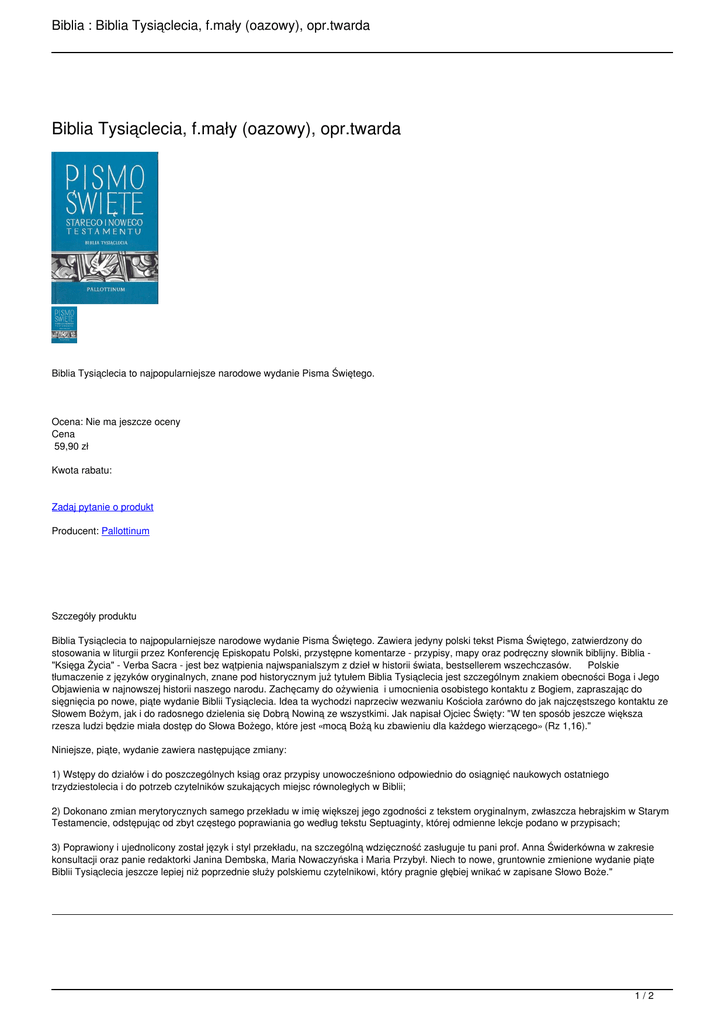 Biblia : Biblia Tysiąclecia, f.mały (oazowy), opr.twarda Biblia Tysiąclecia, f.mały (oazowy), opr.twarda Biblia Tysiąclecia to najpopularniejsze narodowe wydanie Pisma Świętego. Ocena: Nie ma jeszcze oceny Cena 59,90 zł Kwota rabatu: Zadaj pytanie o produkt Producent: Pallottinum Szczegóły produktu Biblia Tysiąclecia to najpopularniejsze narodowe wydanie Pisma Świętego. Zawiera jedyny polski tekst Pisma Świętego, zatwierdzony do stosowania w liturgii przez Konferencję Episkopatu Polski, przystępne komentarze - przypisy, mapy oraz podręczny słownik biblijny. Biblia "Księga Życia" - Verba Sacra - jest bez wątpienia najwspanialszym z dzieł w historii świata, bestsellerem wszechczasów. Polskie tłumaczenie z języków oryginalnych, znane pod historycznym już tytułem Biblia Tysiąclecia jest szczególnym znakiem obecności Boga i Jego Objawienia w najnowszej historii naszego narodu. Zachęcamy do ożywienia i umocnienia osobistego kontaktu z Bogiem, zapraszając do sięgnięcia po nowe, piąte wydanie Biblii Tysiąclecia. Idea ta wychodzi naprzeciw wezwaniu Kościoła zarówno do jak najczęstszego kontaktu ze Słowem Bożym, jak i do radosnego dzielenia się Dobrą Nowiną ze wszystkimi. Jak napisał Ojciec Święty: "W ten sposób jeszcze większa rzesza ludzi będzie miała dostęp do Słowa Bożego, które jest «mocą Bożą ku zbawieniu dla każdego wierzącego» (Rz 1,16)." Niniejsze, piąte, wydanie zawiera następujące zmiany: 1) Wstępy do działów i do poszczególnych ksiąg oraz przypisy unowocześniono odpowiednio do osiągnięć naukowych ostatniego trzydziestolecia i do potrzeb czytelników szukających miejsc równoległych w Biblii; 2) Dokonano zmian merytorycznych samego przekładu w imię większej jego zgodności z tekstem oryginalnym, zwłaszcza hebrajskim w Starym Testamencie, odstępując od zbyt częstego poprawiania go według tekstu Septuaginty, której odmienne lekcje podano w przypisach; 3) Poprawiony i ujednolicony został język i styl przekładu, na szczególną wdzięczność zasługuje tu pani prof. Anna Świderkówna w zakresie konsultacji oraz panie redaktorki Janina Dembska, Maria Nowaczyńska i Maria Przybył. Niech to nowe, gruntownie zmienione wydanie piąte Biblii Tysiąclecia jeszcze lepiej niż poprzednie służy polskiemu czytelnikowi, który pragnie głębiej wnikać w zapisane Słowo Boże." 1/2 Biblia : Biblia Tysiąclecia, f.mały (oazowy), opr.twarda Opinie Nikt jeszcze nie oceniał tego produktu. 2/2 Powered by TCPDF (www.tcpdf.org)