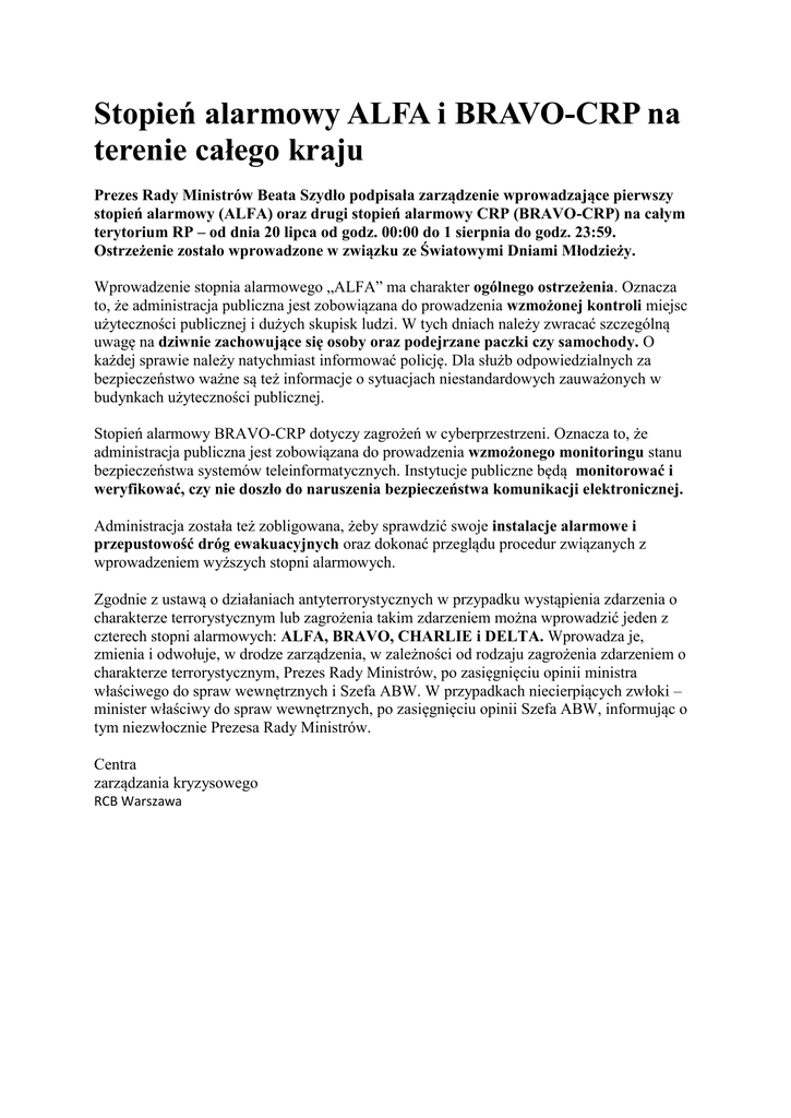 Stopień alarmowy ALFA i BRAVO-CRP na terenie całego kraju Prezes Rady Ministrów Beata Szydło podpisała zarządzenie wprowadzające pierwszy stopień alarmowy (ALFA) oraz drugi stopień alarmowy CRP (BRAVO-CRP) na całym terytorium RP – od dnia 20 lipca od godz. 00:00 do 1 sierpnia do godz. 23:59. Ostrzeżenie zostało wprowadzone w związku ze Światowymi Dniami Młodzieży. Wprowadzenie stopnia alarmowego „ALFA” ma charakter ogólnego ostrzeżenia. Oznacza to, że administracja publiczna jest zobowiązana do prowadzenia wzmożonej kontroli miejsc użyteczności publicznej i dużych skupisk ludzi. W tych dniach należy zwracać szczególną uwagę na dziwnie zachowujące się osoby oraz podejrzane paczki czy samochody. O każdej sprawie należy natychmiast informować policję. Dla służb odpowiedzialnych za bezpieczeństwo ważne są też informacje o sytuacjach niestandardowych zauważonych w budynkach użyteczności publicznej. Stopień alarmowy BRAVO-CRP dotyczy zagrożeń w cyberprzestrzeni. Oznacza to, że administracja publiczna jest zobowiązana do prowadzenia wzmożonego monitoringu stanu bezpieczeństwa systemów teleinformatycznych. Instytucje publiczne będą monitorować i weryfikować, czy nie doszło do naruszenia bezpieczeństwa komunikacji elektronicznej. Administracja została też zobligowana, żeby sprawdzić swoje instalacje alarmowe i przepustowość dróg ewakuacyjnych oraz dokonać przeglądu procedur związanych z wprowadzeniem wyższych stopni alarmowych. Zgodnie z ustawą o działaniach antyterrorystycznych w przypadku wystąpienia zdarzenia o charakterze terrorystycznym lub zagrożenia takim zdarzeniem można wprowadzić jeden z czterech stopni alarmowych: ALFA, BRAVO, CHARLIE i DELTA. Wprowadza je, zmienia i odwołuje, w drodze zarządzenia, w zależności od rodzaju zagrożenia zdarzeniem o charakterze terrorystycznym, Prezes Rady Ministrów, po zasięgnięciu opinii ministra właściwego do spraw wewnętrznych i Szefa ABW. W przypadkach niecierpiących zwłoki – minister właściwy do spraw wewnętrznych, po zasięgnięciu opinii Szefa ABW, informując o tym niezwłocznie Prezesa Rady Ministrów. Centra zarządzania kryzysowego RCB Warszawa