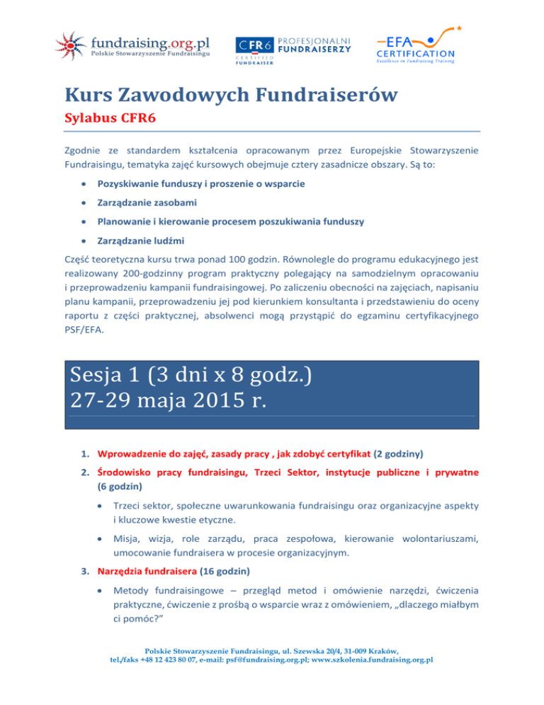 Kurs Zawodowych Fundraiserów Sylabus CFR6 Zgodnie ze standardem kształcenia opracowanym przez Europejskie Stowarzyszenie Fundraisingu, tematyka zajęć kursowych obejmuje cztery zasadnicze obszary. Są to: Pozyskiwanie funduszy i proszenie o wsparcie Zarządzanie zasobami Planowanie i kierowanie procesem poszukiwania funduszy Zarządzanie ludźmi Część teoretyczna kursu trwa ponad 100 godzin. Równolegle do programu edukacyjnego jest realizowany 200-godzinny program praktyczny polegający na samodzielnym opracowaniu i przeprowadzeniu kampanii fundraisingowej. Po zaliczeniu obecności na zajęciach, napisaniu planu kampanii, przeprowadzeniu jej pod kierunkiem konsultanta i przedstawieniu do oceny raportu z części praktycznej, absolwenci mogą przystąpić do egzaminu certyfikacyjnego PSF/EFA. Sesja 1 (3 dni x 8 godz.) 27-29 maja 2015 r. 1. Wprowadzenie do zajęć, zasady pracy , jak zdobyć certyfikat (2 godziny) 2. Środowisko pracy fundraisingu, Trzeci Sektor, instytucje publiczne i prywatne (6 godzin) Trzeci sektor, społeczne uwarunkowania fundraisingu oraz organizacyjne aspekty i kluczowe kwestie etyczne. Misja, wizja, role zarządu, praca zespołowa, kierowanie wolontariuszami, umocowanie fundraisera w procesie organizacyjnym. 3. Narzędzia fundraisera (16 godzin) Metody fundraisingowe – przegląd metod i omówienie narzędzi, ćwiczenia praktyczne, ćwiczenie z prośbą o wsparcie wraz z omówieniem, „dlaczego miałbym ci pomóc?” Polskie Stowarzyszenie Fundraisingu, ul. Szewska 20/4, 31-009 Kraków, tel./faks +48 12 423 80 07, e-mail: [email protected]; www.szkolenia.fundraising.org.pl Kampanie fundraisingowe – przykłady krajowe i zagraniczne. Sponsoring, czyli budowanie relacji opartych na wymianie, sprzedaż. Praca nad relacjami – ćwiczenia „przychodzi fundraiser do prezesa firmy”. Planowanie kampanii fundraisingowych i zastosowanie narzędzi w praktyce własnej organizacji. Zasady organizacji kampanii fundraisingowej w kontekście kursu CFR 6. Sesja 2 (3 dni x 8 godz.) 23-25 czerwca 2015 r. 4. Wizerunek i relacje publiczne, komunikacja (6 godzin) Zasady komunikacji interpersonalnej, kanały komunikacji w fundraisingu, środki komunikacji. Wykorzystanie mediów, poruszanie się w świecie mediów, tworzenie wizerunku. Zasady prowadzenia prezentacji, zarządzanie relacjami. 5. Doświadczenia – wprowadzenie do zajęć praktycznych (2 godziny) Twarzą w twarz – bezpośrednie relacje z darczyńcami, prośba o wsparcie. Refleksja nad sobą źródłem motywacji – czy potrafię prosić dla innych. Bariery „prośby na ulicy”, siła reprezentanta potrzebujących. 6. Strategia i planowanie strategiczne (8 godzin) Zarządzanie zasobami, wprowadzanie fundraisingu w zarządzaniu organizacją. Strategiczne planowanie fundraisingu. Segmentacja darczyńców. Elementy analizy organizacji, wyznaczanie celów w dalekiej i bliskiej perspektywie. 7. Kampanie – przygotowanie, przeprowadzenie i rozliczenie. Plan działań (6 godzin) Planowanie budżetu, zarządzanie projektami. Tworzenie kampanii krok po kroku, kryteria oceny, wykorzystanie informacji zwrotnej do pracy w trakcie kampanii i po niej oraz przy planowaniu kolejnych działań. Polskie Stowarzyszenie Fundraisingu, ul. Szewska 20/4, 31-009 Kraków, tel./faks +48 12 423 80 07, e-mail: [email protected]; www.szkolenia.fundraising.org.pl Wykorzystanie badań zewnętrznych do projektowania kampanii. 8. Bazy danych i informacje rynkowe w pracy fundraisera (2 godziny) Baza informacji, tworzenie i utrzymywanie bazy danych, badanie rynku, techniki oceny rynku darczyńcy. Sesja 3 (3 dni x 8 godz.) 2-4 wrzesnia 2015 r. 9. Granty i dotacje w fundraisingu (4 godziny) Wykorzystanie dotacji i grantów w fundraisingu. Wykorzystanie dotacji lokalnych i krajowych. Sięganie po środki europejskie, posługiwanie się zaawansowanymi metodami grantowymi, współpraca z granto-pisarzami. 10. Komunikacja w kontekście relacji – negocjacje (4 godziny) Dlaczego ludzie wspierają innych. Psychologia komunikacji. Negocjacje. Kreatywność, motywacja do samodzielnych poszukiwań i szkoleń, wskazanie literatury do samodzielnego rozwoju 11. Zrządzanie zespołem fundraiserów i kontrola wyników, planowanie strategiczne (4 godziny) Wprowadzenie fundraisingu w organizacji Dział FR lub Dział Rozwoju – jak to działa. Podział obowiązków i odpowiedzialności. Zasada informacji zwrotnej w procesie poszukiwania funduszy. Kontrola jakości. Obliczanie kosztów w fundraisingu. Kierowanie działem FR. Wolontariusze a pracownicy. Polskie Stowarzyszenie Fundraisingu, ul. Szewska 20/4, 31-009 Kraków, tel./faks +48 12 423 80 07, e-mail: [email protected]; www.szkolenia.fundraising.org.pl Odpowiedzialność fundraisera, planowanie i rozliczanie pracy. 12. Doświadczenia fundraisera – narzędzia pracy, motywowanie (2 godziny) Praca z darczyńcami, zarządzanie bazą danych darczyńców. Wielkie datki i spadki. Planowanie/ocena kampanii i przygotowanie raportu certyfikacyjnego – doświadczenia absolwentów poprzednich kursów. 13. Zarządzanie procesami w fundraisingu (2 godziny) Planowanie strategiczne, wykorzystanie informacji z baz danych. Zarządzanie relacjami. Firmy i współpraca z wielkimi donatorami, sponsoring, narzędzia specjalne. 14. Zasady rozliczania funduszy – współpraca dla sukcesu, tajniki pracy księgowego (2 godziny) Planowanie budżetu, zasady finansowe w organizacji, rozliczanie darowizn i funduszy. Przepisy prawne dotyczące księgowości. Zasady pracy na kontach syntetycznych i analitycznych. Wykorzystanie wiedzy o rachunkowości w pracy fundraisera. Transparentność działania a zachowanie bezpieczeństwa organizacji. 15. Zarządzanie relacjami (4 godziny) Praca z darczyńcą i zarządzanie relacjami – metody i organizacja systemu (CRM). 16. Analiza organizacyjna a rozwijanie relacji z darczyńcami (2 godziny) Ocena gotowości i analiza stanu organizacji. Szukanie i definicja problemów w pracy organizacj