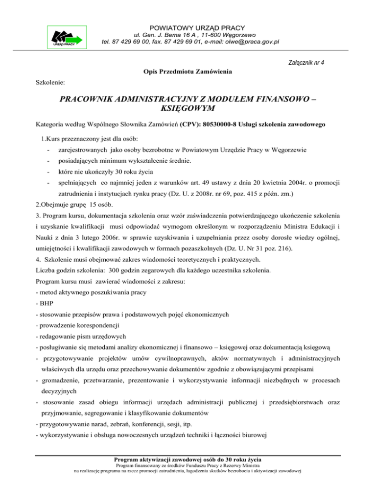 POWIATOWY URZĄD PRACY ul. Gen. J. Bema 16 A , 11-600 Węgorzewo tel. 87 429 69 00, fax. 87 429 69 01, e-mail: [email protected] Załącznik nr 4 Opis Przedmiotu Zamówienia Szkolenie: PRACOWNIK ADMINISTRACYJNY Z MODUŁEM FINANSOWO – KSIĘGOWYM Kategoria według Wspólnego Słownika Zamówień (CPV): 80530000-8 Usługi szkolenia zawodowego 1.Kurs przeznaczony jest dla osób: - zarejestrowanych jako osoby bezrobotne w Powiatowym Urzędzie Pracy w Węgorzewie - posiadających minimum wykształcenie średnie. - które nie ukończyły 30 roku życia - spełniających co najmniej jeden z warunków art. 49 ustawy z dnia 20 kwietnia 2004r. o promocji zatrudnienia i instytucjach rynku pracy (Dz. U. z 2008r. nr 69, poz. 415 z późn. zm.) 2.Obejmuje grupę 15 osób. 3. Program kursu, dokumentacja szkolenia oraz wzór zaświadczenia potwierdzającego ukończenie szkolenia i uzyskanie kwalifikacji musi odpowiadać wymogom określonym w rozporządzeniu Ministra Edukacji i Nauki z dnia 3 lutego 2006r. w sprawie uzyskiwania i uzupełniania przez osoby dorosłe wiedzy ogólnej, umiejętności i kwalifikacji zawodowych w formach pozaszkolnych (Dz. U. Nr 31 poz. 216). 4. Szkolenie musi obejmować zakres wiadomości teoretycznych i praktycznych. Liczba godzin szkolenia: 300 godzin zegarowych dla każdego uczestnika szkolenia. Program kursu musi zawierać wiadomości z zakresu: - metod aktywnego poszukiwania pracy - BHP - stosowanie przepisów prawa i podstawowych pojęć ekonomicznych - prowadzenie korespondencji - redagowanie pism urzędowych - posługiwanie się metodami analizy ekonomicznej i finansowo – księgowej oraz dokumentacją księgową - przygotowywanie projektów umów cywilnoprawnych, aktów normatywnych i administracyjnych właściwych dla urzędu oraz przechowywanie dokumentów zgodnie z obowiązującymi przepisami - gromadzenie, przetwarzanie, prezentowanie i wykorzystywanie informacji niezbędnych w procesach decyzyjnych - stosowanie zasad obiegu informacji urzędach administracji publicznej i przedsiębiorstwach oraz przyjmowanie, segregowanie i klasyfikowanie dokumentów - przygotowywanie narad, zebrań, konferencji, sesji, itp. - wykorzystywanie i obsługa nowoczesnych urządzeń techniki i łączności biurowej Program aktywizacji zawodowej osób do 30 roku życia Program finansowany ze środków Funduszu Pracy z Rezerwy Ministra na realizację programu na rzecz promocji zatrudnienia, łagodzenia skutków bezrobocia i aktywizacji zawodowej POWIATOWY URZĄD PRACY ul. Gen. J. Bema 16 A , 11-600 Węgorzewo tel. 87 429 69 00, fax. 87 429 69 01, e-mail: [email protected] - wykonywanie czynności związanych z księgowaniem operacji finansowych podmiotów gospodarczych - rozliczanie i ewidencjonowanie kosztów działalności według ustalonych zasad - rozliczanie zakupu materiałów, towarów i opakowań, sporządzanie właściwej dokumentacji i prawidłowe ewidencjonowanie oraz rozliczanie tych zakupów, kontrolowanie stanu zapasów, ich wycena zgodnie z obowiązującymi przepisami - przygotowywanie miesięcznych deklaracji podatkowych i obowiązkowych ubezpieczeń społecznych oraz dokonywanie terminowych rozliczeń tych płatności z odpowiednimi instytucjami - prawidłowe archaizowanie dokumentów finansowo - księgowych - zajęcia praktyczne Zajęcia praktyczne muszą odbywać się instytucjach zajmujących się działalnością w zakresie wskazanego przedmiotu zamówienia, i muszą stanowić nie mniej niż 150 godzin programu szkolenia. Dopuszcza się możliwość podziału uczestników szkolenia na grupy z zachowaniem warunków, o którym mowa w pkt 5. 5. Szkolenie musi odbywać się w formie kursu, realizowanego według planu nauczania obejmującego przeciętnie nie mniej niż 30 godzin zegarowych w tygodniu . Zajęcia mogą odbywać się od poniedziałku do soboty i nie powinny zaczynać się przed godziną 7.00 i kończyć się później niż po godzinie 18.00 Termin wykonania zamówienia: III kwartał 2010 - planowany termin rozpoczęcia szkolenia – sierpień 2010r. - planowany termin zakończenia szkolenia – wrzesień 2010r. 6. Wykonawca zapewni uczestnikom kursu materiały szkoleniowe oraz konieczny sprzęt szkoleniowy na czas trwania szkolenia: -każdy uczestnik musi otrzymać materiały niezbędne do robienia notatek (np. zeszyt, notatnik, długopis). Materiały wykorzystywane podczas realizacji szkolenia powinny być przekazywane każdemu uczestnikowi szkolenia za pokwitowaniem na początku szkolenia bądź na bieżąco zgodnie z realizowanym tematem zajęć.; -wykonawca zapewni serwis kawowy na czas trwania szkolenia - przez serwis kawowy należy rozumieć zaopatrzenie uczestników szkolenia w naczynia jednorazowego użytku, kawę, herbatę i cukier. -w przypadku zajęć praktycznych na jednego uczestnika szkolenia musi przypadać jedno stanowisko pracy. Korzystanie z serwisu winno być pokwitowane przez uczestników szkolenia. 7.Wykonawca zapewni uczestnikom kursu w trakcie trwania szkolenia warunki pracy zgodne z przepisami bezpieczeństwa i higieny pracy. 8. Miejsce realizacji szkolenia: Węgorzewo Program aktywizacji zawodowej osób do 30 roku życia Program finansowany ze środków Funduszu Pracy z Rezerwy Ministra na realizację programu na rzecz promocji zatrudnienia, łagodzenia skutków bezrobocia i aktywizacji zawodowej POWIATOWY URZĄD PRACY ul. Gen. J. Bema 16 A , 11-600 Węgorzewo tel. 87 429 69 00, fax. 87 429 69 01, e-mail: [email protected] 9. Wykonawca pokryje koszty dojazdu na szkolenie uczestników kursu z miejsca zamieszkania i powrotu do miejsca odbywania szkolenia, a Zamawiający zrefunduje je na podstawie przedłożonych dokumentów: a) w przypadku dojazdu do miejsca szkolenia i z powrotem do miejsca zamieszkania autobusem – „Miesięczne rozliczenie faktycznie poniesionych kosztów przejazdu” według załącznika nr 3 do umowy oraz oryginalne bilety PKS za każdy dzień szkolenia b) w przypadku dojazdu do miejsca szkolenia i z powrotem 