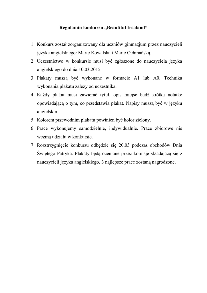 Regulamin konkursu „Beautiful Irealand” 1. Konkurs został zorganizowany dla uczniów gimnazjum przez nauczycieli języka angielskiego: Martę Kowalską i Martę Ochmańską. 2. Uczestnictwo w konkursie musi być zgłoszone do nauczyciela języka angielskiego do dnia 10.03.2015 3. Plakaty muszą być wykonane w formacie A1 lub A0. Technika wykonania plakatu zależy od uczestnika. 4. Każdy plakat musi zawierać tytuł, opis miejsc bądź krótką notatkę opowiadającą o tym, co przedstawia plakat. Napisy muszą być w języku angielskim. 5. Kolorem przewodnim plakatu powinien być kolor zielony. 6. Prace wykonujemy samodzielnie, indywidualnie. Prace zbiorowe nie wezmą udziału w konkursie. 7. Rozstrzygnięcie konkursu odbędzie się 20.03 podczas obchodów Dnia Świętego Patryka. Plakaty będą oceniane przez komisję składającą się z nauczycieli języka angielskiego. 3 najlepsze prace zostaną nagrodzone.