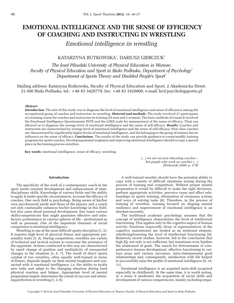 46 Pol. J. Sport Tourism 2012, 19, 46-57 EMOTIONAL INTELLIGENCE AND THE SENSE OF EFFICIENCY OF COACHING AND INSTRUCTING IN WRESTLING Emotional intelligence in wrestling KATARZYNA RUTKOWSKA1, DARIUSZ GIERCZUK2 The Josef Pilsudski University of Physical Education in Warsaw, 1 Faculty of Physical Education and Sport in Bia³a Podlaska, Department of Psychology 2 Department of Sports Theory and Disabled People's Sport Mailing address: Katarzyna Rutkowska, Faculty of Physical Education and Sport, 2 Akademicka Street, 21-500 Bia³a Podlaska, tel.: +48 83 3428779, fax: +48 83 3428800, e-mail: [email protected] Abstract Introduction. The aim of this study was to diagnose the level of emotional intelligence and sense of efficiency among the occupational group of coaches and instructors in wrestling. Material and methods. The study involved 27 participants of a training course for coaches and instructors in training (25 men and 2 women). The basic methods of research involved the Emotional Intelligence Questionnaire INTE and the GSES scale for measurement of the sense of efficacy. Their use allowed us to diagnose the average level of emotional intelligence and the sense of self-efficacy. Results. Coaches and instructors are characterised by average level of emotional intelligence and the sense of self-efficacy. First class coaches are characterized by significantly higher levels of emotional intelligence, and the belonging to the group of trainers has no influence on the sense of efficacy. Conclusions. The results of the study can provide guidance to create/modify training programs for sports coaches. Developing mental toughness and improving emotional intelligence should occupy a special place in the training process wrestlers. Key words: emotional intelligence, sense of efficacy, wrestling (…) we are not just educating coaches – but people who work as coaches (…) [Perkowski 2009, p. 179] Introduction The specificity of the work of a contemporary coach in the sport needs constant development and enhancement of interdisciplinary skills. Knowledge of various fields and the ability to apply it under specific circumstances, increase the efficacy of coaches. One such field is psychology. Being aware of his/her own psychosocial needs and those of the players and a coach not only continually enhances his/her knowledge in this field, but also cares about personal development, fine tunes various skills/competencies that might guarantee effective and satisfactory performance in various spheres of life – professional as well as personal. One of the important elements of social competence is emotional intelligence. Wrestling is one of the most difficult sports discipline [1, 2]. It requires high level of physical fitness and appropriate personality traits [3, 4]. During competition, wrestlers use variety of technical and tactical actions to overcome the resistance of the opponent. Actions conducted in this way are characterized by rapid change of position and multiplicity of unexpected changes in the situation [5, 6, 7]. The result of direct sports combat of two wrestlers, often equally well-trained in terms of fitness, depends largely on their mental toughness and connected with it emotional intelligence, i.e. the ability to tackle new tasks and adapt to the changing situation during hard physical exertion and fatigue. Appropriate level of mental preparation largely determines the extent of success and attaining perfection in wrestling [1, 2, 8]. A well-trained wrestler should have the potential ability to cope with a variety of difficult situations arising during the process of training and competition. Without proper mental preparation it would be difficult to make the right decisions, perform appropriate activities, perceive cause and effect relationships in sports training, elimination of erroneous actions and ways of solving tasks [8]. Therefore, in the process of training of wrestlers, training focused on shaping mental resilience and improvement of emotional intelligence is an absolute necessity. The traditional academic psychology assumes that the concept of intelligence characterizes the level of intellectual functioning. This applies only to the cognitive aspect of human activity. Emotions (especially those of representatives of the cognitive mainstream) are treated as an irrational element, interfering/lowering the level of intellectual functioning [9]. Relatively recent studies, however, led to the conclusion that high IQ, not only is not sufficient, but sometimes even hinders the attainment of goals. The search for determinants of comprehensive human development, effective functioning in various areas and various successes, intra-/interpersonal good relationships and, consequently, satisfaction with life helped to successfully raise the profile of emotional intelligence [9, 10, 11]. Emotional intelligence is an acquired meta-skill (acquired especially in childhood). At the same time, it is worth noting, in a sense it moderates the acquisition of social skills and development of various competencies, mainly including empa- Copyright © 2012 by Josef Pilsudski University of Physical Education in Warsaw, Faculty of Physical Education and Sport in Biala Podlaska Rutkowska and Gierczuk: EMOTIONAL INTELLIGENCE... thy – i.e. a component of emotional intelligence. Emotional intelligence is a collection of instrumental and motivational skills, which helps to effectively utilize the human potential. It determines the adequate processing of emotional knowledge, perception, understanding and regulating emotions. Its high level provides comprehensive access to the emotions also during the process of thinking. Thanks to emotional intelligence the use of existing emotional experience becomes more effective, which in turn proves to be helpful in coping with difficult social situations [11, 12, 13]. The results also show that the level of emotional intelligence is significantly associated with broadly