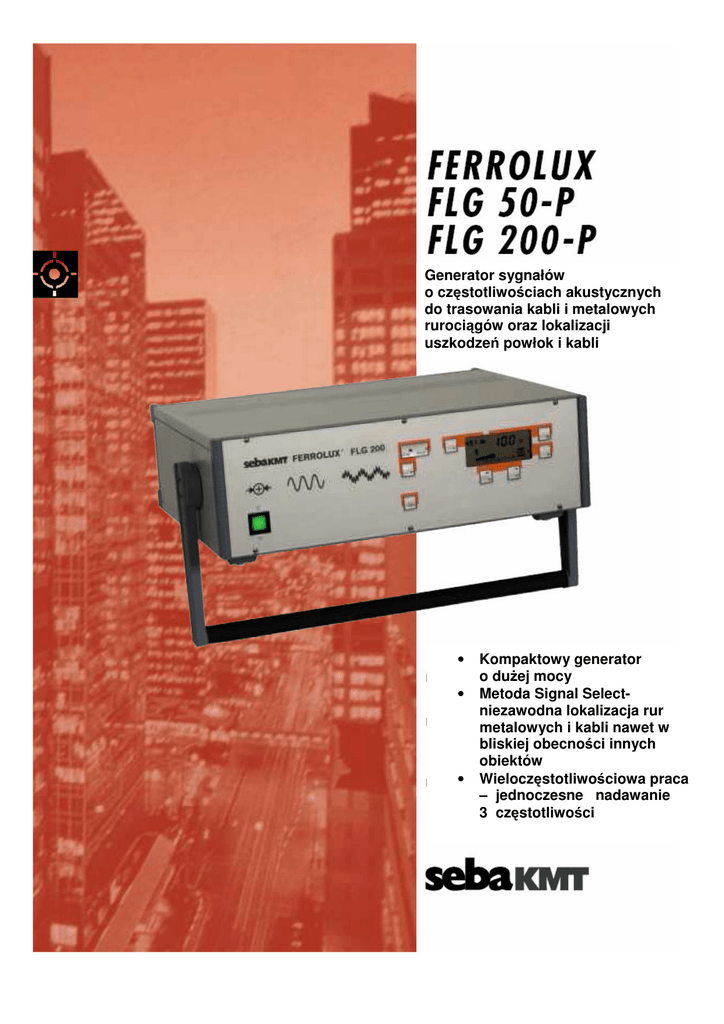 Generator sygnałów o cz stotliwo ciach akustycznych do trasowania kabli i metalowych ruroci gów oraz lokalizacji uszkodze powłok i kabli • • • Kompaktowy generator o du ej mocy Metoda Signal Selectniezawodna lokalizacja rur metalowych i kabli nawet w bliskiej obecno ci innych obiektów Wielocz stotliwo ciowa praca – jednoczesne nadawanie 3 cz stotliwo ci Generator Cz stotliwo ci Akustycznych Opis: ® System pomiarowy FERROLUX umo liwia u ytkownikom kabli energetycznych i telekomunikacyjnych jak równie przedsi biorstwom dostarczaj cym gaz oraz wod rozwi za szeroki zakres problemów. Generator Cz stotliwo ci Akustycznej mo e by u yty do lokalizacji, selekcji oraz identyfikacji kabli oraz lokalizacji metalowych ruroci gów. ® Nowym rozwi zaniem w Systemach Pomiarowych FERROLUX jest mo liwo generowania jednocze nie trzech cz stotliwo ci. Eliminuje to konieczno zmieniania cz stotliwo ci generatora podczas pracy. W poł czeniu z nowym Odbiornikiem Cz stotliwo ci Akustycznej ® FLE 10 system FERROLUX mo e by u yty do wprowadzenia nowej techniki lokalizacji SuperMax oraz metody identyfikacji kierunku sygnału SignalSelect. Przyrz d mierzy oraz wy wietla impedancj p tli mierzonego obiektu, napi cie wyj ciowe, pr d oraz k t fazowy. W generatorze nie wyst puje przegrzanie podczas pracy w trybie ci głym z obci eniem pojemno ciowym (izolowane rury gazowe) oraz indukcyjnym (krótkie kable). Model FLG 10 mo e słu y jako ładowarka do odbiornika cz stotliwo ci akustycznej. Moc wyj ciowa mo e by ustawiana na dwóch poziomach, niskim (do 10W) oraz wysokim (do 50/ 200 W). Wła ciwo ci: Pod wietlany wy wietlacz LCD wy wietlaj cy wszystkie • wa ne parametry • Automatyczne dopasowanie impedancji • Automatyczny wybór cz stotliwo ci • Praca w trybie wielocz stotliwo ciowym – równoczesna generacja trzech cz stotliwo ci • Poziomy mocy 10 / 200 W (FLG 200); 10 / 50 W (FLG 50) • Zabezpieczenie przed przeci eniem na wszystkich zakresach impedancji • Wskazanie obecno ci niebezpiecznego napi cia na wyj ciu generatora • Ochrona poprzez separacj ródła napi cia • Szeroki zakres zasilaczy z korekcj współczynnika mocy (PFC) • Zł cze PC RS-232 umo liwiaj ce łatwy i prosty serwis • Obudowa 19” dost pna w dwóch wersjach – przeno nej oraz przeznaczonej do instalacji w wozach kablowych Dane Techniczne: Generowane cz stotliwo ci: 491 Hz/ 982 Hz / 8440 Hz (inne cz stotliwo ci dost pne s na zamówienie) Praca w trybie wielocz stotliwo ciowym. Moc wyj ciowa: Moc FLG 200 0...10 W 0...200 W FLG 50 0...10 W 0...50 W Rozdzielczo 0.5 W 10 W 0.5 W 2.5 W Dopasowanie impedancji: 0.5...1000 Ω, automatyczne Mierzone parametry: Impedancja p tli, pr d, napi cie. Zasilanie: Zasilanie sieciowe 100...240 VAC Zł cze szeregowe: RS-232 Układ zabezpieczaj cy przed zbyt gł bokim rozładowaniem wbudowanego akumulatora. Rozmiary: 450 x 320 x 133 mm (D x S x W) Waga: Około 12 kg. Temperatura pracy: o o -20 C do + 50 C Produkowane wersje: FLG 200-P przeno ny FLG 200-M 19”M do instalacji w wozach FLG 50-P przeno ny FLG 50-M 19” do instalacji w wozach Akcesoria: - Kabel sieciowy NKG 1 - Zestaw kabli VL FLG 200 Przedsi biorstwo Handlowo-Usługowe Jan St pie 44-100 Gliwice, ul. Sowi skiego 72 tel:032/231-22-56, 305-06-75; fax:032/231-59-02 www.ekoelektro.neostrada.pl ; e-mail: [email protected]