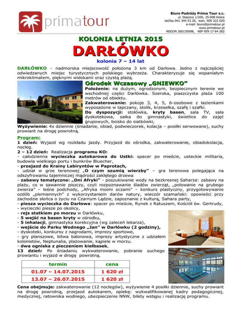 Biuro Podróży Prima Tour s.c. ul. Staszica 1/205, 25-008 Kielce tel/fax 041 344 53 29, kom. 509 222 020 e-mail: [email protected] www.primatour.pl REGON 260135098, NIP 959 17 64 282 KOLONIA LETNIA 2015 DARŁÓWKO kolonia 7 – 14 lat DARŁÓWKO – nadmorska miejscowość położona 3 km od Darłowa. Jedno z najczęściej odwiedzanych miejsc turystycznych polskiego wybrzeża. Charakteryzuje się wspaniałym mikroklimatem, pięknymi widokami oraz czystą plażą. Ośrodek Wczasowy „GNIEWKO” Położenie: na dużym, ogrodzonym, bezpiecznym terenie we wschodniej części Darłówka. Szeroka, piaszczysta plaża 100 metrów od obiektu. Zakwaterowanie: pokoje 3, 4, 5, 6-osobowe z łazienkami wyposażone w tapczany, stolik, krzesełka, szafę i szafki. Do dyspozycji: stołówka, kryty basen, sala TV, sala dyskotekowa, salka do gimnastyki, świetlice do zajęć grupowych, boisko do siatkówki, Wyżywienie: 4x dziennie (śniadanie, obiad, podwieczorek, kolacja – posiłki serwowane), suchy prowiant na drogę powrotną. Program: 1 dzień: Wyjazd wg rozkładu jazdy. Przyjazd do ośrodka, zakwaterowanie, obiadokolacja, nocleg. 2 – 12 dzień: Realizacja programu KO: - całodzienna wycieczka autokarowa do Ustki: spacer po mieście, usteckie militaria, budowla wielkiego portu i bunkrów Bluecher, - przejazd do Krainy Labiryntów w Paprotach, - udział w grze terenowej „O czym szumią wierzby” – gra terenowa polegająca na odszyfrowaniu tajemniczej mądrości zaklętego drzewa - zabawy tematyczne: „Dni Afryki” - poszukiwanie wody na bezkresnej Saharze: zabawy na plaży, co w sawannie piszczy, czyli rozpoznawanie śladów zwierząt, „polowanie na grubego zwierza” – leśne podchody, „Afryka moimi oczami” – konkurs plastyczny, przygotowywanie ozdób „plemiennych” z wykorzystaniem darów natury, wieczór szamański: opowieści przy zachodzie słońca o życiu na Czarnym Lądzie, zapoznanie z kulturą, Sahara party, - piesza wycieczka do Darłowa: spacer po mieście, Rynek z Ratuszem, Kościół św. Gertrudy, - wycieczki piesze po okolicy, - rejs statkiem po morzu w Darłówku, - 5 wejść na basen kryty w ośrodku, - 5 inhalacji, gimnastyka korekcyjna (wg zaleceń lekarza), - wejście do Parku Wodnego „Jan” w Darłówku (2 godziny), - dyskoteki, konkursy z nagrodami, imprezy sportowe, - gry planszowe, bitwa balonowa, imprezy artystyczne z udziałem kolonistów, Neptunalia, plażowanie, kąpiele w morzu. - dwa ogniska z pieczeniem kiełbasek, 13 dzień: Po śniadaniu wykwaterowanie, pobranie suchego prowiantu i wyjazd w drogę powrotną. termin cena 01.07 – 14.07.2015 1 620 zł 13.07 – 26.07.2015 1 620 zł Cena obejmuje: zakwaterowanie (12 noclegów), wyżywienie 4 posiłki dziennie, suchy prowiant na drogę powrotną, przejazd autokarem, opiekę: wykwalifikowanej kadry pedagogicznej, medycznej, ratownika wodnego, ubezpieczenie NNW, bilety wstępu i realizację programu.