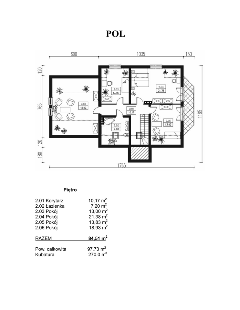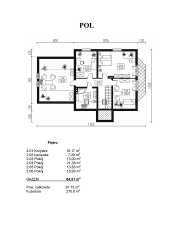 POL Piętro 2.01 Korytarz 2.02 Łazienka 2.03 Pokój 2.04 Pokój 2.05 Pokój 2.06 Pokój 10,17 m2 7,20 m2 13,00 m2 21,38 m2 13,83 m2 18,93 m2 RAZEM 84,51 m2 Pow. całkowita Kubatura 97.73 m2 270.0 m3 Parter 1.01 Wiatrołap 1.02 Hall 1.03 Spiżarnia 1.04 Kuchnia 1.05 Pokój dzienny 1.06 Pokój 1.07 Korytarz 1.08 Łazienka 1.09 Garaż 1.10 Pom. gosp. 3,33 m2 3.99 m2 0.75 m2 12.23 m2 37.91 m2 14.24 m2 4.50 m2 11,00 m2 29,64 m2 9,75 m2 RAZEM 127.34 m2 Pow. zabudowy Pow. całkowita Kubatura 158.53 m2 158.53 m2 420,0 m3