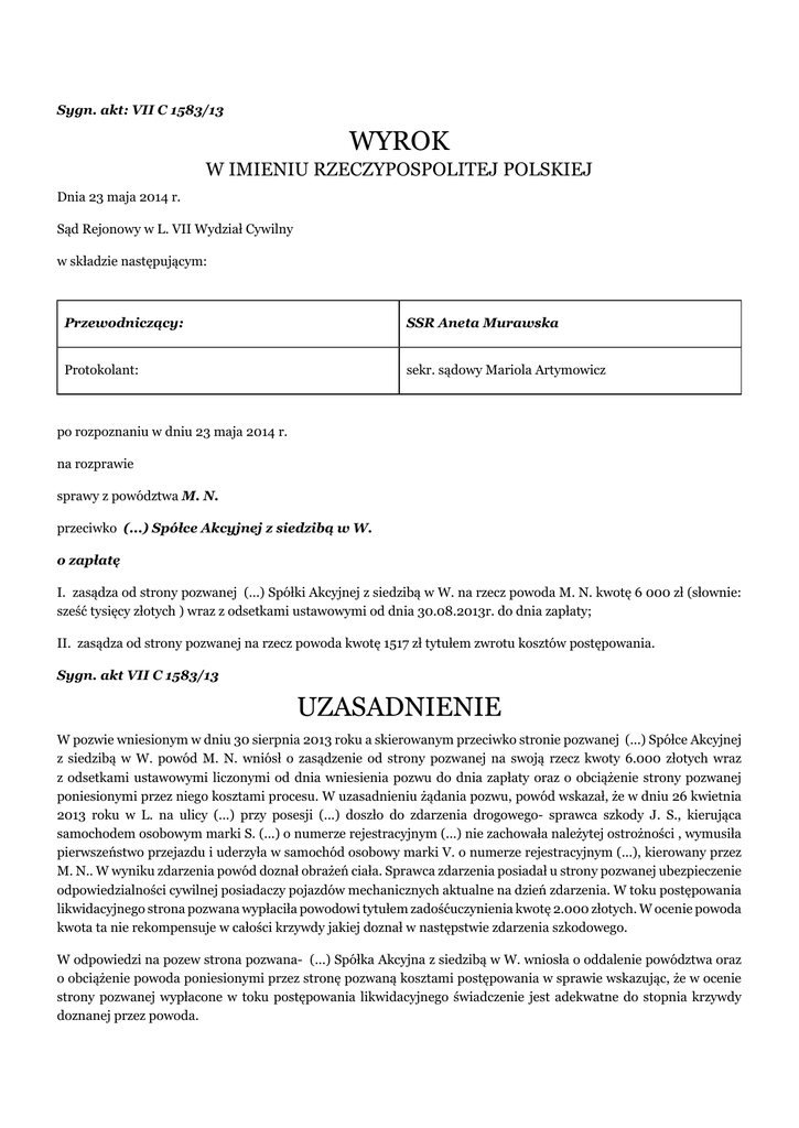 Sygn. akt: VII C 1583/13 WYROK W IMIENIU RZECZYPOSPOLITEJ POLSKIEJ Dnia 23 maja 2014 r. Sąd Rejonowy w L. VII Wydział Cywilny w składzie następującym: Przewodniczący: SSR Aneta Murawska Protokolant: sekr. sądowy Mariola Artymowicz po rozpoznaniu w dniu 23 maja 2014 r. na rozprawie sprawy z powództwa M. N. przeciwko (...) Spółce Akcyjnej z siedzibą w W. o zapłatę I. zasądza od strony pozwanej (...) Spółki Akcyjnej z siedzibą w W. na rzecz powoda M. N. kwotę 6 000 zł (słownie: sześć tysięcy złotych ) wraz z odsetkami ustawowymi od dnia 30.08.2013r. do dnia zapłaty; II. zasądza od strony pozwanej na rzecz powoda kwotę 1517 zł tytułem zwrotu kosztów postępowania. Sygn. akt VII C 1583/13 UZASADNIENIE W pozwie wniesionym w dniu 30 sierpnia 2013 roku a skierowanym przeciwko stronie pozwanej (...) Spółce Akcyjnej z siedzibą w W. powód M. N. wniósł o zasądzenie od strony pozwanej na swoją rzecz kwoty 6.000 złotych wraz z odsetkami ustawowymi liczonymi od dnia wniesienia pozwu do dnia zapłaty oraz o obciążenie strony pozwanej poniesionymi przez niego kosztami procesu. W uzasadnieniu żądania pozwu, powód wskazał, że w dniu 26 kwietnia 2013 roku w L. na ulicy (...) przy posesji (...) doszło do zdarzenia drogowego- sprawca szkody J. S., kierująca samochodem osobowym marki S. (...) o numerze rejestracyjnym (...) nie zachowała należytej ostrożności , wymusiła pierwszeństwo przejazdu i uderzyła w samochód osobowy marki V. o numerze rejestracyjnym (...), kierowany przez M. N.. W wyniku zdarzenia powód doznał obrażeń ciała. Sprawca zdarzenia posiadał u strony pozwanej ubezpieczenie odpowiedzialności cywilnej posiadaczy pojazdów mechanicznych aktualne na dzień zdarzenia. W toku postępowania likwidacyjnego strona pozwana wypłaciła powodowi tytułem zadośćuczynienia kwotę 2.000 złotych. W ocenie powoda kwota ta nie rekompensuje w całości krzywdy jakiej doznał w następstwie zdarzenia szkodowego. W odpowiedzi na pozew strona pozwana- (...) Spółka Akcyjna z siedzibą w W. wniosła o oddalenie powództwa oraz o obciążenie powoda poniesionymi przez stronę pozwaną kosztami postępowania w sprawie wskazując, że w ocenie strony pozwanej wypłacone w toku postępowania likwidacyjnego świadczenie jest adekwatne do stopnia krzywdy doznanej przez powoda. Sąd ustalił następujący stan faktyczny: W dniu 26 kwietnia 2013 roku w L. na ulicy (...) przy posesji (...) doszło do zdarzenia drogowego- sprawca szkody J. S., kierująca samochodem osobowym marki S. (...) o numerze rejestracyjnym (...) nie zachowała należytej ostrożności, wymusiła pierwszeństwo przejazdu i uderzyła w samochód osobowy marki V. o numerze rejestracyjnym (...), kierowany przez M. N.. W wyniku zdarzenia powód doznał obrażeń ciała. Sprawca zdarzenia posiadał u strony pozwanej ubezpieczenie odpowiedzialności cywilnej posiadaczy pojazdów mechanicznych aktualne na dzień zdarzenia. Bezsporne Po wypadku powód został zaopatrzony w Izbie Przyjęć Szpitala w L.. Po przyjęciu nie stwierdzono w badaniach obrazowych zmian urazowych. W leczeniu zastosowano kołnierz ortopedyczny . Przy przyjęciu w badaniu nie stwierdzono istotnych dolegliwości bólowych, ograniczeń ruchomości. Dalsze leczenie powód realizował w poradni ortopedycznej i neurologicznej. W dniu 15 maja 2013 roku powód był konsultowany przez ortopedę. W badaniu przedmiotowym stwierdzono niewielkie ograniczenie ruchomości kręgosłupa szyjnego. Nie stwierdzono objawów korzeniowych. Zalecono unikanie przeciążeń kręgosłupa oraz kontrolę w razie dolegliwości. W dniu 28 sierpnia 2013 roku powód był konsultowany neurologicznie. W skardze odnotowano bóle promieniujące do lewego stawu barkowego , stwierdzono uszkodzenie splotu barkowego po stronie lewej, lecz nie zlecono dalszej diagnostyki, nie zlecono kontroli. Zalecono powodowi w leczeniu leki przeciwbólowe. W następstwie zdarzenia szkodowego powód doznał długotrwałego uszczerbku na zdrowiu w wysokości 2% albowiem doznał on urazu skrętnego kręgosłupa szyjnego, obecnie bez ograniczeń ruchomości, bez objawów korzeniowych. Powód po wypadku odczuwał dolegliwości bólowe około 5 miesięcy. Rokowanie na przyszłość co do zdrowia powoda jest dobre. Najprawdopodobniej nie dojdzie do powstania nowych zmian chorobowych w układzie ruchu po przebytym urazie. Przebyty uraz nie wpływa obecnie na aktywność życiową powoda. Przebyty uraz wiązał się z niewielkimi dolegliwościami bólowymi. W czasie leczenia utrudnienia życiowe były niewielkie. Aktualnie powód nie ma żadnych utrudnień życiowych z powodu przebytego urazu kręgosłupa szyjnego. W następstwie wypadku powód odczuwa dolegliwości bólowe w obrębie kręgosłupa szyjnego. Ból ten uniemożliwiał mu w pełni angażowanie się w wykonywanie czynności bieżących, w tym w pracy. Nadto w następstwie urazu powód zrezygnował z uprawiania sportu. Powód w następstwie wypadku nie doznał urazu w sferze psychiki. Dowód: - kopia dowodu osobistego- k. 13-14, - zaświadczenie z Komendy Miejskie Policji z dnia 16 maja 2013 roku- k. 15, -dokumentacja medyczna powoda- k. 17-20, k. 32-34 - decyzja pozwanego z dnia 24 lipca 2013 roku- k. 21, - opinia biegłego sądowego z zakresu ortopedii i traumatologii- k. 60-62, - opinia biegłych sądowych z zakresu psychiatrii i psychologii- k. 90-93, - zeznania świadka R. N.-k. 94-95 - przesłuchanie powoda M. N.- k. 75-76 W toku postępowania likwidacyjnego, w następstwie zgłoszenia szkody i roszczenia o zapłatę kwoty 15.000 złotych tytułem zadośćuczynienia oraz kwoty 60 złotych tytułem zwrotu kosztów leczenia, strona pozwana decyzją z dnia 17 lipca 2013 roku przyznała powodowi zadośćuczynienie w wysokości 2.000 złotych oraz kwotę 60 złotych tytułem zwrotu kosztów leczenia. Dowód: - akta szkody. Sąd zważył, co następuje: Powództwo zasługuje na uwzględnienie w całości. W sprawie pozostawa