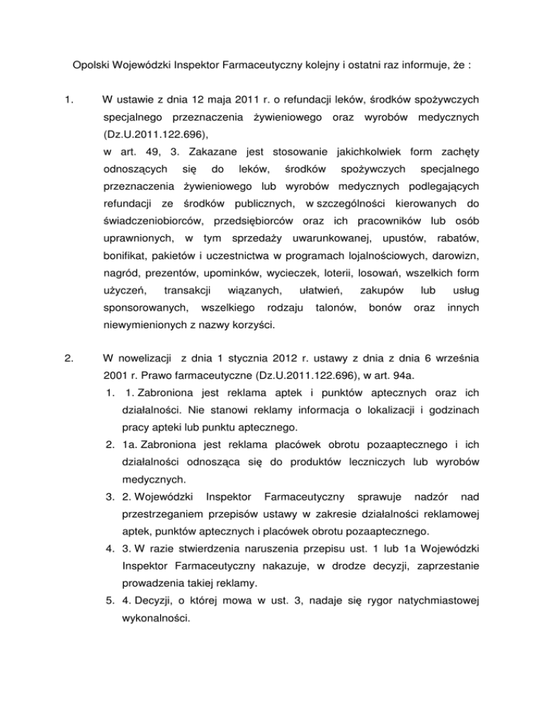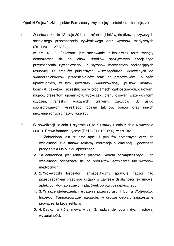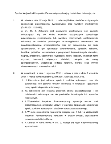 Opolski Wojewódzki Inspektor Farmaceutyczny kolejny i ostatni raz informuje, że : 1. W ustawie z dnia 12 maja 2011 r. o refundacji leków, środków spożywczych specjalnego przeznaczenia żywieniowego oraz wyrobów medycznych (Dz.U.2011.122.696), w art. 49, 3. Zakazane jest stosowanie jakichkolwiek form zachęty odnoszących się do leków, środków spożywczych specjalnego przeznaczenia żywieniowego lub wyrobów medycznych podlegających refundacji ze środków publicznych, w szczególności kierowanych do świadczeniobiorców, przedsiębiorców oraz ich pracowników lub osób uprawnionych, w tym sprzedaży uwarunkowanej, upustów, rabatów, bonifikat, pakietów i uczestnictwa w programach lojalnościowych, darowizn, nagród, prezentów, upominków, wycieczek, loterii, losowań, wszelkich form użyczeń, transakcji sponsorowanych, wiązanych, wszelkiego ułatwień, rodzaju talonów, zakupów lub usług bonów oraz innych niewymienionych z nazwy korzyści. 2. W nowelizacji z dnia 1 stycznia 2012 r. ustawy z dnia z dnia 6 września 2001 r. Prawo farmaceutyczne (Dz.U.2011.122.696), w art. 94a. 1. 1. Zabroniona jest reklama aptek i punktów aptecznych oraz ich działalności. Nie stanowi reklamy informacja o lokalizacji i godzinach pracy apteki lub punktu aptecznego. 2. 1a. Zabroniona jest reklama placówek obrotu pozaaptecznego i ich działalności odnosząca się do produktów leczniczych lub wyrobów medycznych. 3. 2. Wojewódzki Inspektor Farmaceutyczny sprawuje nadzór nad przestrzeganiem przepisów ustawy w zakresie działalności reklamowej aptek, punktów aptecznych i placówek obrotu pozaaptecznego. 4. 3. W razie stwierdzenia naruszenia przepisu ust. 1 lub 1a Wojewódzki Inspektor Farmaceutyczny nakazuje, w drodze decyzji, zaprzestanie prowadzenia takiej reklamy. 5. 4. Decyzji, o której mowa w ust. 3, nadaje się rygor natychmiastowej wykonalności. 3. Dozwolona jest reklama produktów leczniczych na terenie apteki pod warunkiem, że spełnia wszystkie wymagania prawne zawarte w przepisach rozdziału 4 pt. „Reklama produktów leczniczych” ustawy – Prawo farmaceutyczne oraz zapisy § 11 ust. 1 i ust. 3 rozporządzenia Ministra Zdrowia z dnia 21 listopada 2008 r. w sprawie reklamy produktów leczniczych (Dz.U. z 2008 r. Nr 210, poz. 1327). Istotą tych zapisów jest stwierdzenie, że jedynie informacja o lokalizacji i godzinach pracy apteki lub punktu aptecznego nie jest rozumiana przez ustawodawcę jako reklama oraz dozwolona jest reklama produktów leczniczych na terenie apteki spełniająca określone wymagania prawne. Wszystkie inne formy marketingu dotyczące apteki i jej działalności mieszczą się w pojęciu reklamy i są zabronione oraz formy zachęty odnoszące się do leków, środków spożywczych specjalnego przeznaczenia żywieniowego lub wyrobów medycznych podlegających refundacji ze środków publicznych są również zabronione. W związku z powyższym Opolskim Wojewódzki Inspektor Farmaceutyczny w Opolu zwraca się do wszystkich przedsiębiorców prowadzących apteki ogólnodostępne na obszarze województwa opolskiego z prośbą o natychmiastowe zaprzestanie wszelkich działań, które mogą nosić znamiona reklamy aptek lub punktów aptecznych i ograniczenie komunikatów kierowanych do potencjalnych klientów (pacjentów apteki) wyłącznie do informacji o lokalizacji i godzinach pracy tych placówek. Opolski Wojewódzki Inspektor Farmaceutyczny Marek Brach