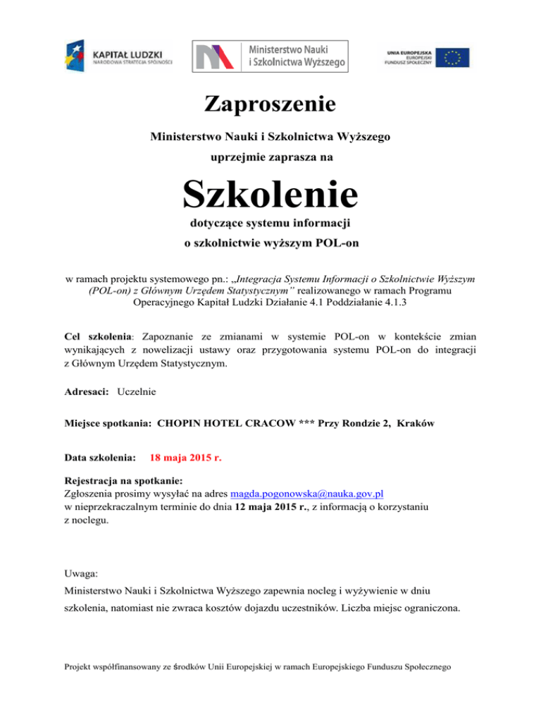 Zaproszenie Ministerstwo Nauki i Szkolnictwa Wyższego uprzejmie zaprasza na Szkolenie dotyczące systemu informacji o szkolnictwie wyższym POL-on w ramach projektu systemowego pn.: „Integracja Systemu Informacji o Szkolnictwie Wyższym (POL-on) z Głównym Urzędem Statystycznym” realizowanego w ramach Programu Operacyjnego Kapitał Ludzki Działanie 4.1 Poddziałanie 4.1.3 Cel szkolenia: Zapoznanie ze zmianami w systemie POL-on w kontekście zmian wynikających z nowelizacji ustawy oraz przygotowania systemu POL-on do integracji z Głównym Urzędem Statystycznym. Adresaci: Uczelnie Miejsce spotkania: CHOPIN HOTEL CRACOW *** Przy Rondzie 2, Kraków Data szkolenia: 18 maja 2015 r. Rejestracja na spotkanie: Zgłoszenia prosimy wysyłać na adres [email protected] w nieprzekraczalnym terminie do dnia 12 maja 2015 r., z informacją o korzystaniu z noclegu. Uwaga: Ministerstwo Nauki i Szkolnictwa Wyższego zapewnia nocleg i wyżywienie w dniu szkolenia, natomiast nie zwraca kosztów dojazdu uczestników. Liczba miejsc ograniczona. Projekt współfinansowany ze środków Unii Europejskiej w ramach Europejskiego Funduszu Społecznego 17 maja 2015 r. 18:30 - 20:30 - Kolacja dla osób korzystających z noclegu. Harmonogram szkolenia w dniu 18 maja 2015 r. 10:15-10:45 - Rejestracja uczestników/ powitalna kawa; 10:45 -11:30 - Prezentacja - dr Andrzej Kurkiewicz, Z-ca Dyrektora Departamentu Innowacji i Rozwoju w MNiSW; 11:30-12:45 - Zmiany w systemie POL-on wynikające z nowelizacji ustaw - kwestie techniczne (przedstawiciel OPI-PIB); 12:45-13:30 - Obiad; 13:30-14:15 - Harmonogram rozbudowy systemu POL-on w roku 2015; 14:15-15:30 - Moduły POL-on: ORPD, PBN, POL-index- (przedstawiciel OPI-PIB); 15:30 -15:45 - Przerwa kawowa; 15:45 -16:50 – Dyskusja. Projekt współfinansowany ze środków Unii Europejskiej w ramach Europejskiego Funduszu Społecznego