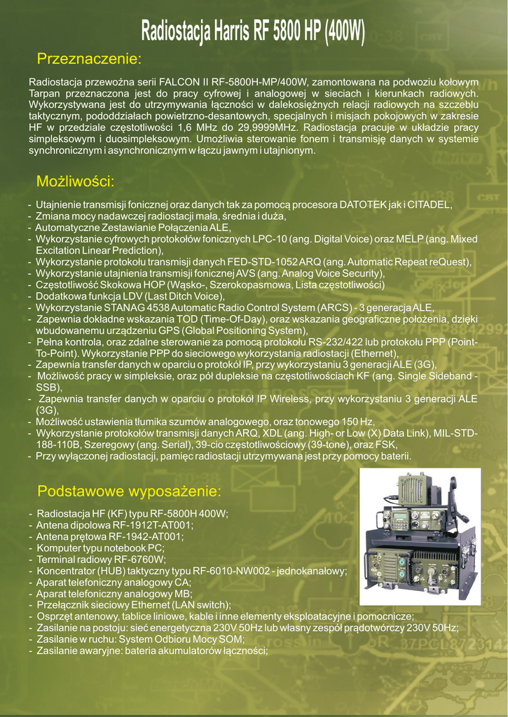 Radiostacja Harris RF 5800 HP (400W) Przeznaczenie: Radiostacja przewoŸna serii FALCON II RF-5800H-MP/400W, zamontowana na podwoziu ko³owym Tarpan przeznaczona jest do pracy cyfrowej i analogowej w sieciach i kierunkach radiowych. Wykorzystywana jest do utrzymywania ³¹cznoœci w dalekosiê¿nych relacji radiowych na szczeblu taktycznym, pododdzia³ach powietrzno-desantowych, specjalnych i misjach pokojowych w zakresie HF w przedziale czêstotliwoœci 1,6 MHz do 29,9999MHz. Radiostacja pracuje w uk³adzie pracy simpleksowym i duosimpleksowym. Umo¿liwia sterowanie fonem i transmisjê danych w systemie synchronicznym i asynchronicznym w ³¹czu jawnym i utajnionym. Mo¿liwoœci: - Utajnienie transmisji fonicznej oraz danych tak za pomoc¹ procesora DATOTEK jak i CITADEL, Zmiana mocy nadawczej radiostacji ma³a, œrednia i du¿a, Automatyczne Zestawianie Po³¹czenia ALE, Wykorzystanie cyfrowych protoko³ów fonicznych LPC-10 (ang. Digital Voice) oraz MELP (ang. Mixed Excitation Linear Prediction), Wykorzystanie protoko³u transmisji danych FED-STD-1052 ARQ (ang. Automatic Repeat reQuest), Wykorzystanie utajnienia transmisji fonicznej AVS (ang. Analog Voice Security), Czêstotliwoœæ Skokowa HOP (W¹sko-, Szerokopasmowa, Lista czêstotliwoœci) Dodatkowa funkcja LDV (Last Ditch Voice), Wykorzystanie STANAG 4538 Automatic Radio Control System (ARCS) - 3 generacja ALE, Zapewnia dok³adne wskazania TOD (Time-Of-Day), oraz wskazania geograficzne po³o¿enia, dziêki wbudowanemu urz¹dzeniu GPS (Global Positioning System), Pe³na kontrola, oraz zdalne sterowanie za pomoc¹ protoko³u RS-232/422 lub protoko³u PPP (PointTo-Point). Wykorzystanie PPP do sieciowego wykorzystania radiostacji (Ethernet), Zapewnia transfer danych w oparciu o protokó³ IP, przy wykorzystaniu 3 generacji ALE (3G), Mo¿liwoœæ pracy w simpleksie, oraz pó³ dupleksie na czêstotliwoœciach KF (ang. Single Sideband SSB), Zapewnia transfer danych w oparciu o protokó³ IP Wireless, przy wykorzystaniu 3 generacji ALE (3G), Mo¿liwoœæ ustawienia t³umika szumów analogowego, oraz tonowego 150 Hz, Wykorzystanie protoko³ów transmisji danych ARQ, XDL (ang. High- or Low (X) Data Link), MIL-STD188-110B, Szeregowy (ang. Serial), 39-cio czêstotliwoœciowy (39-tone), oraz FSK, Przy wy³¹czonej radiostacji, pamiêc radiostacji utrzymywana jest przy pomocy baterii. Podstawowe wyposa¿enie: - Radiostacja HF (KF) typu RF-5800H 400W; Antena dipolowa RF-1912T-AT001; Antena prêtowa RF-1942-AT001; Komputer typu notebook PC; Terminal radiowy RF-6760W; Koncentrator (HUB) taktyczny typu RF-6010-NW002 - jednokana³owy; Aparat telefoniczny analogowy CA; Aparat telefoniczny analogowy MB; Prze³¹cznik sieciowy Ethernet (LAN switch); Osprzêt antenowy, tablice liniowe, kable i inne elementy eksploatacyjne i pomocnicze; Zasilanie na postoju: sieæ energetyczna 230V 50Hz lub w³asny zespó³ pr¹dotwórczy 230V 50Hz; Zasilanie w ruchu: System Odbioru Mocy SOM; Zasilanie awaryjne: bateria akumulatorów ³¹cznoœci;