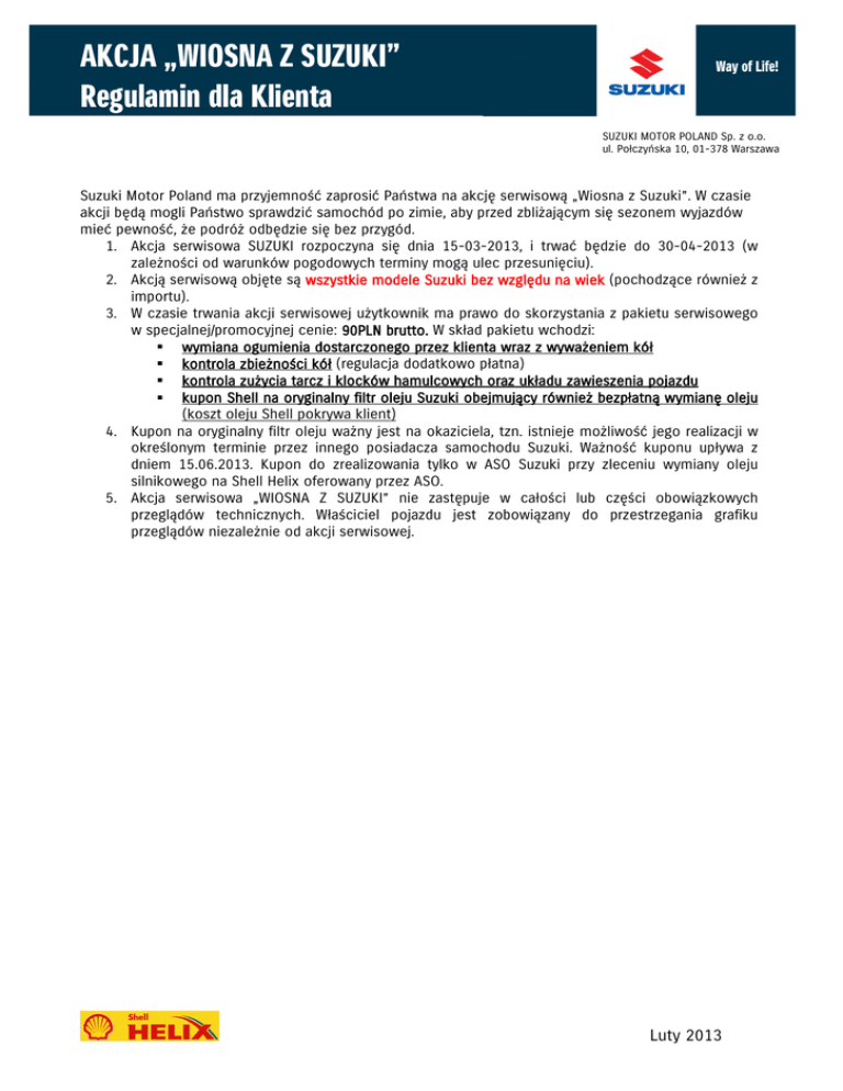 AKCJA „WIOSNA Z SUZUKI” Regulamin dla Klienta SUZUKI MOTOR POLAND Sp. z o.o. ul. Połczyńska 10, 01-378 Warszawa Suzuki Motor Poland ma przyjemność zaprosić Państwa na akcję serwisową „Wiosna z Suzuki”. W czasie akcji będą mogli Państwo sprawdzić samochód po zimie, aby przed zbliżającym się sezonem wyjazdów mieć pewność, że podróż odbędzie się bez przygód. 1. Akcja serwisowa SUZUKI rozpoczyna się dnia 15-03-2013, i trwać będzie do 30-04-2013 (w zależności od warunków pogodowych terminy mogą ulec przesunięciu). 2. Akcją serwisową objęte są wszystkie modele Suzuki bez względu na wiek (pochodzące również z importu). 3. W czasie trwania akcji serwisowej użytkownik ma prawo do skorzystania z pakietu serwisowego w specjalnej/promocyjnej cenie: 90PLN brutto. W skład pakietu wchodzi: wymiana ogumienia dostarczonego przez klienta wraz z wyważeniem kół kontrola zbieżności kół (regulacja dodatkowo płatna) kontrola zużycia tarcz i klocków hamulcowych oraz układu zawieszenia pojazdu kupon Shell na oryginalny filtr oleju Suzuki obejmujący również bezpłatną wymianę oleju (koszt oleju Shell pokrywa klient) 4. Kupon na oryginalny filtr oleju ważny jest na okaziciela, tzn. istnieje możliwość jego realizacji w określonym terminie przez innego posiadacza samochodu Suzuki. Ważność kuponu upływa z dniem 15.06.2013. Kupon do zrealizowania tylko w ASO Suzuki przy zleceniu wymiany oleju silnikowego na Shell Helix oferowany przez ASO. 5. Akcja serwisowa „WIOSNA Z SUZUKI” nie zastępuje w całości lub części obowiązkowych przeglądów technicznych. Właściciel pojazdu jest zobowiązany do przestrzegania grafiku przeglądów niezależnie od akcji serwisowej. Luty 2013