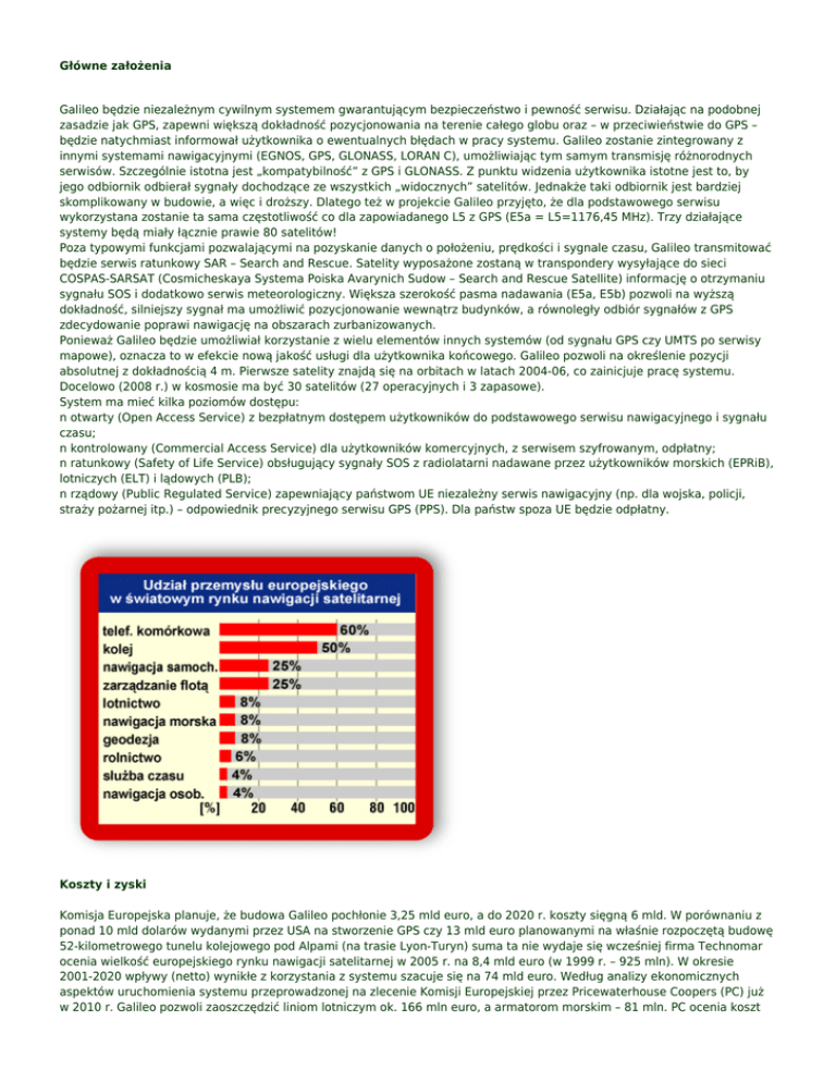 Główne założenia Galileo będzie niezależnym cywilnym systemem gwarantującym bezpieczeństwo i pewność serwisu. Działając na podobnej zasadzie jak GPS, zapewni większą dokładność pozycjonowania na terenie całego globu oraz – w przeciwieństwie do GPS – będzie natychmiast informował użytkownika o ewentualnych błędach w pracy systemu. Galileo zostanie zintegrowany z innymi systemami nawigacyjnymi (EGNOS, GPS, GLONASS, LORAN C), umożliwiając tym samym transmisję różnorodnych serwisów. Szczególnie istotna jest „kompatybilność” z GPS i GLONASS. Z punktu widzenia użytkownika istotne jest to, by jego odbiornik odbierał sygnały dochodzące ze wszystkich „widocznych” satelitów. Jednakże taki odbiornik jest bardziej skomplikowany w budowie, a więc i droższy. Dlatego też w projekcie Galileo przyjęto, że dla podstawowego serwisu wykorzystana zostanie ta sama częstotliwość co dla zapowiadanego L5 z GPS (E5a = L5=1176,45 MHz). Trzy działające systemy będą miały łącznie prawie 80 satelitów! Poza typowymi funkcjami pozwalającymi na pozyskanie danych o położeniu, prędkości i sygnale czasu, Galileo transmitować będzie serwis ratunkowy SAR – Search and Rescue. Satelity wyposażone zostaną w transpondery wysyłające do sieci COSPAS-SARSAT (Cosmicheskaya Systema Poiska Avarynich Sudow – Search and Rescue Satellite) informację o otrzymaniu sygnału SOS i dodatkowo serwis meteorologiczny. Większa szerokość pasma nadawania (E5a, E5b) pozwoli na wyższą dokładność, silniejszy sygnał ma umożliwić pozycjonowanie wewnątrz budynków, a równoległy odbiór sygnałów z GPS zdecydowanie poprawi nawigację na obszarach zurbanizowanych. Ponieważ Galileo będzie umożliwiał korzystanie z wielu elementów innych systemów (od sygnału GPS czy UMTS po serwisy mapowe), oznacza to w efekcie nową jakość usługi dla użytkownika końcowego. Galileo pozwoli na określenie pozycji absolutnej z dokładnością 4 m. Pierwsze satelity znajdą się na orbitach w latach 2004-06, co zainicjuje pracę systemu. Docelowo (2008 r.) w kosmosie ma być 30 satelitów (27 operacyjnych i 3 zapasowe). System ma mieć kilka poziomów dostępu: n otwarty (Open Access Service) z bezpłatnym dostępem użytkowników do podstawowego serwisu nawigacyjnego i sygnału czasu; n kontrolowany (Commercial Access Service) dla użytkowników komercyjnych, z serwisem szyfrowanym, odpłatny; n ratunkowy (Safety of Life Service) obsługujący sygnały SOS z radiolatarni nadawane przez użytkowników morskich (EPRiB), lotniczych (ELT) i lądowych (PLB); n rządowy (Public Regulated Service) zapewniający państwom UE niezależny serwis nawigacyjny (np. dla wojska, policji, straży pożarnej itp.) – odpowiednik precyzyjnego serwisu GPS (PPS). Dla państw spoza UE będzie odpłatny. Koszty i zyski Komisja Europejska planuje, że budowa Galileo pochłonie 3,25 mld euro, a do 2020 r. koszty sięgną 6 mld. W porównaniu z ponad 10 mld dolarów wydanymi przez USA na stworzenie GPS czy 13 mld euro planowanymi na właśnie rozpoczętą budowę 52-kilometrowego tunelu kolejowego pod Alpami (na trasie Lyon-Turyn) suma ta nie wydaje się wcześniej firma Technomar ocenia wielkość europejskiego rynku nawigacji satelitarnej w 2005 r. na 8,4 mld euro (w 1999 r. – 925 mln). W okresie 2001-2020 wpływy (netto) wynikłe z korzystania z systemu szacuje się na 74 mld euro. Według analizy ekonomicznych aspektów uruchomienia systemu przeprowadzonej na zlecenie Komisji Europejskiej przez Pricewaterhouse Coopers (PC) już w 2010 r. Galileo pozwoli zaoszczędzić liniom lotniczym ok. 166 mln euro, a armatorom morskim – 81 mln. PC ocenia koszt stworzenia systemu Galileo na 3,4 mld euro, natomiast spodziewane korzyści wynikające tylko z usprawnienia ruchu lotniczego, morskiego i lądowego do roku 2020 na 17,8 mld. Według przewidywań europejski system nawigacji satelitarnej wywrze największy wpływ w dziedzinie komunikacji. Tylko w ruchu drogowym ponad 40 tys. wypadków śmiertelnych, jakie zdarzają się rocznie na drogach krajów Unii, generuje koszty odpowiadające ok. 2% produktu narodowego krajów Piętnastki, a o kolejne 2% wzrastają one z powodu zatłoczenia dróg. Uruchomienie Galileo umożliwi wyposażenie samochodów w odbiorniki łączące nawigację satelitarną z mapą drogową, informacjami o aktualnej sytuacji na trasie, pogodzie itd. Kierowca będzie mógł tym samym wybrać optymalną trasę podróży, operator floty ciężarówek – zaplanować najbardziej ekonomiczny wariant dostawy towaru, straż pożarna – jechać najkrótszą drogą do miejsca wypadku. W ruchu kolejowym możliwe będzie skrócenie czasu podróży oraz zwiększenie bezpieczeństwa. Podobnie w lotnictwie, dla którego planowane uruchomienie systemu EGNOS i jego integracja z Galileo może oznaczać w niedalekiej przyszłości „wyprostowanie” tras przelotów samolotów determinowanych dzisiaj położeniem stacji kontroli radarowej. Budowa systemu Galileo jest nadzieją państw Unii na zmniejszenie dystansu, jaki dzieli dzisiaj Europę od Ameryki, nie tylko w dziedzinie nawigacji satelitarnej. To także szansa na rozwój nowych technologii, stworzenie około 140 tysięcy nowych miejsc pracy, zaspokojenie potrzeb nowoczesnego społeczeństwa i konkurencyjność w stosunku do gospodarki USA. To bardzo ogólnie sformułowane podstawowe korzyści, jeśli wszystko pójdzie zgodnie z planem. część 3 z 4 «« « 1 2 3 4 » »» © 2010 Geodeta Sp. z o.o. www.geoforum.pl