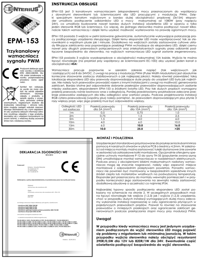 INSTRUKCJA OBSŁUGI ® EPM-153 jest 3 kanałowym wzmacniaczem (ekspanderem) mocy przeznaczonym do współpracy z dowolnymi sterownikami lub ściemniaczami dla LED pracującymi z modulacją PWM. Dzięki specjalnym kanałom wyjściowym o bardzo dużej obciążalności prądowej (3x15A) ekspander umożliwia podłączenie odbiorników LED o mocy maksymalnej aż 1080W (przy napięciu 24V), co umożliwia budowanie nawet bardzo dużych instalacji oświetlenia LED w oparciu o tylko jeden sterownik RGB lub ściemniacz. Co więcej, do jednego sterownika można podłączyć nawet kilkanaście takich wzmacniaczy i dzięki temu uzyskać możliwość wysterowania na prawdę ogromnych mocy. EPM-153 posiada 3 wejścia w pełni izolowane galwanicznie, automatycznie wykrywające polaryzację pracy podłączonego urządzenia sterującego. Dzięki temu ekspander LED może współpracować tak ze sterownikami o wspólnym plusie jak i minusie. Dodatkowo na wejściach zostały zastosowane cyfrowe układy filtrujące zakłócenia oraz poprawiające przebiegi PWM wchodzące do ekspandera LED, dzięki czemu nawet przy długich przewodach połączeniowych oraz zniekształceniach sygnału przez odbiorniki podłączone bezpośrednio do sterownika, na wyjściach wzmacniacza LED sygnał zostanie zregenerowany. EPM-153 Trzykanałowy wzmacniacz sygnału PWM EPM-153 posiada 3 wyjścia wysokoprądowe o obciążalności maksymalnej 15A każde. Wyjścia te można łączyć równolegle (na przykład przy współpracy ze ściemniaczami EC-10D) aby uzyskać jeden kanał o obciążalności 45A! Producent deklaruje zgodność wyrobu z dyrektywą EMC 2004/108/WE. Wyrób został oznakowany w wyniku przeprowadzonej procedury oceny zgodności. Wzmacniacz pracuje poprawnie w szerokim zakresie napięć (tak wejściowych jak i zasilających) od 8 do 24VDC. Z uwagi na pracę z modulacją PWM (Pulse Width Modulation) jest absolutnie konieczne stosowanie zasilaczy stabilizowanych o jak najlepszej jakości. Należy również przewidzieć taką lokalizację ekspandera LED aby przewody doprowadzające duże prądy do urządzeń LED były jak najkrótsze. Nie należy tych przewodów prowadzić razem z innymi instalacjami z uwagi na możliwość generowania zakłóceń. Bardzo istotne jest odpowiednie dobranie przekrojów przewodów doprowadzających zasilanie między zasilaczem, ekspanderem EPM-153 a źródłami światła LED. Przy tak dużych prądach wymagany przekrój przewodu rośnie lawinowo wraz z odległością. Poniżej przedstawiamy przykładowe zalecane przekroje przewodów zasilających dla kilku odległości oraz wartości prądu. Podczas projektowania instalacji RGB cztero-przewodowej (wspólny plus) należy pamiętać, że przewodem doprowadzającym plus płynie 3 razy większy prąd, więc jego przekrój musi być odpowiednio większy. Symbol ten wskazuje, że wyrób nie może znaleźć się wśród odpadów domowych. Usuwając odpadu z produktu w sposób zgodny z przepisami, pomożesz uniknąć ewentualnych, negatywnych skutków dla środowiska naturalnego i zdrowia ludzi, które mogłyby nastąpić wskutek nieprawidłowego obchodzenia się z tymi odpadami. W celu uzyskania dalszych informacji odnośnie recyklingu odpadów z tego produktu, skontaktuj się z władzami komunalnymi na swoim terenie, z właściwą służbą usuwania śmieci lub z dostawcą wyrobu. Odległość LED od zasilacza 1m 2m 5m 10m 15m 30m Przekrój przewodu dla 5A (mm2) 0.5 0.75 1.5 4.0 6.0 10.0 Przekrój przewodu dla 10A (mm2) 0.75 1.5 4.0 6.0 10.0 25.0 Przekrój przewodu dla 15A (mm2) 1.0 2.5 6.0 10.0 16.0 >25 MONTAŻ I POŁĄCZENIA DEKLARACJA ZGODNOŚCI WE NR 5/2012 Producent: Enterius - Krzysztof Ratyński Os. Kolorowe 10 31-969 Kraków tel: 12 644 64 70 Deklarujemy z pełną odpowiedzialnością, że produkowany przez nas wyrób pod nazwą: Nazwa: Wzmacniacz dla oświetlenia LED. Urządzenie jest standardowo przystosowane do przykręcenia śrubami M4 za pomocą 4 narożnych otworów w płytce PCB o średnicy 4,2mm. W zależności od miejsca montażu można zastosować tulejki dystansowe (nie zawarte w zestawie) lub zatrzaskowe kołki montażowe. Opcjonalnie oferujemy specjalne uchwyty montażowe P-12 do szyny TH-35 (popularnie zwana szyną DIN) umożliwiające montaż wzmacniacza w rozdzielniach elektrycznych. Podczas pracy z obciążeniami bliskimi maksymalnych radiatory wzmacniacza mogą się znacznie nagrzewać, należy więc zapewnić miejsce montażowe z odpowiednim przepływem powietrza. Ponadto wzmacniacz nie powinien być montowany w bezpośrednim sąsiedztwie innych źródeł ciepła lub materiałów wrażliwych na podwyższoną temperaturę. Ekspander jest przeznaczony do montażu wewnątrz pomieszczeń i w przypadku konieczności jego zastosowania na zewnątrz należy zastosować dodatkową obudowę o szczelności co najmniej IP54. Najbardziej typowy sposób podłączenia ekspandera LED został pokazany na schemacie na stronie 2. W szczególnych przypadkach można łączyć równolegle tak wejścia (1,2,3) jak i wyjścia (1,2,3) urządzenia, choć w przypadku dużych instalacji wymagających dużej mocy zalecamy wykonanie instalacji rozproszonej w celu ograniczenia płynących w pojedynczych przewodach prądów. Pozwoli to również na stosowanie przewodów o mniejszych przekrojach oraz ograniczenie zakłóceń generowanych podczas przełączania stopni mocy przy modulacji PWM. Opis: Uniwersalny wzmacniacz dla oświetlenia LED - EPM-153. Modele: EPM-153 do którego odnosi się niniejsza deklaracja, jest zgodny z dyrektywami: - dyrektywa EMC 2004/108/WE - dyrektywa RoHS 2002/95/WE - dyrektywa WEEE 2002/96/WE - dyrektywa ogólnego bezpieczeństwa produktów 2001/95/WE - dyrektywa ekoprojekt 2005/32/WE oraz spełnia wymagania zasadnicze norm: - w zakresie kompatybilności elektromagnetycznej PN-EN 55014-1:2012, PN-EN 55014-2:1999, PN-EN 55022:2011, PN-EN 55024:2011, PN-EN 61000-3-2:2007, PN-EN 61000-3-3:2011, PN-EN 61000-4-2:2011, PN-EN 61000