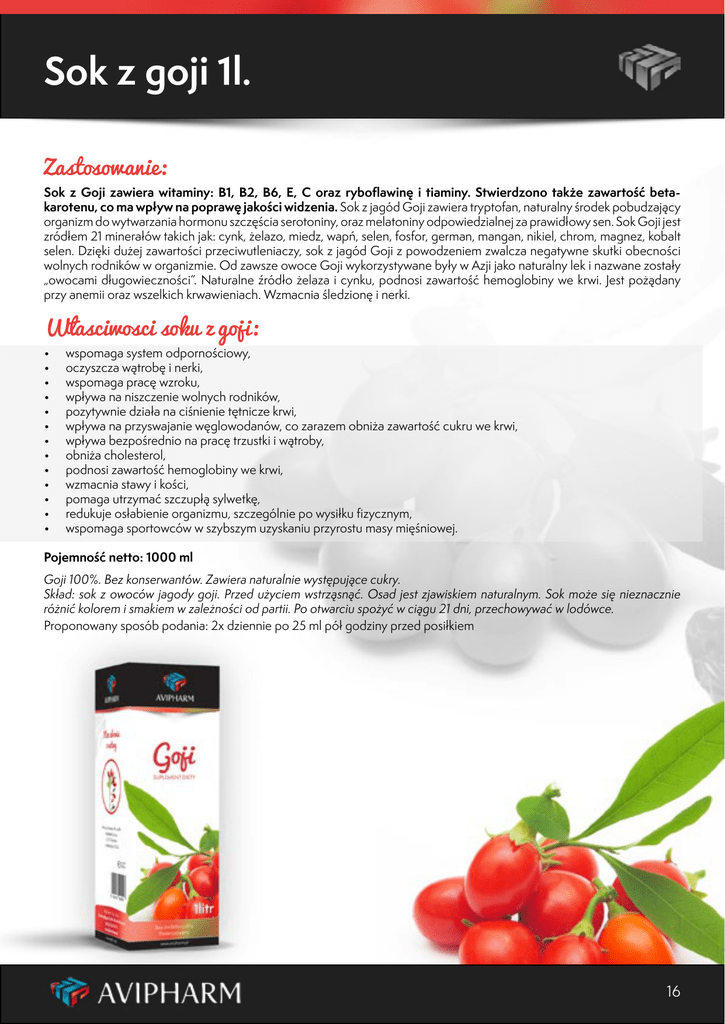 Sok z goji 1l. Zastosowanie: Sok z Goji zawiera witaminy: B1, B2, B6, E, C oraz ryboflawinę i tiaminy. Stwierdzono także zawartość betakarotenu, co ma wpływ na poprawę jakości widzenia. Sok z jagód Goji zawiera tryptofan, naturalny środek pobudzający organizm do wytwarzania hormonu szczęścia serotoniny, oraz melatoniny odpowiedzialnej za prawidłowy sen. Sok Goji jest zródłem 21 minerałów takich jak: cynk, żelazo, miedz, wapń, selen, fosfor, german, mangan, nikiel, chrom, magnez, kobalt selen. Dzięki dużej zawartości przeciwutleniaczy, sok z jagód Goji z powodzeniem zwalcza negatywne skutki obecności wolnych rodników w organizmie. Od zawsze owoce Goji wykorzystywane były w Azji jako naturalny lek i nazwane zostały „owocami długowieczności”. Naturalne źródło żelaza i cynku, podnosi zawartość hemoglobiny we krwi. Jest pożądany przy anemii oraz wszelkich krwawieniach. Wzmacnia śledzionę i nerki. Własciwosci soku z goji: • • • • • • • • • • • • • wspomaga system odpornościowy, oczyszcza wątrobę i nerki, wspomaga pracę wzroku, wpływa na niszczenie wolnych rodników, pozytywnie działa na ciśnienie tętnicze krwi, wpływa na przyswajanie węglowodanów, co zarazem obniża zawartość cukru we krwi, wpływa bezpośrednio na pracę trzustki i wątroby, obniża cholesterol, podnosi zawartość hemoglobiny we krwi, wzmacnia stawy i kości, pomaga utrzymać szczupłą sylwetkę, redukuje osłabienie organizmu, szczególnie po wysiłku fizycznym, wspomaga sportowców w szybszym uzyskaniu przyrostu masy mięśniowej. Pojemność netto: 1000 ml Goji 100%. Bez konserwantów. Zawiera naturalnie występujące cukry. Skład: sok z owoców jagody goji. Przed użyciem wstrząsnąć. Osad jest zjawiskiem naturalnym. Sok może się nieznacznie różnić kolorem i smakiem w zależności od partii. Po otwarciu spożyć w ciągu 21 dni, przechowywać w lodówce. Proponowany sposób podania: 2x dziennie po 25 ml pół godziny przed posiłkiem 16