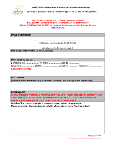 ANKIETA Lokalnej Organizacji Turystycznej Mazowsza Zachodniego z siedzibą w Żyrardowie przy ul. Limanowskiego 45, lok. nr 201, 96-300 Żyrardów CHCEMY PRZYCIĄGNĄĆ TURYSTÓW DO NASZEGO REGIONU POMÓŻ NAM – WYPEŁNIJ ANKIETĘ – SKORZYSTAMY NA TYM WSZYSCY WERSJA ELEKTRONICZNA ANKIETY (edytowalna) do pobrania bezpośrednio pod adresem www.lotmz.org DANE PODMIOTU .……………………………………………………………………………… (instytucja, organizacja, podmiot, firma) …………………………………………………………………………………………………… adres (wraz z kodem pocztowym) Dane kontaktowe (tel., e-mail, www): Dni i godziny pracy: poniedziałek: …………..……, wtorek: ….……………., środa ……………, czwartek ……..…………, piątek: …………………….., sobota: ………….., niedziela: …………….., dodatkowe uwagi: KRÓTKI OPIS (jedno zdanie charakteryzujące Państwa podmiot, instytucję czy też organizację) PREZENTACJA W TYM MIEJSCU PROSIMY O JAK NAJBOGATSZY OPIS - CZYM BOGATSZY I DŁUŻSZY TEKST – TYM CIEKAWSZY MATERIAŁ DO PROMOCJI W PRZYPADKU GDY DANA POZYCJA W ANKIECIE PAŃSTWA NIE DOTYCZY – PROSIMY O JEJ POMINIĘCIE Opis i ogólna charakterystyka – prezentacja pod kątem turystycznym (Państwa oferta, dlaczego turysta mógłby chcieć skorzystać z Państwa usług): podpis/parafka ………………………………………………………….. 1 ANKIETA Lokalnej Organizacji Turystycznej Mazowsza Zachodniego z siedzibą w Żyrardowie przy ul. Limanowskiego 45, lok. nr 201, 96-300 Żyrardów Bezpośrednia lokalizacja, dojazd do Państwa instytucji, organizacji, podmiotu Turysta, który jest po raz pierwszy w danym miejscu nie zna naszej miejscowości i może się zgubić. Postarajmy się opisem pomóc mu w szybkim odnalezieniu drogi do naszej instytucji, organizacji, firmy, kwatery. np.: 1) w miejscowości X jadąc od Żyrardowa droga krajową nr 50 skręcić w ulicę X, po przejechaniu 1300 m skręcić w mała polną drogę po prawej, budynek – kwatery agroturystyczne znajdują się 700 m dalej LUB 2) w centrum Żyrardowa, na Placu Jana Pawła II, w sercu zabytkowej XIX-wiecznej osady fabrycznej, w pobliżu fontanny). Czy jest coś wartego uwagi, co Państwo możecie jeszcze polecić turyście do zwiedzenia, zobaczenia w bezpośredniej okolicy? Czym więcej atrakcji i ciekawych miejsc dla turysty, tym potencjalnie jego większe zainteresowanie Państwa ofertą. Czasami wystarczy wspomnieć turyście, iż 50 m dalej jest bardzo mała kawiarnia, a tuż za rogiem lub 300 m dalej kąpielisko i wypożyczalnia rowerów lub nieopodal mała plaża nad rzeczką w lesie. Wydarzenia kulturalne i sportowe (wraz z jak najbardziej dokładnym opisem), których jesteście Państwo organizatorem lub też takowe są organizowane w Państwa najbliższej okolicy w przeciągu całego roku. Chodzi nam o wydarzenia, którymi chcielibyście się Państwo pochwalić (wraz z podaniem daty, ceny biletów i innych informacji o ile to możliwe w chwili wypełniania ankiety) podpis/parafka ………………………………………………………….. 2 ANKIETA Lokalnej Organizacji Turystycznej Mazowsza Zachodniego z siedzibą w Żyrardowie przy ul. Limanowskiego 45, lok. nr 201, 96-300 Żyrardów Realizowane w przeszłości lub aktualne działania związane z turystyką lub mogące wpłynąć na zainteresowanie turystów: Przyszłe planowane przez Państwa działania związane z turystyką lub mogące wpłynąć na zainteresowanie turystów: Posiadane własne materiały promocyjne, reklamowe, mapy, wizytówki, pamiątki itp. (prosimy o załączenie min. 1-2 egzemplarzy dla LOT MZ): Państwa uwagi, sugestie i wszelkie inne informacje, które chcielibyście Państwo przekazać Lokalnej Organizacji Turystycznej Mazowsza Zachodniego: podpis/parafka ………………………………………………………….. 3 ANKIETA Lokalnej Organizacji Turystycznej Mazowsza Zachodniego z siedzibą w Żyrardowie przy ul. Limanowskiego 45, lok. nr 201, 96-300 Żyrardów Prosimy o zaznaczenie symbolem X pozycji dotyczących Państwa podmiotu, będących w Państwa ofercie lub pozostających u Państwa elementem infrastruktury dostępnej dla potencjalnego turysty. INFORMACJE OGÓLNE GASTRONOMIA NOCLEGI obiekt czynny w sezonie (od ………do…..….………) np.: od 15.06 do 31.08 drobne przekąski obiekt czynny cały rok mała gastronomia płatność kartą kredytową obiad na zamówienie zniżka dla dzieci plac zabaw dla dzieci parking samochodowy własny dla klientów miejsce do zaparkowania auta w pobliżu garaż dla samochodów stojak na rowery Basen Sauna sala konferencyjna / bankietowa wypożyczalnia sprzętu sportowego wypożyczalnia rowerów boisko lub hala sportowa Siłownia Bilard komputer do dyspozycji klientów Internet stacjonarny Internet bezprzewodowy – Wifi stawki dla grup negocjowane ułatwienia dla osób niepełnosprawnych obiad (od godz. .…do godz...…) pełne wyżywienie dostępne o każdej porze recepcja czynna 24h klimatyzacja w pokojach noclegowych kuchnia przy kwaterze noclegowej aneks kuchenny przy kwaterze pokoje z łazienką i WC śniadanie w cenie Łazienka / WC wspólne na korytarzu możliwość zakupu połówek żywieniowych na drogę TV w pokoju napoje alkohol bar pub radio w pokoju grill mikrofalówka lodówka w pokoju kawiarnia ogólnodostępna lodówka restauracja pralka do dyspozycji stołówka klimatyzacja w części gastronomicznej inne ………………. (jakie?) inne ………………. (jakie?) taras ogródek dla gości inne ………………. (jakie?) możliwość rozbicia namiotu zniżki za długi pobyt ceny za noclegi od…….....do…......… pokoje 1 osobowe (ile:…..) inne ………………. (jakie?) pokoje 2 osobowe (ile:…..) inne ………………. (jakie?) pokoje 3 osobowe (ile:…..) inne ………………. (jakie?) pokoje wi