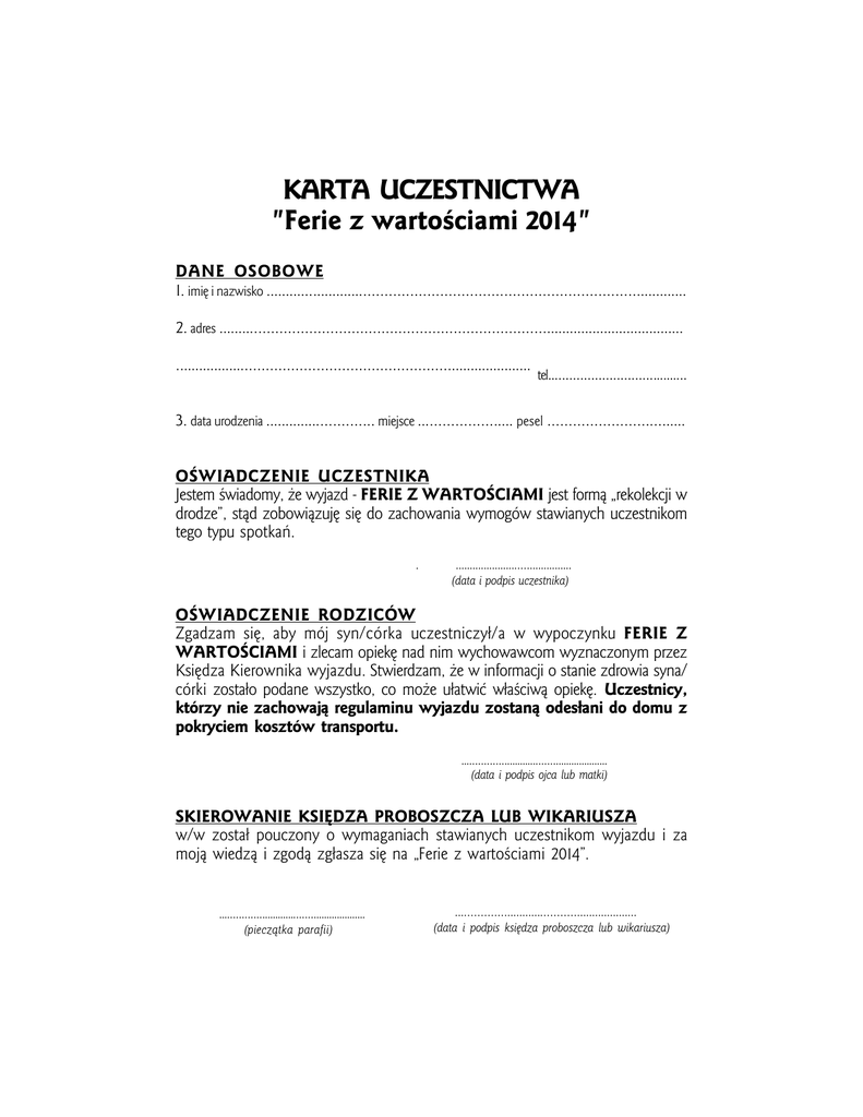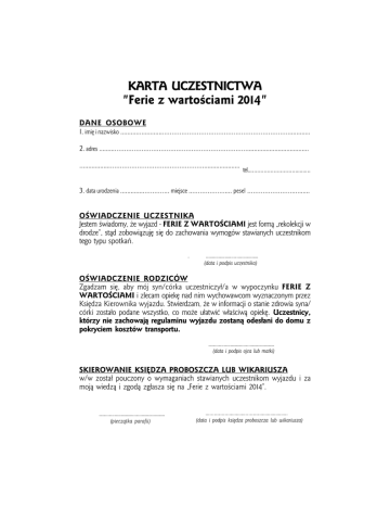 KARTA UCZESTNICTWA - Ferie z Bogiem 2014