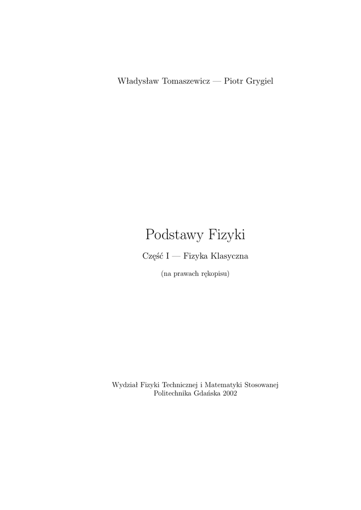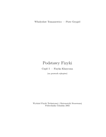 Władysław Tomaszewicz — Piotr Grygiel Podstawy Fizyki Część I — Fizyka Klasyczna (na prawach rękopisu) Wydział Fizyki Technicznej i Matematyki Stosowanej Politechnika Gdańska 2002 Rozdział 1 Wstęp 1.1 Międzynarodowy układ jednostek miar SI W fizyce dane zjawiska są opisywane za pomocą matematycznych praw, wiążących ze sobą poszczególne wielkości fizyczne. Przykładami wielkości fizycznych są długość, czas, masa, prędkość, siła, temperatura. Ogólnie przez wielkości fizyczne rozumiemy te własności ciał lub zjawisk, które można zmierzyć, tj. porównać ilościowo z tymi samymi własnościami innych ciał lub zjawisk. Pomiar wielkości fizycznej polega na wyznaczeniu liczbowego stosunku mierzonej wielkości do wielkości przyjętej za jednostkę. W zależności od przyjętego układu jednostek wielkości fizyczne możemy podzielić na wielkości podstawowe oraz wielkości pochodne. Dla wielkości podstawowych ustalane są ich wzorce, stanowiące jednostki wielkości podstawowych. Wielkości pochodne i ich jednostki określa się na na podstawie zależności matematycznych, wiążących je z wielkościami podstawowymi i ich jednostkami. Wybór wielkości podstawowych i ich wzorców jest równoważny z ustaleniem określonego układu jednostek. Należy zauważyć, że od wyboru układu jednostek zależy również postać niektórych wzorów, zwłaszcza w elektrodynamice. Załóżmy dla przykładu, że jako wielkości podstawowe wybraliśmy m. in. odległość x i czas t i odpowiednio nazwaliśmy ich jednostki metrem (oznaczenie 1 m) i sekundą (oznaczenie 1 s). Prędkość ciała jest wtedy wielkością pochodną, zdefiniowaną (w przypadku ruchu jednostajnego prostoliniowego) wzorem v = x/t. Za jednostkę prędkości przyjmujemy zatem prędkość takiego ruchu, podczas którego w ciągu jednostki czasu ciało przebywa drogę równą jednostce długości. Jednostką prędkości jest więc 1 m/1 s=1 m/s. Zwykle jednostkę miary danej wielkości fizycznej — jej wymiar oznacza1 2 WSTĘP my przez ujęcie tej wielkości w nawiasy kwadratowe, np. [x] = m, [t] = s. Ponieważ [v] = [x]/[t] = m/s, widać że jednostką prędkości jest istotnie 1 m/s. Obecnie w nauce i technice jest stosowanych kilka różnych układów jednostek. W niniejszym wykładzie będzie stosowany Międzynarodowy Układ Jednostek Miar, nazywany układem SI od skrótu francuskiego terminu Système International (Układ Międzynarodowy). Układ ten został ustalony przez Międzynarodowy Komitet Metrologii Ustawodawczej w Paryżu w 1958 roku. Układ SI ma 6 jednostek podstawowych i dwie jednostki uzupełniające (patrz tabela 1.1). Poniżej podamy uproszczone definicje tych jednostek. Lp. 1 2 3 4 5 6 7 8 Wielkość Długość Masa Czas Natężenie prądu elektr. Temperatura Światłość Kąt płaski Kąt bryłowy Jednostka metr kilogram sekunda amper kelwin kandela radian steradian Symbol m kg s A K cd rad sr Tabela 1.1: Metr jest długością równą 1 650 763, 73 długości fali w próżni promieniowania monochromatycznego o barwie pomarańczowej emitowanego przez atom kryptonu 86. Kilogram jest masą międzynarodowego wzorca przechowywanego w Międzynarodowym Biurze Miar w Sèvres pod Paryżem. Sekunda jest czasem trwania 9 192 631 770 okresów promieniowania odpowiadającego przejściu między dwoma nadsubtelnymi poziomami stanu podstawowego atomu cezu 133. Amper jest natężeniem prądu elektrycznego, który płynąc w dwóch nieskończenie długich równoległych przewodach, umieszczonych w próżni w odległości jednego metra, wywołuje między tymi przewodami siłę równą 2·10 −7 niutona na każdy metr długości przewodu. Kelwin jest jednostką temperatury termodynamicznej w skali, w której temperatura punktu potrójnego wody jest równa 273,16 K. Kandela jest światłością, którą ma w kierunku prostopadłym pole równe 16 · 10−5 m2 powierzchni ciała doskonale czarnego, promieniującego w temperaturze krzepnięcia platyny pod ciśnieniem normalnym. 3 MIĘDZYNARODOWY UKŁAD JEDNOSTEK MIAR SI W O a s S O r r a) b) Rysunek 1.1: Kąt płaski α wyrażony w radianach jest równy stosunkowi łuku s do promienia tego łuku r (rys. 1.1a): s α= . r (1.1) Radian jest kątem płaskim zawartym między dwoma promieniami koła, wycinającymi z okręgu tego koła łuk o długości równej promieniowi. Ponieważ dla pełnego kąta płaskiego długość łuku s = 2πr, pełny kąt płaski wynosi 2π rad. Kątem bryłowym nazywamy część przestrzeni ograniczoną prostymi poprowadzonymi z jednego punktu do wszystkich punktów dowolnej krzywej zamkniętej. Kąt bryłowy Ω jest równy stosunkowi powierzchni S, którą ten kąt wycina z powierzchni kuli o promieniu r, do kwadratu promienia tej kuli (rys. 1.1b): S Ω = 2. (1.2) r Steradian jest kątem bryłowym o wierzchołku w środku kuli, wycinającym z powierzchni tej kuli pole równe kwadratowi jej promienia. Ponieważ dla pełnego kąta bryłowego pole powierzchni kuli S = 4πr 2 , pełny kąt bryłowy wynosi 4π sr. Radian i steradian są jednostkami bezwymiarowymi i mogą być użwane w dowolnym układzie jednostek. Jeżeli mamy do czynienia z wartościami wielkości fizycznych znacznie większymi albo znacznie mniejszymi od ich jednostek, to w celu uniknięcia bardzo dużych lub bardzo małych liczb wprowadza się jednostki wtórne, będące wielokrotnościami lub podwielokrotnościami jednostek zasadniczych. Wielokrotność i podwielokrotność jednostki miary wyraża sie w układzie 4 WSTĘP dziesiętnym przez dodanie odpowiednio do nazwy lub oznaczenia jednostki miary następujących przedrostków lub ich oznaczeń (patrz tabl. 1.2). Przedr. tera giga mega kilo hekto deka — — Ozn. T G M k h da – – Wielokr. 1012 109 106 103 102 101 – – Przedr. decy centy mili mikro nano piko femto atto Ozn. d c m µ n p f a Podwiel. 10−1 10−2 10−3 10−6 10−9 10−12 10−15 10−18 Tabela 1.2: 1.2 1.2.1 Elementy rachu