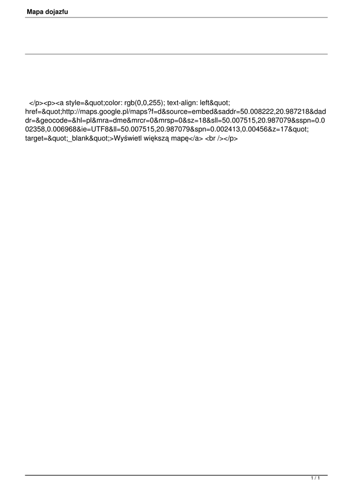Mapa dojazfu </p><p><a style="color: rgb(0,0,255); text-align: left" href="http://maps.google.pl/maps?f=d&source=embed&saddr=50.008222,20.987218&dad dr=&geocode=&hl=pl&mra=dme&mrcr=0&mrsp=0&sz=18&sll=50.007515,20.987079&sspn=0.0 02358,0.006968&ie=UTF8&ll=50.007515,20.987079&spn=0.002413,0.00456&z=17" target="_blank">Wyświetl większą mapę</a> <br /></p> 1/1