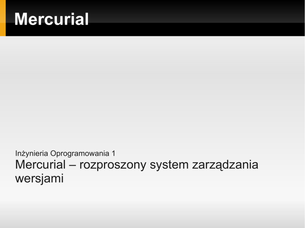 Mercurial Inżynieria Oprogramowania 1 Mercurial – rozproszony system zarządzania wersjami Plan zajęć 1. Wprowadzenie 2. Ćwiczenia 1. Linia poleceń + mercurial Architektura SVN – przypomnienie Źródło: http://hginit.com Architektura Mercuriala Źródło: http://hginit.com Mercurial – hg clone Pobieranie kopii repozytorium hg clone ssh://[email protected] repo updating to branch default 2 files updated, 0 files merged, 0 files removed Struktura repozytorium ls -a . .. .hg Mercurial – podstawowe operacje Tworzenie pliku w katalogu z repozytorium $ touch guac Dodawanie pliku do repozytorium $ hg add adding guac Commit ! $ hg commit Mercurial – podstawowe operacje Modyfikacja pliku Sprawdzanie statusu repozytorium $ hg status M guac Commit ! $ hg commit Aktualny obraz repozytorium Źródło: http://hginit.com Synchronizacja z głównym repo Wgrywanie zmian na serwer $ hg push pushing to http://joel.example.com:8000/ searching for changes adding changesets adding manifests adding file changes added 2 changesets with 2 changes to 1 files Obraz repo po operacji push Źródło: http://hginit.com Mercurial – log $hg log changeset: tag: user: date: summary: 6:218044334c4d tip Michal Thu Oct 06 Modyfikacja 5 changeset: user: date: summary: 5:79c9f9277890 Michal Thu Oct 06 Modyfikacja 4 Mercurial – branche Każda zmiana wprowadzona do repozytorium otrzymuje unikalny identyfikator - changeset $ hg log -l1 changeset: 4:a342a39e6ff0 user: Admin ... Każdy changeset ma swojego przodka. Dlatego historię zmian możemy przedstawić jako graf Mercurial – branche Rozgałęzienie tworzy się wtedy gdy dany changeset ma więcej niż jednego potomka. Po operacji łączenia rozgałęzień w repozytorium pojawi się changeset który posiada więcej niż jednego przodka. Rozgałęzienie w systemie Mercurial nie jest tak jak w przypadku systemu SVN kopią plików. Mercurial – branche Tworzenie nowego brancha $ hg branch eksperyment marked working directory as branch eksperyment Praca w nowym branchu $ $ … $ $ <zmiany w repo> hg commit <zmiany w repo> hg commit Mercurial – branche Mercurial – branche Łączenie branchy $ hg merge merging SomeClass.java 0 files updated, 1 files merged, 0 files removed (branch merge, don't forget to commit) Zmiana została zapisana w kopii roboczej, należy jeszcze wykonać operację commit $ hg ci -m "merge" Mercurial – branche Mercurial – tagi Tworzenie tagów $ hg tag "Wersja 0.1" Lista tagów $ hg tags tip Wersja 0.1 13:92e0e5086ff2 12:ae65cfad513d Informacja o tagach zapisywana jest w pliku $ cat .hgtags ae65cfad513da875102983d2aa2b0eac5b63acd6 Wersja 0.1 Mercurial – tagi W przeciwieństwie do systemy SVN w Mercurialu tag nie jest kopią plików Tag w systemie Mercurial jest etykietą przypisaną do danego changeseta Mercurial – sprawdź sam Tutorial: http://hginit.com Książka ”Mercurial: The Definitive Guide” http://hgbook.red-bean.com/ Repozytorium: http://bitbucket.com