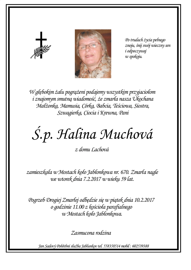Po trudach życia pełnego znoju, śnij swój wieczny sen i odpoczywaj w spokoju. W głębokim żalu pogrążeni podajemy wszystkim przyjaciołom i znajomym smutną wiadomość, że zmarła nasza Ukochana Małżonka, Mamusia, Córka, Babcia, Teściowa, Siostra, Szwagierka, Ciocia i Krewna, Pani Ś.p. Halina Muchová z domu Lachová zamieszkała w Mostach koło Jabłonkowa nr. 670. Zmarła nagle we wtorek dnia 7.2.2017 w wieku 59 lat. Pogrzeb Drogiej Zmarłej odbędzie się w piątek dnia 10.2.2017 o godzinie 11.00 z kościoła parafialnego w Mostach koło Jabłonkowa. Zasmucona rodzina Jan Sadový Pohřební služba Jablunkov tel. 558358514 mobil : 602539388