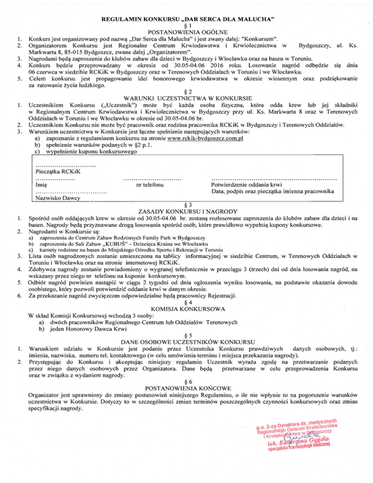 1. 2. 3. 4. 5. 1. 2. 3. REGULAMIN KONKURSU „DAR SERCA DLA MALUCHA" §1 POSTANOWIENIA OGÓLNE Konkurs jest organizowany pod nazwą „Dar Serca dla Malucha" i jest zwany dalej: "Konkursem". Organizatorem Konkursu jest Regionalne Centrum Krwiodawstwa i Krwiolecznictwa w Bydgoszczy, ul. Ks. Markwarta 8, 85-015 Bydgoszcz, zwane dalej „Organizatorem". Nagrodami będą zaproszenia do klubów zabaw dla dzieci w Bydgoszczy i Włocławku oraz na basen w Toruniu. Konkurs będzie przeprowadzany w okresie od 30.05-04.06 2016 roku. Losowanie nagród odbędzie się dnia 06 czerwca w siedzibie RCKiK w Bydgoszczy oraz w Terenowych Oddziałach w Toruniu i we Włocławku. Celem konkursu jest propagowanie idei honorowego krwiodawstwa w okresie wiosennym oraz podziękowanie za ratowanie życia ludzkiego. §2 WARUNKI UCZESTNICTWA W KONKURSIE Uczestnikiem Konkursu („Uczestnik") może być każda osoba fizyczna, która odda krew lub jej składniki w Regionalnym Centrum Krwiodawstwa i Krwiolecznictwa w Bydgoszczy przy ul. Ks. Markwarta 8 oraz w Terenowych Oddziałach w Toruniu i we Włocławku w okresie od 30.05-04.06 br. Uczestnikiem Konkursu nie może być pracownik oraz rodzina pracownika RCKiK w Bydgoszczy i Terenowych Oddziałów. Warunkiem uczestnictwa w Konkursie jest łączne spełnienie następujących warunków: a) zapoznanie z regulaminem konkursu na stronie www.rckik-bydgoszcz.com.pl b) spełnienie warunków podanych w §2 p. 1. c) wypełnienie kuponu konkursowego Pieczątka RCKiK Imię nr telefonu Potwierdzenie oddania krwi Data, podpis oraz pieczątka imienna pracownika Nazwisko Dawcy 1. 2. §3 ZASADY KONKURSU I NAGRODY Spośród osób oddających krew w okresie od 30.05-04.06 br. zostaną rozlosowane zaproszenia do klubów zabaw dla dzieci i na basen. Nagrody będą przyznawane drogą losowania spośród osób, które prawidłowo wypełnią kupony konkursowe. Nagrodami w Konkursie są: a) b) c) 3. zaproszenia do Centrum Zabaw Rodzinnych Family Park w Bydgoszczy zaproszenia do Sali Zabaw „KUBUŚ" - Dziecięca Kraina we Włocławku karnety rodzinne na basen do Miejskiego Ośrodku Sportu i Rekreacji w Toruniu Lista osób nagrodzonych zostanie umieszczona na tablicy informacyjnej w siedzibie Centrum, w Terenowych Oddziałach w Toruniu i Włocławku oraz na stronie internetowej RCKiK. 4. Zdobywca nagrody zostanie powiadomiony o wygranej telefonicznie w przeciągu 3 (trzech) dni od dnia losowania nagród, na wskazany przez niego nr telefonu na kuponie konkursowym. 5. Odbiór nagród powinien nastąpić w ciągu 2 tygodni od dnia ogłoszenia wyniku losowania, na podstawie okazania dowodu osobistego, który pozwoli potwierdzić oddanie krwi w danym okresie. 6. Za przekazanie nagród zwycięzcom odpowiedzialne będą pracownicy Rejestracji. §4 KOMISJA KONKURSOWA W skład Komisji Konkursowej wchodzą 3 osoby: a) dwóch pracowników Regionalnego Centrum lub Oddziałów Terenowych b) jeden Honorowy Dawca Krwi §5 DANE OSOBOWE UCZESTNIKÓW KONKURSU 1. Warunkiem udziału w Konkursie jest podanie przez Uczestnika Konkursu prawdziwych danych osobowych, tj.: imienia, nazwiska, numeru tel. kontaktowego (w celu umówienia terminu i miejsca przekazania nagrody). 2. Przystępując do Konkursu i akceptując niniejszy regulamin Uczestnik wyraża zgodę na przetwarzanie podanych przez niego danych osobowych przez Organizatora. Dane będą przetwarzane w celu przeprowadzenia Konkursu oraz w związku z wydaniem nagrody. §6 POSTANOWIENIA KOŃCOWE Organizator jest uprawniony do zmiany postanowień niniejszego Regulaminu, o ile nie wpłynie to na pogorszenie warunków uczestnictwa w Konkursie. Dotyczy to w szczególności zmian terminów poszczególnych czynności konkursowych oraz zmian specyfikacji nagrody.