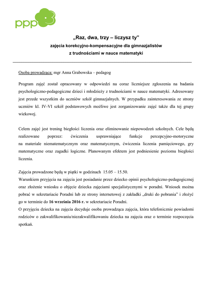 „Raz, dwa, trzy – liczysz ty” zajęcia korekcyjno-kompensacyjne dla gimnazjalistów z trudnościami w nauce matematyki _________________________________________________________________________________ Osoba prowadząca: mgr Anna Grabowska – pedagog Program zajęć został opracowany w odpowiedzi na coraz liczniejsze zgłoszenia na badania psychologiczno-pedagogiczne dzieci i młodzieży z trudnościami w nauce matematyki. Adresowany jest przede wszystkim do uczniów szkół gimnazjalnych. W przypadku zainteresowania ze strony uczniów kl. IV-VI szkół podstawowych możliwe jest zorganizowanie zajęć także dla tej grupy wiekowej. Celem zajęć jest trening biegłości liczenia oraz eliminowanie niepowodzeń szkolnych. Cele będą realizowane poprzez: ćwiczenia usprawniające funkcje percepcyjno-motoryczne na materiale niematematycznym oraz matematycznym, ćwiczenia liczenia pamięciowego, gry matematyczne oraz zagadki logiczne. Planowanym efektem jest podniesienie poziomu biegłości liczenia. Zajęcia prowadzone będą w piątki w godzinach 15.05 – 15.50. Warunkiem przyjęcia na zajęcia jest posiadanie przez dziecko opinii psychologiczno-pedagogicznej oraz złożenie wniosku o objęcie dziecka zajęciami specjalistycznymi w poradni. Wniosek można pobrać w sekretariacie Poradni lub ze strony internetowej z zakładki „druki do pobrania” i złożyć go w terminie do 16 września 2016 r. w sekretariacie Poradni. O przyjęciu dziecka na zajęcia decyduje osoba prowadząca zajęcia, która telefonicznie powiadomi rodziców o zakwalifikowaniu/niezakwalifikowaniu dziecka na zajęcia oraz o terminie rozpoczęcia spotkań.