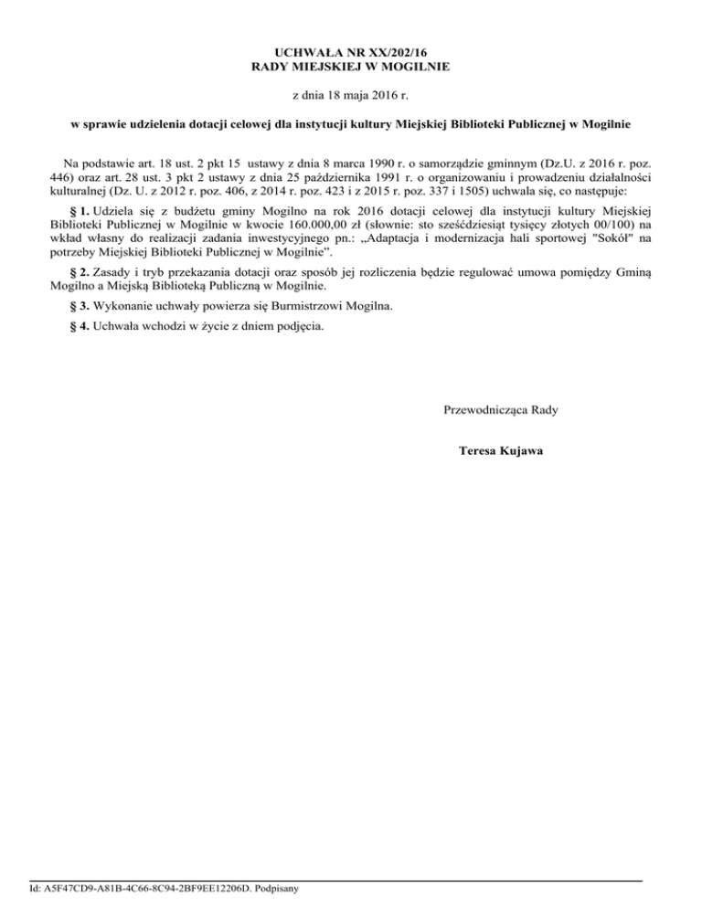 UCHWAŁA NR XX/202/16 RADY MIEJSKIEJ W MOGILNIE z dnia 18 maja 2016 r. w sprawie udzielenia dotacji celowej dla instytucji kultury Miejskiej Biblioteki Publicznej w Mogilnie Na podstawie art. 18 ust. 2 pkt 15 ustawy z dnia 8 marca 1990 r. o samorządzie gminnym (Dz.U. z 2016 r. poz. 446) oraz art. 28 ust. 3 pkt 2 ustawy z dnia 25 października 1991 r. o organizowaniu i prowadzeniu działalności kulturalnej (Dz. U. z 2012 r. poz. 406, z 2014 r. poz. 423 i z 2015 r. poz. 337 i 1505) uchwala się, co następuje: § 1. Udziela się z budżetu gminy Mogilno na rok 2016 dotacji celowej dla instytucji kultury Miejskiej Biblioteki Publicznej w Mogilnie w kwocie 160.000,00 zł (słownie: sto sześćdziesiąt tysięcy złotych 00/100) na wkład własny do realizacji zadania inwestycyjnego pn.: „Adaptacja i modernizacja hali sportowej "Sokół" na potrzeby Miejskiej Biblioteki Publicznej w Mogilnie”. § 2. Zasady i tryb przekazania dotacji oraz sposób jej rozliczenia będzie regulować umowa pomiędzy Gminą Mogilno a Miejską Biblioteką Publiczną w Mogilnie. § 3. Wykonanie uchwały powierza się Burmistrzowi Mogilna. § 4. Uchwała wchodzi w życie z dniem podjęcia. Przewodnicząca Rady Teresa Kujawa Id: A5F47CD9-A81B-4C66-8C94-2BF9EE12206D. Podpisany UZASADNIENIE DO UCHWAŁY Nr XX/202/16 RADY MIEJSKIEJ W MOGILNIE z dnia 18 maja 2016 r. w sprawie udzielenia dotacji celowej dla instytucji kultury Miejskiej Biblioteki Publicznej w Mogilnie Zgodnie z przepisami zawartymi w rozdziale 3 ustawy z dnia 25 października 1991 r. o organizowaniu i prowadzeniu działalności kulturalnej (Dz. U. z 2012 r. poz. 406 ze zm.) instytucje kultury gospodarują samodzielnie przydzieloną i nabytą częścią mienia oraz prowadzą samodzielną gospodarkę finansową na podstawie planu działalności tej instytucji, ustalonego przez jej dyrektora, z zachowaniem wysokości dotacji ustalonej przez organizatora. Jak wynika z treści art. 28 ust. 3: „Organizator przekazuje instytucji kultury środki finansowe w formie dotacji: 1) podmiotowej na dofinansowanie działalności bieżącej w zakresie realizowanych zadań statutowych, w tym na utrzymanie i remonty obiektów, 2) celowej na finansowanie lub dofinansowanie kosztów realizacji inwestycji, 3) celowej na realizację wskazanych zadań i programów.” Środki w wysokości 160.000,00 zł na realizację zadania zostały zaplanowane w budżecie gminy Mogilno na rok 2016 w klasyfikacji budżetowej: dział 921, rozdział 92116, paragraf 6220. Id: A5F47CD9-A81B-4C66-8C94-2BF9EE12206D. Podpisany