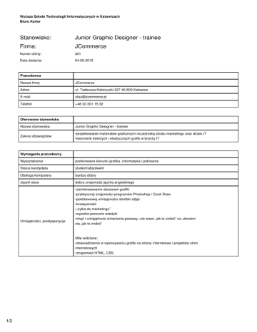 Wyższa Szkoła Technologii Informatycznych w Katowicach Biuro Karier Stanowisko: Junior Graphic Designer - trainee Firma: JCommerce Numer oferty: 301 Data dodania: 04-05-2015 Pracodawca Nazwa firmy JCommerce Adres ul. Tadeusza Kościuszki 227 40-600 Katowice E-mail [email protected] Telefon +48 32 201 15 32 Oferowane stanowisko Nazwa stanowiska Zakres obowiązków Junior Graphic Designer - trainee •projektowanie materiałów graficznych na potrzeby działu marketingu oraz działu IT •tworzenie świeżych i elastycznych grafik w branży IT Wymagania pracodawcy Wykształcenie preferowane kierunki grafika, informatyka i pokrewne Status kandydata student/absolwent Obsługa komputera bardzo dobry Języki obce dobra znajomość języka angielskiego •zainteresowanie obszarem grafiki •praktycznej znajomości programów Photoshop i Corel Draw •podstawowej umiejętności obróbki zdjęć •kreatywność •„żyłka do marketingu” Umiejętności, predyspozycje •wysokie poczucie estetyki •chęć i umiejętność zmieniania postawy „nie wiem, jak to zrobić” na „dowiem się, jak to zrobić” Mile widziane: •doświadczenie w wykonywaniu grafiki na strony internetowe i projektów stron internetowych •znajomość HTML, CSS 1/2 Warunki pracy Wymagane dokumenty CV, mile widziane portfolio Forma umowy staż Czas zatrudnienia 3 miesiące Godzinowy wymiar pracy minimum 30 godzin w tygodniu Data rozpoczęcia pracy 2015-06-01 Inne świadczenia Rekrutacja Termin i forma zgłoszenia do 15.06.2015 Sposób kontaktowania się z firmą [email protected] Oferujemy: • dobry start kariery – na koniec praktyki otrzymasz list referencyjny oraz masz dużą szanse pozostać z nami na stałe • unikalne kompetencje – doświadczenie w realizacji projektów graficznych w branży IT • różnorodne projekty – praca przy zróżnicowanych projektach graficznych na potrzeby działu marketingu i IT • duże możliwości rozwoju – różnorodne zadania, możliwość konfrontowania teorii z praktyką, udział w szkoleniach wewnętrznych, indywidualna opieka mentora • bardzo dobre warunki pracy – elastyczne godziny pracy, przyjazna atmosfera Dodatkowe informacje Więcej o JCommerce: Stabilność i doświadczenie – 10 lat na rynku oraz ponad 250 zrealizowanych projektów Biura w 6 lokalizacjach w całej Polsce: Katowice, Bielsko – Biała, Kraków, Warszawa, Rzeszów, Poznań Ponad 200 zadowolonych pracowników Stałe i zgrane zespoły – mała rotacja pracowników Status rzetelnego pracodawcy, czyli jasne warunki zatrudnienia, szacunek do czasu wolnego W tytule e-maila prosimy wpisać wyłącznie: - Graphic staż /Katowice Zastrzegamy sobie prawo do odpowiedzi tylko na wybrane aplikacje. 2/2