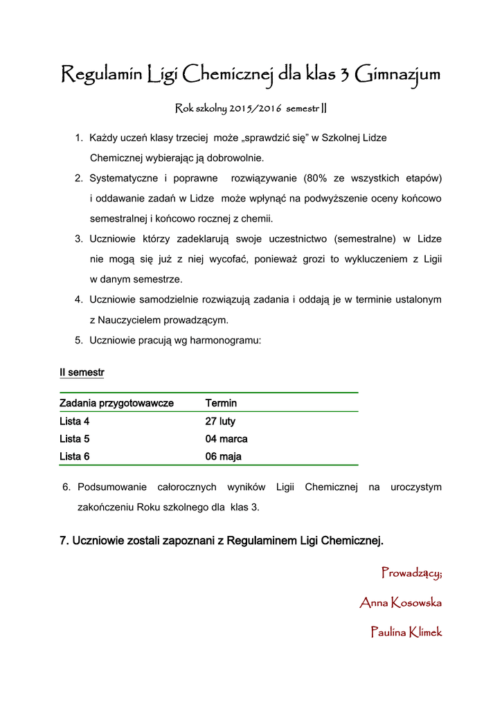 Regulamin Ligi Chemicznej dla klas 3 Gimnazjum