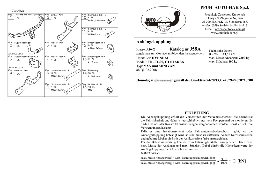 PPUH AUTO-HAK Sp.J. Zubehör: Produkcja Zaczepów Kulowych Henryk & Zbigniew Nejman 76-200 SŁUPSK ul. Słoneczna 16K tel/fax (059) 8-414-414; 8-414-413 E-mail: [email protected] www.autohak.com.pl Anhängekupplung J58A Art.nr-KL1J58A Art.nr-BL1J58A Klasse: A50-X Katalog nr zugelassen zur Montage an folgenden Fahrzeugtypen: Hersteller: HYUNDAI Modell: H1 / H300, H1 STAREX Typ: VAN und MINIVAN ab Bj. 02.2008 Technische Daten: D – Wert : 13,51 kN Max. Masse Anhänger: 2300 kg Max. Stützlast: 100 kg Homologationsnummer gemäß der Direktive 94/20/EG: e20*94/20*0710*00 EINLEITUNG Die Anhängekupplung erfüllt die Vorschriften der Verkehrssicherheit. Sie beeinflusst die Fahrsicherheit und daher ist ausschließlich nur vom Fachpersonal zu montieren. Es dürfen keinesfalls Konstruktionsänderungen vorgenommen werden. Sonst erlischt die Verwendungszulassung. Falls es eine Isolationsschicht oder Fahrzeugunterbodenschutz gibt, wo die Anhängerkupplung befestigt wird, so sind diese zu entfernen. Andere Karosseriestellen und gebohrte Löcher sind mit der Antikorrosionsfarbe anzustreichen. Für die Belastungswerte gelten die vom Fahrzeughersteller angegebenen Daten bzw. max. Masse der Anhänger und max. Stützlast. Dabei dürfen die Höchstkennwerte der Anhängekupplung nicht überschritten werden. D-Wert Formel: max. Masse Anhänger [kg] x Max. Fahrzeuggesamtgewicht [kg] max. Masse Anhänger [kg] + Max. Fahrzeuggesamtgewicht [kg] X 9,81 = 1000 D [kN] MONTAGE - und BETRIEBSANLEITUNG DER ANHÄNGEKUPPLUNG 7 12 8 A 10 12 8 12 11 11 4 12 A 11 1 6 12 Anbauanleitung 1. Das Ersatzrad wegnehmen. 2. In den Fahrzeugrahmen von unten die vorhandenen Löcher (Pos. A) finden. An diesen Stellen die Vorrichtungen (Winkelhalter) (Pos. 6 u. 7) mit den Schrauben M12x1,25x40mm (Pos.10), wie auf der Zeichnung gezeigt verschrauben. 3. Die Seitenhalter (Pos. 4 u. 5) von innen an den Fahrzeugrahmen anlegen und leicht mit den mitgelieferten Schrauben M12x130mm (Pos.8) und M12x120mm (Pos. 9), wie auf der Zeichnung gezeigt, verschrauben. 4. Einen Teil im mittleren Halter der Stoßstange und den Metalltragarm (5mm abschneiden), wie auf der Zeichnung 2 gezeigt, abschneiden. 5. Die Kupplungskugel gemäß der Anbauanleitung der Anhängekupplung mit dem schnelldemontierbaren Aufsatz anbringen. Den Steckdosenhalter (Pos. 3) mit verschrauben. 6. Alle Schrauben gemäß den Angaben in der Tabelle festziehen. 7. Die Elektroinstallation gemäß der Anschlussanleitung des Herstellers anschließen. 8. Falls nötig, den beschädigten Farbanstrich ausbessern. Zeichnung 2 9 8 10 5 11 3 Abschneiden Abschneiden 2 Die Anhängekupplung (Katalognummer J58A) ist für folgende Fahrzeugtypen zugelassen: HYUNDAI H1/H300, H1 STAREX, VAN und MINIBUS, ab Bj.02.2008, dient zum ziehen der Anhänger mit der Gesamtlast von 2300 kg und der Kugelstützlast von max.100 kg. VON DEM HERSTELLER Die Zuverlässigkeit der Anhängekupplung ist jedoch auch von der ordnungsgemäßen Montage und der richtigen Nutzung abhängig. Daher werden Sie gebeten, sorgfältig die folgende Montageanleitung zu lesen und sich an die entsprechenden Anweisungen zu beachten. Die Anhängekupplung muss an den vom Fahrzeughersteller vorgeschriebenen Befestigungsstellen montiert werden. Drehmomente für Schrauben und Muttern 8.8: M6 - 11 Nm M 8 - 25 Nm M 10 - 50 Nm M 12 - 87 Nm M 14 - 138 Nm M16 - 210 Nm ACHTUNG Nach dem Anbau der Anhängekupplung sind die nationalen Vorschriften zur Anbauabnahme und zur Änderung der Fahrzeugpapiere zu beachten. Das Fahrzeug sollte mit seitlichen Blinkern und Rückspiegeln, deren Abstand mindestens der Anhängerbreite entspricht, ausgestattet werden. Alle Befestigungsschrauben sind nach ca. 1 000 km Anhängerbetrieb zu prüfen und nachzuziehen. Die Kugel der Anhängekupplung ist sauber zu halten und zu fetten. (D) (CZ) (F) (GB) (PL) (SK) Der Freiraum nach Anhang VII, Abbildung 30 der Richtlinie 94/20/EG ist zu gewährleisten. Volný prostor ve smyslu Přílohy VII,obr. 30 Směrnice č. 94/20/EG musí být zaručen. L´espace libre doit être garanti conformément à ľannexe VII, illustracion 30 de la directive 94/20/ CE. The clearance specified in apendix VII, diagram 30 of guideline 94/20/EC must be guaranteed. Zagwarantować swobodną przestrzeń zgodnie z załącznikiem VII, rysunek 30 dyrektywy 94/20/CE. Volný priestor v zmysle Prílohy VII, obr. 30 Smernice 94/20/EC musí byť zaručená. (D) (CZ) (F) (GB) (PL) (SK) * bei zulässigem Gesamtgewicht des Fahrzeuges * při celkové přípustné hmotnosti vozidla * pour poids total en charge autorizé du véhicule * at gross vehicle weight rating * przy dopuszczalnym ciężarze całkowitym pojazdu * pri celkovej prípustnej hmotnosti vozidla FITTING INSTRUCTION Clamp mark in acc. with ISO PN 1 L 2 + 3 31 4 R 5 58R 6 54 7 58L Cables joining 7 Left directional lights Rear fog lights Ground Right directional lights Right side parking lights Stoplights Left side parking lights The instruction of the assembly 12 8 A 10 12 8 12 11 11 4 12 A 11 1 6 12 9 8 10 1. Take out a spare wheel. 2. Underneath the car find original made holes in the frame of chassis (pos. A). Through this holes fix loosely angle bars (pos. 6 and 7) using bolts M12x1,25x40mm (pos. 10) as shown in the drawing. 3. Put side brackets (pos. 4 and 5) to interior side of the frame of chassis and fix it loosely using bolts M12x130mm (pos. 8) and M12x120mm (pos. 9) as shown in the drawing. 4. Cut out a fragment of central handle fastening a bumper together with metal handle (cut out 5mm), see figure 2. 5. Between installed elements put main bar of the towbar (pos. 1) and fix using bolts M12x40mm (pos. 11) as shown in the drawing. 6. Fix body of the automat (pos. 10) and the socket plate (pos. 3) using bolts M12x25mm (pos. 11) from accessories. Place tow-ball (pos. 2) according to supplied instruction. 7. Tighten all bolts according to the torque shown in the table. 8. Connect electric wires of 7-poles socket according to the instruction of the car