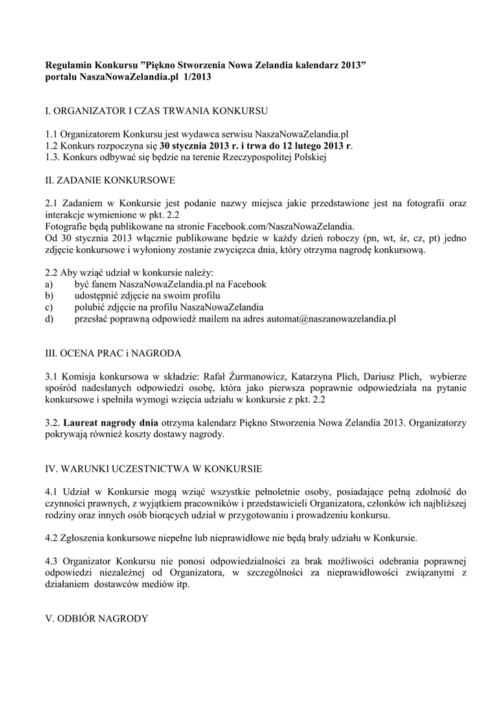 Regulamin Konkursu ”Piękno Stworzenia Nowa Zelandia kalendarz 2013” portalu NaszaNowaZelandia.pl 1/2013 I. ORGANIZATOR I CZAS TRWANIA KONKURSU 1.1 Organizatorem Konkursu jest wydawca serwisu NaszaNowaZelandia.pl 1.2 Konkurs rozpoczyna się 30 stycznia 2013 r. i trwa do 12 lutego 2013 r. 1.3. Konkurs odbywać się będzie na terenie Rzeczypospolitej Polskiej II. ZADANIE KONKURSOWE 2.1 Zadaniem w Konkursie jest podanie nazwy miejsca jakie przedstawione jest na fotografii oraz interakcje wymienione w pkt. 2.2 Fotografie będą publikowane na stronie Facebook.com/NaszaNowaZelandia. Od 30 stycznia 2013 włącznie publikowane będzie w każdy dzień roboczy (pn, wt, śr, cz, pt) jedno zdjęcie konkursowe i wyłoniony zostanie zwycięzca dnia, który otrzyma nagrodę konkursową. 2.2 Aby wziąć udział w konkursie należy: a) być fanem NaszaNowaZelandia.pl na Facebook b) udostępnić zdjęcie na swoim profilu c) polubić zdjęcie na profilu NaszaNowaZelandia d) przesłać poprawną odpowiedź mailem na adres [email protected] III. OCENA PRAC i NAGRODA 3.1 Komisja konkursowa w składzie: Rafał Żurmanowicz, Katarzyna Plich, Dariusz Plich, wybierze spośród nadesłanych odpowiedzi osobę, która jako pierwsza poprawnie odpowiedziała na pytanie konkursowe i spełniła wymogi wzięcia udziału w konkursie z pkt. 2.2 3.2. Laureat nagrody dnia otrzyma kalendarz Piękno Stworzenia Nowa Zelandia 2013. Organizatorzy pokrywają również koszty dostawy nagrody. IV. WARUNKI UCZESTNICTWA W KONKURSIE 4.1 Udział w Konkursie mogą wziąć wszystkie pełnoletnie osoby, posiadające pełną zdolność do czynności prawnych, z wyjątkiem pracowników i przedstawicieli Organizatora, członków ich najbliższej rodziny oraz innych osób biorących udział w przygotowaniu i prowadzeniu konkursu. 4.2 Zgłoszenia konkursowe niepełne lub nieprawidłowe nie będą brały udziału w Konkursie. 4.3 Organizator Konkursu nie ponosi odpowiedzialności za brak możliwości odebrania poprawnej odpowiedzi niezależnej od Organizatora, w szczególności za nieprawidłowości związanymi z działaniem dostawców mediów itp. V. ODBIÓR NAGRODY 5.1 Zwycięzca otrzyma nagrodę po rozstrzygnięciu Konkursu , drogą pocztową na podany przez siebie adres. 5.3 Organizator nie przewiduje wymiany nagrody na inną. 5.4 Za wygrane nagrody rzeczowe nie przysługuje ekwiwalent pieniężny ani rzeczowy, laureaci Konkursu nie mają prawa scedować nagrody na inne osoby. 5.5 Organizator nie ponosi odpowiedzialności za brak możliwości dokonania zgłoszenia konkursowego z przyczyn leżących po stronie dostawców mediów. 5.6. Organizator skontaktuje się ze zwycięzcą Konkursu w formie mailowej na adres, z którego dokonano zgłoszenia do Konkursu, z informacją o wygranej do 15 dni po zakończeniu Konkursu. Warunkiem niezbędnym do otrzymania nagrody jest przekazanie przez zwycięzcę Konkursu swoich danych osobowych określonych w niniejszym Regulaminie, które będą przetwarzane wyłącznie w zakresie określonym w pkt. 8.4 Regulaminu. W przypadku, gdy zwycięzca Konkursu nie skontaktuje się z Organizatorem w terminie wskazanym przez Organizatora w w/w mailu, nie przekaże prawidłowych danych osobowych umożliwiających wysyłkę nagrody i/lub nie odbierze nagrody w terminie do 30 dni nagroda przechodzi na własność Organizatora. 5.7. Laureatowi przysługuje prawo rezygnacji z wygranej nagrody. W takiej sytuacji nagroda przechodzi na własność Organizatora. 5.8. Nie przekazanie nagrody w skutek podania nieprawidłowych danych lub braku aktualizacji danych przez Laureata Konkursu oznacza utratę prawa do nagrody. VI. KOMISJA 6.1 Do kontroli prawidłowości Konkursu powołana zostanie Komisja, w skład, której wchodzić będą przedstawiciele Organizatora. 6.2 Komisja będzie nadzorować wykonanie przez Organizatora wszystkich zobowiązań wynikających z niniejszego Regulaminu. VII. REKLAMACJE 7.1 Reklamacje związane z Konkursem będą przyjmowane przez Organizatora przesłane wyłącznie w formie pisemnej, na adres mailowy Organizatora [email protected] w terminie 21 dni od daty zakończenia Konkursu. 7.2 Wszelkie reklamacje powinny zawierać imię, nazwisko, dokładny adres, datę jak również dokładny opis reklamacji. 7.3 Do rozstrzygania reklamacji powołana jest Komisja Reklamacyjna powołana przez Organizatora. 7.4 Złożone przez uczestników reklamacje będą rozpatrywane przez Komisję Reklamacyjną nie później niż w terminie 14 dni od daty otrzymania reklamacji. 7.6 Zainteresowani zostaną powiadomieni o rozpatrzeniu reklamacji drogą emailową na wskazany w reklamacji adres email najpóźniej w ciągu 7 dni od daty rozpatrzenia reklamacji przez Komisję Reklamacyjną. 7.7 Decyzja Komisji Reklamacyjnej, co do zgłoszonej reklamacji jest ostateczna. VIII. POSTANOWIENIA KOŃCOWE 8.1 Regulamin niniejszego www.NaszaNowaZelandia.pl Konkursu dostępny jest na stronie internetowej Organizatora 8.2 Osoby, które nie spełnią któregokolwiek z wymogów określonych w niniejszym Regulaminie lub podadzą nieprawdziwe informacje, zostaną automatycznie zdyskwalifikowane. 8.3 W sprawach nieuregulowanych niniejszym Regulaminem zastosowanie znajdą odpowiednie przepisy Kodeksu Cywilnego, a w szczególności art. 919-921 KC. 8.4 Dane osobowe zwycięzcy Konkursu, tj. imię, nazwisko, adres i numer telefonu będą przetwarzane przez Organizatora konkursu wyłącznie na zasadach określonych w Regulaminie, w szczególności w celu opublikowania wyników Konkursu oraz przekazania laureatowi nagrody konkursowej. Uczestnikowi Konkursu przysługuje prawo wglądu do swoich danych oraz ich poprawiania lub żądania ich usunięcia. Podanie danych jest dobrowolne, lecz ich brak uniemożliwia wzięcie udziału w Konkursie. Dane osobowe uczestników Konkursu będą przetwarzane zgodnie z ustawą o ochronie danych osobowych. Administratorem danych osobowych będzie 2see Rafał Żurmanowicz z siedzibą w Warszawie, przy ul. Górcz
