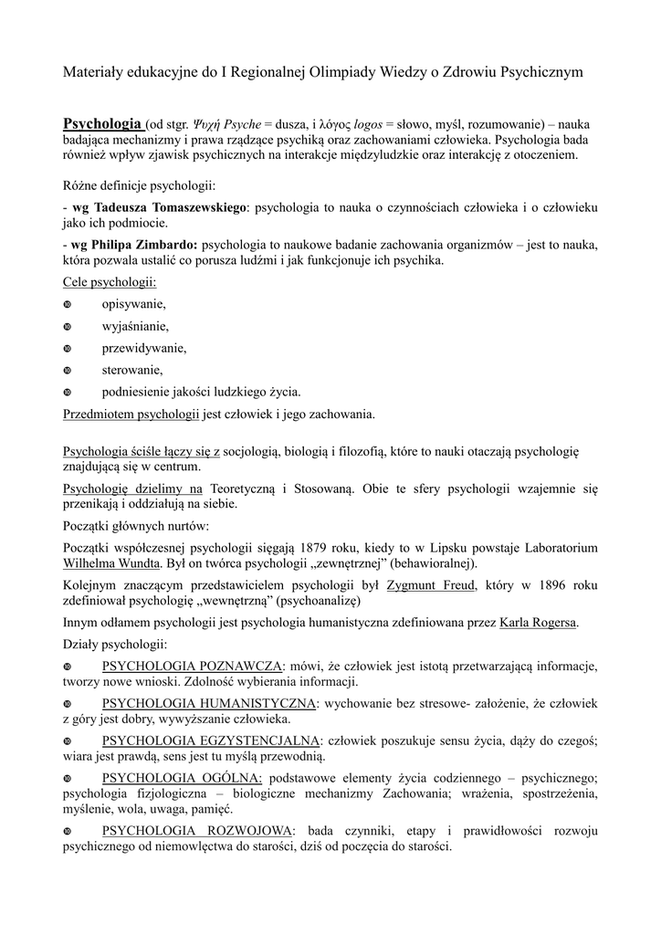 Materiały edukacyjne do I Regionalnej Olimpiady Wiedzy o Zdrowiu Psychicznym Psychologia (od stgr. Ψυχή Psyche = dusza, i λόγος logos = słowo, myśl, rozumowanie) – nauka badająca mechanizmy i prawa rządzące psychiką oraz zachowaniami człowieka. Psychologia bada również wpływ zjawisk psychicznych na interakcje międzyludzkie oraz interakcję z otoczeniem. Różne definicje psychologii: - wg Tadeusza Tomaszewskiego: psychologia to nauka o czynnościach człowieka i o człowieku jako ich podmiocie. - wg Philipa Zimbardo: psychologia to naukowe badanie zachowania organizmów – jest to nauka, która pozwala ustalić co porusza ludźmi i jak funkcjonuje ich psychika. Cele psychologii: opisywanie, wyjaśnianie, przewidywanie, sterowanie, podniesienie jakości ludzkiego życia. Przedmiotem psychologii jest człowiek i jego zachowania. Psychologia ściśle łączy się z socjologią, biologią i filozofią, które to nauki otaczają psychologię znajdującą się w centrum. Psychologię dzielimy na Teoretyczną i Stosowaną. Obie te sfery psychologii wzajemnie się przenikają i oddziałują na siebie. Początki głównych nurtów: Początki współczesnej psychologii sięgają 1879 roku, kiedy to w Lipsku powstaje Laboratorium Wilhelma Wundta. Był on twórca psychologii „zewnętrznej” (behawioralnej). Kolejnym znaczącym przedstawicielem psychologii był Zygmunt Freud, który w 1896 roku zdefiniował psychologię „wewnętrzną” (psychoanalizę) Innym odłamem psychologii jest psychologia humanistyczna zdefiniowana przez Karla Rogersa. Działy psychologii: PSYCHOLOGIA POZNAWCZA: mówi, że człowiek jest istotą przetwarzającą informacje, tworzy nowe wnioski. Zdolność wybierania informacji. PSYCHOLOGIA HUMANISTYCZNA: wychowanie bez stresowe- założenie, że człowiek z góry jest dobry, wywyższanie człowieka. PSYCHOLOGIA EGZYSTENCJALNA: człowiek poszukuje sensu życia, dąży do czegoś; wiara jest prawdą, sens jest tu myślą przewodnią. PSYCHOLOGIA OGÓLNA: podstawowe elementy życia codziennego – psychicznego; psychologia fizjologiczna – biologiczne mechanizmy Zachowania; wrażenia, spostrzeżenia, myślenie, wola, uwaga, pamięć. PSYCHOLOGIA ROZWOJOWA: bada czynniki, etapy i prawidłowości rozwoju psychicznego od niemowlęctwa do starości, dziś od poczęcia do starości. PSYCHOLOGIA OSOBOWOŚCI: zajmuje się strukturami psychicznymi człowieka, które tworzą się w trakcie rozwoju pod wpływem działania środowiska – sposób myślenia, motywacja, postrzeganie siebie i środowiska, charakter, temperament . PSYCHOLOGIA KLINICZNA: zajmuje się psychicznym zachowaniem człowieka w aspekcie zaburzeń. PSYCHOLOGIA SPOŁECZNA: zajmuje się wpływem jaki wywierają ludzie na poglądy i zachowania innych ludzi. PSYCHOLOGIA PRACY: analizuje przebieg działalności zawodowej człowieka, jego relacji do maszyn, innych pracowników, środków produkcji. PSYCHOLOGIA REHABILITACJI – REWALITACYJNEJ: defektologicznej. PSYCHOLOGIA RELIGII: bada zjawiska psychiczne występujące w życiu religijnym człowieka, nie bada przedmiotu religii, zajmuje się przedmiotem np.: dorosłości religijnej. PSYCHOLOGIA SĄDOWA: zajmuje się procesami psychicznymi osób odosobnionych, podczas rozpraw sądowych, stara się wyjaśnić mechanizmy powstawania czynów karalnych. .WSZTSTKIE PSYCHOLOGIE SĄ POWIĄZANE!!! Psychiatria jedna z podstawowych specjalizacji medycznych zajmująca się badaniem, zapobieganiem i leczeniem zaburzeń i chorób psychicznych. Bada ich uwarunkowania biologiczne, psychologiczne, rodzinno-genetyczne, społeczne, konstytucjonalne – sposoby powstawania i skutecznego zapobiegania. Psychiatria różni się od psychologii faktem, iż jest ona nauką medyczną, psychologia zaś, według podziału klasycznego jest subdyscypliną filozoficzną, która obecnie wyrosła na samodzielną naukę społeczną. Obie nauki są interdyscyplinarne i posiadają zróżnicowane podejścia, zawierające swoiste podstawy teoretyczne. Psychoterapia (od psyche = dusza i therapein = leczyć) to zbiór technik leczących lub pomagających leczyć rozmaite schorzenia i problemy natury psychologicznej. Wspólną cechą wszystkich tych technik jest kontakt międzyludzki, w odróżnieniu od leczenia czysto medycznego. Psychoterapią w szerokim znaczeniu tego pojęcia, określa się oddziaływanie lecznicze środkami psychologicznymi i środowiskowymi. W ścisłym znaczeniu obejmuje ona zaplanowane i systematyczne oddziaływanie psychologiczne, którego celem jest poprawa funkcjonowania psychicznego i adaptacji społecznej. Aktualnie istnieje wiele różnych kierunków psychoterapeutycznych, np. psychoanalityczna, dynamiczna, fenomenologiczna, behawioralna, a przyjmowane przez nie szczegółowe definicje pojęcia psychoterapii zawierają z reguły sprecyzowaną już koncepcję teoretyczną i wykluczają psychoterapeutyczne podejścia innego rodzaju. Czym jest psychoterapia? Jeden z prekursorów psychoterapii – Pierre Janet postrzegał psychoterapię jako zastosowanie wiedzy psychologicznej do leczenia różnych chorób. Definicja Janeta – jakkolwiek nieścisła – dawała jako taki obraz psychoterapii. W 1970 roku Stanislav Kratochvil dokonał próby określenia psychoterapii, i tak przez psychoterapię rozumiał „lecznicze oddziaływanie na chorobę, zaburzenie lub anomalię środkami psychologicznymi". W tym rozumieniu psychoterapia stanowi proces zamierzonego korygowania zaburzeń czynności organizmu za pomocą środków psychologicznych. Jak twierdzi Kartochvil „zaburzenie czynności może dotyczyć procesów psychicznych i osobowości lub procesów somatycznych i funkcji narządów". W swojej pracy z pacjentem psychoterapeuta wykorzystuje cały wachlarz środków psychologicznych. Podstawowym środkiem jest słowo, które stanowi oś komunikacji między dwoma podmiotami w procesie psychoterapii, czyli psychoterapeutą a pacjentem. Ponadto często stosowanymi 