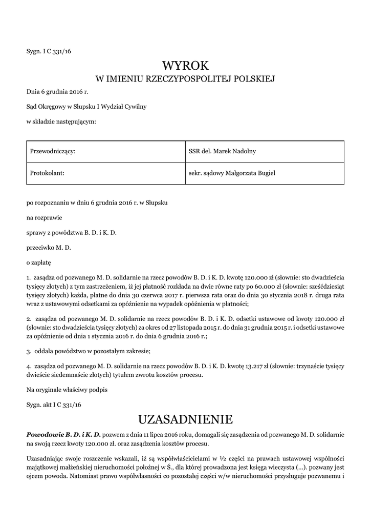 Sygn. I C 331/16 WYROK W IMIENIU RZECZYPOSPOLITEJ POLSKIEJ Dnia 6 grudnia 2016 r. Sąd Okręgowy w Słupsku I Wydział Cywilny w składzie następującym: Przewodniczący: SSR del. Marek Nadolny Protokolant: sekr. sądowy Małgorzata Bugiel po rozpoznaniu w dniu 6 grudnia 2016 r. w Słupsku na rozprawie sprawy z powództwa B. D. i K. D. przeciwko M. D. o zapłatę 1. zasądza od pozwanego M. D. solidarnie na rzecz powodów B. D. i K. D. kwotę 120.000 zł (słownie: sto dwadzieścia tysięcy złotych) z tym zastrzeżeniem, iż jej płatność rozkłada na dwie równe raty po 60.000 zł (słownie: sześćdziesiąt tysięcy złotych) każda, płatne do dnia 30 czerwca 2017 r. pierwsza rata oraz do dnia 30 stycznia 2018 r. druga rata wraz z ustawowymi odsetkami za opóźnienie na wypadek opóźnienia w płatności; 2. zasądza od pozwanego M. D. solidarnie na rzecz powodów B. D. i K. D. odsetki ustawowe od kwoty 120.000 zł (słownie: sto dwadzieścia tysięcy złotych) za okres od 27 listopada 2015 r. do dnia 31 grudnia 2015 r. i odsetki ustawowe za opóźnienie od dnia 1 stycznia 2016 r. do dnia 6 grudnia 2016 r.; 3. oddala powództwo w pozostałym zakresie; 4. zasądza od pozwanego M. D. solidarnie na rzecz powodów B. D. i K. D. kwotę 13.217 zł (słownie: trzynaście tysięcy dwieście siedemnaście złotych) tytułem zwrotu kosztów procesu. Na oryginale właściwy podpis Sygn. akt I C 331/16 UZASADNIENIE Powodowie B. D. i K. D. pozwem z dnia 11 lipca 2016 roku, domagali się zasądzenia od pozwanego M. D. solidarnie na swoją rzecz kwoty 120.000 zł. oraz zasądzenia kosztów procesu. Uzasadniając swoje roszczenie wskazali, iż są współwłaścicielami w ½ części na prawach ustawowej wspólności majątkowej małżeńskiej nieruchomości położnej w Ś., dla której prowadzona jest księga wieczysta (...). pozwany jest ojcem powoda. Natomiast prawo współwłasności co pozostałej części w/w nieruchomości przysługuje pozwanemu i jego żonie. Dalej podali, iż w dniu 11 września 2013 roku zawarli z firmą (...) Sp. z o.o. w S. umowę dzierżawy tejże nieruchomości. Dzierżawca zobowiązał się do zapłaty czynszu dzierżawnego w kwocie 120.000 zł. rocznie. Pozwany wskazał dzierżawcy swoje konto do płatności czynszu. Wskazywali, iż w latach 2014 i 2015 pozwany nie przekazał powodom przelanych przez dzierżawcę należnych im opłat czynszowych (k.2-7). Sąd wydał dnia 6 września 2016 roku nakaz zapłaty w postępowaniu upominawczym (k.40). Pozwany M. D. w sprzeciwie od nakazu zapłaty wniósł o oddalenie powództwa w całości i zasądzenie na swoją rzecz kosztów procesu. Uzasadniając swoje stanowisko procesowe zarzucił, iż działał na podstawie umowy zlecenia zawartej z powodami. Ponadto powoływał się na udzielone mu pełnomocnictwo do zawarcia umowy dzierżawy. Nie kwestionował faktu, iż czynsz dzierżawny wpłynął na jego konto. Zarzucał, iż umowa zlecenia uprawniała go do przeznaczenia kwot uzyskanych z umowy zlecenia na cele związane z remontem nieruchomości znajdujących się na przedmiotowej nieruchomości. Podał, iż dokonał prac budowlanych, elektrycznych, rozbiórkowych, hydraulicznych. Wskazywał ponadto, iż przekazał powódce trzykrotnie kwotę po 10.000 zł., zakupił powodowi samochód za 12.000 zł. oraz opony za 6.000 zł. Od momentu wypowiedzenia mu pełnomocnictwa, połowa należności z tytułu czynszu dzierżawy przekazywana była w połowie na rzecz powodów. Podał, iż nakłady na nieruchomość, której powodowie są współwłaścicielami przekraczają kwotę dochodzoną pozwem, na co przedstawił faktury (k. 48-53). Powodowie B. D. i K. D. w odpowiedzi na sprzeciw od nakazu zapłaty podtrzymali dotychczasowe stanowisko w sprawie. Ponadto wnieśli o zasądzenie odsetek ustawowych od kwoty 120.000 zł. od dnia 17 listopada 2015 roku do dnia 31 grudnia 2015 roku oraz odsetek ustawowych za opóźnienie za okres od dnia 1 stycznia 2016 roku do dnia zapłaty. Zakwestionowali istnienie umowy zlecenia, na którą powoływał się pozwany, zaprzeczyli, by wyrażali zgodę na przeznaczanie dochodów z czynszu dzierżawnego na remonty budynków. Zaprzeczyli również temu, by powódka otrzymała na swoją rzecz podawane przez pozwanego kwoty jak również cenie zakupu samochodu i opon do niego. Wskazali jednocześnie, iż pieniądze na jego zakup – z uwagi na datę transakcji - nie mogły pochodzić z uzyskanego czynszu dzierżawnego. Zarzucając ponadto, iż był to prezent pozwanego dla powoda (k.108-113). SĄD OKRĘGOWY USTALIŁ, CO NASTĘPUJE: Powodowie B. D. i K. D. są współwłaścicielami w ½ części na prawach ustawowej wspólności majątkowej małżeńskiej nieruchomości położnej w Ś. o powierzchni 89,20 ha, oznaczonej geodezyjnie jako działki (...), dla której prowadzona jest księga wieczysta (...). Udział w wysokości ½ przysługuje również na prawach ustawowej wspólności majątkowej małżeńskiej pozwanemu M. D. jego żonie H. D.. DOWÓD: odpis zwykły księgi wieczystej (...) (k.11). Przedmiotową nieruchomość strony oraz H. D. nabyli dnia 15 stycznia 1996 roku od Agencji Nieruchomości Rolnych. Zostali wyłonieni po przeprowadzonym postępowaniu przetargowym. Osobami wpłacającymi byli powód, pozwany i H. D.. Zapłata ceny następowała w ratach. DOWÓD: odpis zwykły księgi wieczystej (...) (k.11), pełnomocnictwo z dnia 23 lipca 2013 roku sporządzone przed notariuszem A. R.. A. nr (...) (k.12), umowa dzierżawy z dnia 11 września 2013 roku sporządzone przed notariuszem A. R.. A. nr (...) (k.12), informacja (...) z dnia 11-10-2016 roku oraz z dnia 27-10-2016 roku (k.101-102, 124), zeznanie H. D. (protokół rozprawy z dnia 08-11-2016 roku 00:31:22-00:47:08 – k.126-126v), zeznanie K. D. (protokół rozprawy z dnia 08-11-2016 roku 00:49:08-01:00:03 – k.126v-127), zeznanie B. D. (protokół rozprawy z dnia 06-12-2016 roku 00:02:28-00:17:33 – k.132-133). H. D. korzystała z kr