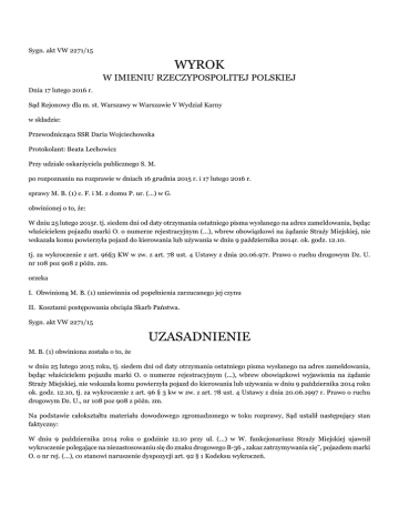 Sygn. akt VW 2271/15 WYROK W IMIENIU RZECZYPOSPOLITEJ POLSKIEJ Dnia 17 lutego 2016 r. Sąd Rejonowy dla m. st. Warszawy w Warszawie V Wydział Karny w składzie: Przewodnicząca SSR Daria Wojciechowska Protokolant: Beata Lechowicz Przy udziale oskarżyciela publicznego S. M. po rozpoznaniu na rozprawie w dniach 16 grudnia 2015 r. i 17 lutego 2016 r. sprawy M. B. (1) c. F. i M. z domu P. ur. (...) w G. obwinionej o to, że: W dniu 25 lutego 2015r. tj. siedem dni od daty otrzymania ostatniego pisma wysłanego na adres zameldowania, będąc właścicielem pojazdu marki O. o numerze rejestracyjnym (...), wbrew obowiązkowi na żądanie Straży Miejskiej, nie wskazała komu powierzyła pojazd do kierowania lub używania w dniu 9 października 2014r. ok. godz. 12.10. tj. za wykroczenie z art. 96§3 KW w zw. z art. 78 ust. 4 Ustawy z dnia 20.06.97r. Prawo o ruchu drogowym Dz. U. nr 108 poz 908 z późn. zm. orzeka I. Obwinioną M. B. (1) uniewinnia od popełnienia zarzucanego jej czynu II. Kosztami postępowania obciąża Skarb Państwa. Sygn. akt VW 2271/15 UZASADNIENIE M. B. (1) obwiniona została o to, że w dniu 25 lutego 2015 roku, tj. siedem dni od daty otrzymania ostatniego pisma wysłanego na adres zameldowania, będąc właścicielem pojazdu marki O. o numerze rejestracyjnym (...), wbrew obowiązkowi wyjawienia na żądanie Straży Miejskiej, nie wskazała komu powierzyła pojazd do kierowania lub używania w dniu 9 października 2014 roku ok. godz. 12.10, tj. za wykroczenie z art. 96 § 3 kw w zw. z art. 78 ust. 4 Ustawy z dnia 20.06.1997 r. Prawo o ruchu drogowym Dz. U., nr 108 poz 908 z późn. zm. Na podstawie całokształtu materiału dowodowego zgromadzonego w toku rozprawy, Sąd ustalił następujący stan faktyczny: W dniu 9 października 2014 roku o godzinie 12.10 przy ul. (...) w W. funkcjonariusz Straży Miejskiej ujawnił wykroczenie polegające na niezastosowaniu się do znaku drogowego B-36 „ zakaz zatrzymywania się”, pojazdem marki O. o nr rej. (...), co stanowi naruszenie dyspozycji art. 92 § 1 Kodeksu wykroczeń. Dowód: notatka urzędowa k. 10, zdjęcie k. 11 W piśmie z dnia 5 listopada 2014 r. skierowanym do M. B. (1), które jednakże nie zostało jej skutecznie doręczone, Straż Miejska m. st. W.(...) Oddział (...) zawarła informację dla M. B. (1) wskazując ją jako właścicielkę ww. pojazdu, że: jeżeli to ona jest osobą, która popełniła powyższe wykroczenie, to bez konieczności osobistego stawienia się w siedzibie Straży Miejskiej, istnieje możliwość zakończenia prowadzonych czynności w sprawie o wykroczenie poprzez wyrażenie zgody na przyjęcie mandatu karnego kredytowanego w wysokości 100 zł oraz, że za stwierdzone wykroczenie zostaną przypisane punkty karne w liczbie 1. Straż Miejska zawarła informację, że mandat karny kredytowany zostanie wystawiony i przesłany po uprzednim wypełnieniu, podpisaniu i odesłaniu załączonego oświadczenia (zawartego w części A załącznika). W piśmie tym zostało wskazane, że w przypadku, gdyby M. B. (1) nie była osobą, która popełniła wskazane powyżej wykroczenie, to zgodnie z art. 78 ust. 4, 5 ustawy Prawo o ruchu drogowym spoczywa na niej obowiązek wskazania, komu powierzyła pojazd do kierowania lub używania w oznaczonym czasie oraz, że osobę, której powierzyła pojazd do kierowania lub używania w oznaczonym czasie należy wskazać poprzez wypełnienie i dostarczenie Straży Miejskiej części B załącznika w terminie 7 dni od otrzymania niniejszego wezwania. Straż Miejska jednocześnie poinformowała, że w przypadku, gdy nie jest ona osobą, która popełniła powyższe wykroczenie w ruchu drogowym i nie dopełni obowiązku określonego w art. 78 ust. 4, 5 ustawy Prawo o ruchu drogowym, tj. nie wskaże komu powierzyła pojazd do kierowania lub używania w oznaczonym czasie, popełni wykroczenie określone w art. 96 § 3 Kodeksu Wykroczeń. Dowód: wezwanie k. 12 Powyższe pismo z dnia 5 listopada 2014 roku zostało doręczone na adres zameldowania obwinionej w dniu 12 listopada 2014 roku oraz odebrane przez jej matkę M. B. (2). Dowód: zwrotne potwierdzenie odbioru k. 13 Wobec braku odpowiedzi ze strony właścicielki pojazdu, pismem z dnia 4 lutego 2014 r. Straż Miejska m. st. W. III Oddział (...) skierowała wezwanie do M. B. (1) (w przypadku, gdyby ona była osobą, która użytkowała pojazd we wskazanym dniu 9 października 2014r. ok. godz. 12.10), do osobistego stawiennictwa do (...) Oddziału Terenowego Straży Miejskiej m. st. W. w W. w terminie 7 dni od daty otrzymania pisma w celu złożenia wyjaśnień w powyższej sprawie. W przypadku zaś, gdyby pojazd został powierzony, Straż miejska w piśmie sformułowała wezwanie do podania danych osobowych kierowcy, który pojazd użytkował we wskazanym dniu i przesłania ich w terminie 7 dni na adres Straży Miejskiej m. st. W. (...)Oddział (...). Dowód: wezwanie k. 14 Wezwanie zostało doręczone na adres zameldowania oskarżonej w dniu 18 lutego 2015 roku oraz odebrane przez jej matkę M. B. (2). Dowód: zwrotne potwierdzenie odbioru k. 16 W związku z nieustosunkowaniem się oskarżonej w stosunku do wskazanego powyżej wezwania, Straż Miejska m.st. W., (...) Oddział (...) w dniu 16 kwietnia 2015 roku skierowała do tutejszego Sądu wniosek o ukaranie B. M. na podstawie wykroczenia z art. 96 zw. z art. 78 ust. 4 Ustawy z dnia 20.06.1997 r. Prawo o ruchu drogowym Dz. U. nr 108 poz 908 z późn. zm. Postanowieniem z dnia 22 kwietnia 2015 roku tutejszy Sąd połączył do wspólnego rozpoznania sprawy (...) przeciwko M. B. (1) oraz (...) przeciwko F. B. oraz prowadzić je pod sygn. akt sprawy w której postępowanie wszczęto wcześniej, tj. (...) z uwagi, iż pomiędzy tymi sprawami zachodzi łączność przedmiotowa oraz obie prowadzone są przeciwko osobom, których czyny pozostają w ścisłym związku. W dniu 7 maja 2015 roku tutejszy Sąd wydał wyrok nakazowy, na mocy którego uznał obwinionych