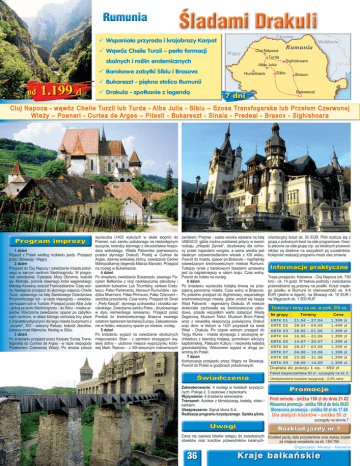 Śladami Drakuli Ukraina Wspaniała przyroda i krajobrazy Karpat Wąwóz Cheile Turzii – perła formacji Mołdawia Cluj Napoca Węgry Turda skalnych i roślin endemicznych 1.199 zł Sighishoara Alba Julia Barokowe zabytki Sibiu i Brasova od Rumunia Hunedoara Sibiu Brasov Bukareszt - piękna stolica Rumunii Drakula - spotkanie z legendą Bukareszt Se Ser errbia bi 7 Serbia dni Cluj Napoca - wąwóz Cheile Turzii lub Turda - Alba Julia - Sibiu – Szosa Transfogarska lub Przełom Czerwonej Wieży – Poenari - Curtea de Arges – Pitesti - Bukareszt - Sinaia - Predeal - Brasov - Sighishoara Program imprezy 1 dzień Wyjazd z Polski według rozkładu jazdy. Przejazd przez Słowację i Węgry. 2 dzień Przyjazd do Cluj Napocy i zwiedzanie miasta położnego w samym centrum Siedmiogrodu. W programie zwiedzania: Cytadela, Mury Obronne, kościół św. Michała, pomnik sławnego króla węgierskiego Macieja Korwina, kościół Franciszkanów. Czas wolny. Następnie przejazd do słynnego wąwozu Cheile Turzii, wpisanego na listę Światowego Dziedzictwa Przyrodniczego lub - w razie niepogody – zwiedzanie kopalni soli w Turdzie. Przejazd przez Albę Julię - jedną ze stolic Siedmiogrodu - do Sibiu - miasta artystów. Wieczorne zwiedzanie: spacer po zabytkowym centrum, w skład którego wchodzą trzy place z charakterystycznymi dla tego miasta budynkami z „oczami”, XVI - wieczny Ratusz, kościół Jezuitów, żelazny most Kłamców. Nocleg w Sibiu. 3 dzień Po śniadaniu przejazd przez Karpaty Szosą Transfogarską do Curtrea de Arges - w razie niepogody Przełomem Czerwonej Wieży. Po drodze piesza wycieczka (1400 wykutych w skale stopni!) do Poenari, ruin zamku położonego na niedostępnym szczycie, twierdzy słynnego z okrucieństwa hospodara wołoskiego, Wlada Palownika (pierwowzoru postaci słynnego Drakuli). Postój w Curtrea de Arges, dawnej wołoskiej stolicy, zwiedzanie Cerkwi Metropolitarnej (legenda Mistrza Manole). Przejazd na nocleg w Bukareszcie. 4 dzień Po śniadaniu zwiedzanie Bukaresztu zwanego Paryżem Bałkanów z racji neoklasycznej zabudowy i szerokich bulwarów: Łuk Triumfalny, cerkiew Cretulescu, Pałac Parlamentu, Ateneum Rumuńskie - siedziba filharmonii, Pałac Primaveri, Pałac Cotroceni – siedziba prezydenta. Czas wolny. Przejazd do Sinaii - „Perły Karpat”, słynnego uzdrowiska i ośrodka narciarskiego. Zwiedzanie zamku Peles - zbudowanego w stylu niemieckiego renesansu. Przejazd przez Predeal do średniowiecznego Brasova zwanego ostatnim bastionem łacińskiej Europy. Zakwaterowanie w hotelu, wieczorny spacer po mieście, nocleg. 5 dzień Po śniadaniu wyjazd na zwiedzanie okolicznych miejscowości: Bran - z zamkiem strzegącym wąskiej doliny - ulubione miejsce wypoczynku królowej Marii; Rasnov - z XIII-wiecznym malowniczym zamkiem; Prejmer - saska wioska wpisana na listę UNESCO, gdzie można podziwiać jedyny w swoim rodzaju „chłopski Zamek”, zbudowany dla ochrony przed najazdami wrogów, a sama wioska jest idealnym odzwierciedleniem wiosek z XIX wieku. Powrót do miasta, spacer po Brasovie – najchętniej odwiedzanym średniowiecznym mieście Rumunii. Tutejszy rynek z barokowymi fasadami uznawany jest za najpiękniejszy w całym kraju. Czas wolny. Powrót do hotelu na nocleg. 6 dzień Po śniadaniu wycieczka kolejką linową na przepiękną panoramę miasta. Czas wolny w Brasovie. Po południu przejazd do Sighishoary, wspaniałego średniowiecznego miasta, gdzie urodził się książę Wlad Palownik - legendarny Drakula. W mieście doskonale zachowała się średniowieczna zabudowa, przede wszystkim warto zobaczyć Wieżę Zegarową, Muzeum Tortur, Muzeum Broni Palnej wraz z niewielką ekspozycją poświęconą Drakuli oraz dom, w którym w 1431 przyszedł na świat Wlad - Drakula. Po czasie wolnym przejazd do Targu Mures - miasta słynącego z secesyjnej architektury z twierdzą miejską, pomnikiem wilczycy kapitolińskiej, Pałacem Kultury i niezwykłą katedrą greckokatolicką. Wieczorem wyjazd w drogę powrotną do Polski. 7 dzień Kontynuacja przejazdu przez Węgry na Słowację. Powrót do Polski w godzinach południowych. Świadczenia Zakwaterowanie: 4 noclegi w hotelach turystycznych. Pokoje 2, 3 osobowe z łazienkami. Wyżywienie: 4 śniadania serwowane. Transport: Autokar z klimatyzacją, toaletą, video i barkiem. Ubezpieczenie: Signal Iduna S.A. Realizacja programu turystycznego. Opieka pilota. orientacyjny koszt ok. 50 EUR. Pilot rozlicza się z grupą z pobranych kwot na cele programowe. Koszty płacone za cała grupę (np. za lokalnych przewodników) są dzielone na wszystkich jej uczestników. Kolejność realizacji programu może ulec zmianie. Informacje praktyczne Trasa przejazdu: Katowice - Cluj Napoca (ok. 750 km) - ok. 14 godz. W trakcie podróży i zwiedzania przewidziane są przerwy na posiłki. Koszt ciepłego posiłku w Rumunii to równowartość ok. 6-8 EUR (płatne w lejach), na Słowacji ok. 10 EUR i na Węgrzech ok. 1.500 HUF. Terminy i ceny za os. w pok. 2/3 os. Nr grupy Terminy Cena KRTK 01 21.04 – 27.04 1.399 zł KRTK 02 28.04 – 04.05 1.499 zł KRTK 03 26.05 – 01.06 1.399 zł KRTK 04 16.06 – 22.06 1.399 zł KRTK 05 14.07 – 20.07 1.399 zł KRTK 06 28.07 – 03.08 1.399 zł KRTK 07 04.08 – 10.08 1.399 zł KRTK 08 25.08 – 31.08 1.399 zł KRTK 09 08.09 – 14.09 1.399 zł Dopłata do pokoju 1-os. - 450 zł Pakiet bezpieczeństwa 50 zł - szczegóły na str. 6 Ubezpieczenie kosztów rezygnacji - 2,4% ceny Promocje First minute - zniżka 150 zł do dnia 21.02 Wiosenna promocja - zniżka 100 zł do dnia 20.03 Słoneczna promocja - zniżka 50 zł do 17.04 Dla stałych klientów - zniżka 50 zł szczegóły na stronie 7 Uwagi Rozkład jazdy nr 1 Cena nie zawiera biletów wstępu do zwiedzanych Rozkład jazdy, lista przystanków oraz wykaz dopłat obiektów oraz kosztów przewodników lokalnychza miejsce wsiadania na str. 154-155 Organizator: Almatur - Katowice 36 Kraje bałkańskie