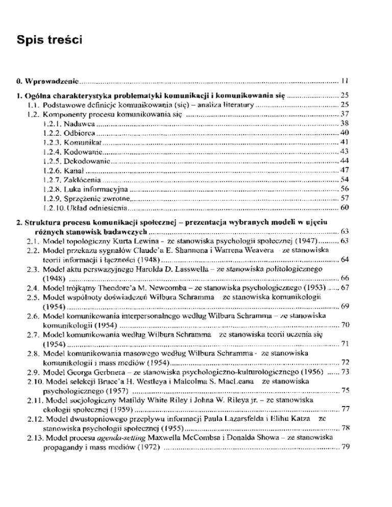 Spis treści 0. Wprowadzenie 11 1. Ogólna charakterystyka problematyki komunikacji i komunikowania się 1.1. Podstawowe definicje komunikowania (się) - analiza literatury 1.2. Komponenty procesu komunikowania się 1.2.1. Nadawca 1.2.2. Odbiorca 1.2.3. Komunikat 1.2.4. Kodowanie 1.2.5. Dekodowanie 1.2.6. Kanał 1.2.7. Zakłócenia 1.2.8. Luka informacyjna 1.2.9. Sprzężenie zwrotne 1.2.10. Układ odniesienia 25 25 37 38 40 41 43 44 47 54 56 57 60 2. Struktura procesu komunikacji społecznej - prezentacja wybranych modeli w ujęciu różnych stanowisk badawczych 2.1. Model topologiczny Kurta Lewina - ze stanowiska psychologii społecznej (1947) 2.2. Model przekazu sygnałów Claude'a E. Shannona i Warrena Weavera ze stanowiska teorii informacji i łączności (1948) 2.3. Model aktu perswazyjnego Harolda D. Lasswella - ze stanowiska politologicznego (1948) 2.4. Model trójkątny Theodore'a M. Newcomba - ze stanowiska psychologicznego (1953) 2.5. Model wspólnoty doświadczeń Wilbura Schramma ze stanowiska komunikologii (1954) 2.6. Model komunikowania interpersonalnego według Wilbura Schramma - ze stanowiska komunikologii (1954) 2.7. Model komunikowania według Wilbura Schramma - ze stanowiska teorii uczenia się (1954) 2.8. Model komunikowania masowego według Wilbura Schramma ze stanowiska komunikologii i mass mediów (1954) 2.9. Model Georga Gerbnera - ze stanowiska psychologiczno-kulturologicznego (1956) 2.10. Model selekcji Bruce'a H. Westleya i Malcolma S. MacLeana - ze stanowiska psychologicznego (1957) 2.11. Model socjologiczny Matildy White Riley i Johna W. Rileyajr. - ze stanowiska ekologii społecznej (1959) 2.12. Model dwustopniowego przepływu informacji Paula Lazarsfelda i Elihu Katza - ze stanowiska psychologii społecznej (1955) 2.13. Model procesu agenda-setting Maxwella McCombsa i Donalda Showa - ze stanowiska propagandy i mass mediów (1972) 63 63 64 66 67 69 70 71 72 73 75 77 78 79 z. 14. Model spirali milczenia Elizabeth Noelle-Neumann - ze stanowiska komunikacji masowej (1974) 2.15. Model lingwistyczny Romana Jacobsona - ze stanowiska semiotyki (1960) 3. Komunikowanie się jako działanie - prakseologiczny model struktury działania komunikacyjnego (koncepcja własna) 3.1. Pojęcie działania i działania komunikacyjnego 3.1.1. Definicje działania 3.1.2. Działanie komunikacyjne jako szczególna postać ogólnego pojęcia działania 3.2. Działanie komunikacyjne w ujęciu prakseologicznym 4. Sprawnościowe aspekty działania komunikacyjnego 4.1. Podstawy metodologiczne badań wskaźnikowych 4.2. Systematyzacja terminów cecha, właściwość, własność 4.3. Cechy sprawności charakteryzujące opis działania komunikacyjnego 4.3.1. Sprawność jako własność sprawcy, działania oraz rezultatu działania komunikacyjnego 4.3.1.1. Cecha czystości 4.3.1.2. Cecha celowości oraz cccha skuteczności 4.3.1.3. Cecha efektywności 4.3.1.4. Cecha ekonomiczności 4.3.1.5. Cecha oszczędności oraz cecha wydajności 4.3.1.6. Cecha korzystności 4.3.1.7. Cecha cenności lub wartości 5. Walory sprawnościowe komunikowania się w organizacji jako działania komunikacyjnego w ujęciu dostosowanym do potrzeb i analizy tego działania 5.1. Cechy sprawnościowe komunikatu pierwszego stopnia 5.1.1. Cecha aktualności 5.1.2. Cecha adekwatności 5.1.3. Cecha pełności 5.1.4. Cecha kompletności 5.1.5. Cecha trafności 5.1.6. Cecha dialogiczności 5.1.7. Cecha doskonałości 5.1.8. Cecha dostateczności 5.1.9. Cecha intencjonalności 5.1.10. Cecha jednoznaczności 5.1.11. Cecha konsensyjności 5.1.12.Cecha kompatybilności 5.1.13. Cecha komunikatywności 5.1.14.Cecha konkretności 5.1.15.Cecha dokładności 5.1.15.1. Cecha szczegółowości 5.1.15.2. Cecha ścisłości 5.1.16.Cecha precyzyjności 5.1.17. Cecha bezbłędności 5.1.18.Cecha zwięzłości 5.1.19. Cecha oczywistości 5.1.20. Cecha prostoty 5.1.21.Cecha odpowiedniości 81 83 85 85 85 89 99 105 106 HO 116 116 120 121 127 130 133 134 136 139 140 140 141 143 145 146 149 149 151 152 152 153 154 155 156 157 160 161 163 163 165 165 166 167 5.2. Cechy sprawnościowe komunikatu - drugiego i więcej stopnia 5.2.1. Cecha temperatury komunikatu 5.2.2. Cecha wiarygodności 5.2.3. Cecha pewności 5.2.4. Cecha operatybilności 5.3. Syntetyczna formuła poprawności sprawnościowej działania komunikacyjnego 6. Zakończenie 168 168 169 172 174 177 185 Słownik zagadnień poruszanych w pracy oraz kilka dodatkowych terminów komunikacyjnych 195 Bibliografia 237 Spis rysunków i tabel 247