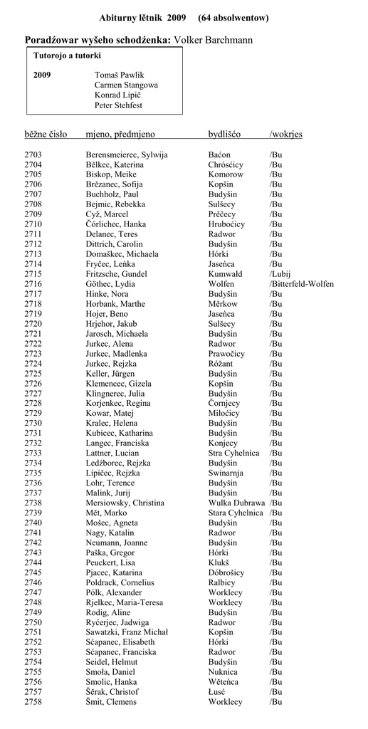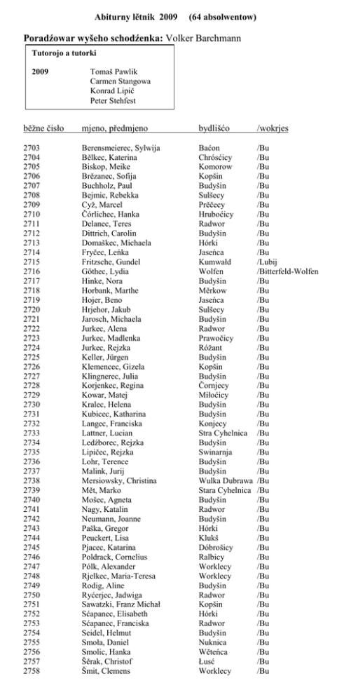 Abiturny lětnik 2009 (64 absolwentow) Poradźowar wyšeho schodźenka: Volker Barchmann Tutorojo a tutorki 2009 Tomaš Pawlik Carmen Stangowa Konrad Lipič Peter Stehfest běžne čisło mjeno, předmjeno bydlišćo /wokrjes 2703 2704 2705 2706 2707 2708 2709 2710 2711 2712 2713 2714 2715 2716 2717 2718 2719 2720 2721 2722 2723 2724 2725 2726 2727 2728 2729 2730 2731 2732 2733 2734 2735 2736 2737 2738 2739 2740 2741 2742 2743 2744 2745 2746 2747 2748 2749 2750 2751 2752 2753 2754 2755 2756 2757 2758 Berensmeierec, Sylwija Bělkec, Katerina Biskop, Meike Brězanec, Sofija Buchholz, Paul Bejmic, Rebekka Cyž, Marcel Čórlichec, Hanka Delanec, Teres Dittrich, Carolin Domaškec, Michaela Fryčec, Leńka Fritzsche, Gundel Göthec, Lydia Hinke, Nora Horbank, Marthe Hojer, Beno Hrjehor, Jakub Jarosch, Michaela Jurkec, Alena Jurkec, Madlenka Jurkec, Rejzka Keller, Jürgen Klemencec, Gizela Klingnerec, Julia Korjenkec, Regina Kowar, Matej Kralec, Helena Kubicec, Katharina Langec, Franciska Lattner, Lucian Ledźborec, Rejzka Lipičec, Rejzka Lohr, Terence Malink, Jurij Mersiowsky, Christina Mět, Marko Mošec, Agneta Nagy, Katalin Neumann, Joanne Paška, Gregor Peuckert, Lisa Pjacec, Katarina Poldrack, Cornelius Pólk, Alexander Rjelkec, Maria-Teresa Rodig, Aline Ryćerjec, Jadwiga Sawatzki, Franz Michał Sćapanec, Elisabeth Sćapanec, Franciska Seidel, Helmut Smoła, Daniel Smolic, Hanka Šěrak, Christof Šmit, Clemens Baćon Chrósćicy Komorow Kopšin Budyšin Sulšecy Prěčecy Hruboćicy Radwor Budyšin Hórki Jaseńca Kumwałd Wolfen Budyšin Měrkow Jaseńca Sulšecy Budyšin Radwor Prawočicy Róžant Budyšin Kopšin Budyšin Čornjecy Miłoćicy Budyšin Budyšin Konjecy Stra Cyhelnica Budyšin Swinarnja Budyšin Budyšin Wulka Dubrawa Stara Cyhelnica Budyšin Radwor Budyšin Hórki Klukš Dóbrošicy Ralbicy Worklecy Worklecy Budyšin Radwor Kopšin Hórki Radwor Budyšin Nuknica Wěteńca Łusć Worklecy /Bu /Bu /Bu /Bu /Bu /Bu /Bu /Bu /Bu /Bu /Bu /Bu /Lubij /Bitterfeld-Wolfen /Bu /Bu /Bu /Bu /Bu /Bu /Bu /Bu /Bu /Bu /Bu /Bu /Bu /Bu /Bu /Bu /Bu /Bu /Bu /Bu /Bu /Bu /Bu /Bu /Bu /Bu /Bu /Bu /Bu /Bu /Bu /Bu /Bu /Bu /Bu /Bu /Bu /Bu /Bu /Bu /Bu /Bu 2759 2760 2761 2762 2763 2764 2765 2766 Šmitec, Diana Šołćic, Franciska Šołta, Phillip Völklec, Stefanie Wićazec, Tereza Wos, Olga Zahonec, Tereza Žur, Syman Abiturny lětnik 2010 Radwor Lejno Chrósćicy Chrósćicy Pančicy-Kukow Budyšin Wěteńca Pěskecy (38 absolwentow) Poradźowar wyšeho schodźenka: Volker Barchmann Tutorojo a tutorki 2010 2767 2768 2769 2770 2771 2772 2773 2774 2775 2776 2777 2778 2779 2780 2781 2782 2783 2784 2785 2786 2787 2788 2789 2790 2791 2792 2793 2794 2795 2796 2797 2798 2799 2800 2801 2802 2803 2804 Beatrix Weiserowa Beata Pawlikowa Dirk Weithase Bětnarjec Cyž Cyžec Demuth Franz Gerlichec Hajna Handrik Hejduška Hejduška Heyder Jacobs Jakubašec Jatzke Ješkec Karichec Lattner Lešawa Matka Matkec Młynkec Nawkec Rachelic Reuter Ryćeric Rychtar Sauter Schierack Schmidt Schmutzler Schudack Šěnec Šmit Šramic Wałda Wowčerk Zahonec Zschabran Helena Christof Franciska Vivien Joeline Jana Michał Stanij Daniel Jakub Rebecca Paul-Philipp Andrea Anna-Theresa Hańžka Stefanie Johanna Jan Pawoł Terez Sabina Julia Josephina Conrad - Jacob Milenka Patrik Nadine Anja Paul Markus Marie-Josephine Anja Stefan Julia Antonius Toni Maria Claudia Kašecy Prěčecy Jawora Budyšin Komorow Sernjany Hórki Serbske Pazlicy Nowy Łusč Hórki Chójnica/Bu Pančicy-Kukow Zejicy Chelno Chelno Zwickau Stara Cyhelnica Budyšin Konjecy Serbske Pazlicy Šunow Wotrow Budyšin Mješicy Wotrow Baćon Budyšin Zdźěr Pančicy-Kukow Burkow Šešow Hrańca Hórki Radwor Ralbicy Pančicy-Kukow Wěteńca Wulka Dubrawa /Bu /Bu /Bu /Bu /Bu /Bu /Bu /Bu /Bu /Bu /Bu /Bu /Bu /Bu /Bu /Bu /Bu /Bu /Bu /Bu /Bu /Bu /Bu /Bu /Bu /Bu /Bu /Bu /Bu /Bu /Bu /Bu /Bu /Bu /Bu /Bu /Bu /Bu /Bu /Bu /Bu /Bu /Bu /Bu /Bu Abiturny lětnik 2011 (33 absolwentow) Poradźowar wyšeho schodźenka: Volker Barchmann Tutorojo a tutorki 2011 běžne čisło 2805 2806 2807 2808 2809 2810 2811 2812 2813 2814 2815 2816 2817 2818 2819 2820 2821 2822 2823 2824 2825 2826 2827 2828 2829 2930 2931 2932 2933 2934 2935 2936 2937 Tómaš Pawlik Carmen Stangowa mjeno, předmjeno Bart Měrćin Benad Natalie Bizoldec Johanna Brězanec Bernadet Deckwart Klara Maria Handrik Stanij Haškec Lucija Hawšec Zuzana Hrjehor Benjamin Kepstein Marie-Luise Kindermann Philipp Kral Maximilian Lerch Anne Melcher Tobias Mětec Tereza Niedenführ Nicole Oswald Johanna Richter Luise Schwede Maria Šenkec Daniela Serbinec Julija Šimanec Hańžka Sobotta Philipp Šołćic Christina Suchec Franciska Suchec Tereza Teichmann Marko Tschanter Maria Wolf Linda Wowtscherk Florian Wróblec Maria Tereza Zamora Gonzales Jenny Žur Konstantin bydlišćo Smječkecy Budyšin Haslow Prawočicy Budyšin Radwor Serbske Pazlicy Pančicy-Kukow Sulšecy Hodźij Budyšin Radwor Budyšin Budyšin Wudwor Wulka Dubrawa Budyšin Wulka Dubrawa Zdźěr Smjerdźacy Ralbicy-Róžant Chrósćicy Budyšin Dóbrošicy Budyšin Budyšin Pančicy-Kukow Budyšin Budyšin Dźěžnikecy Wotrow Budyšin Budyšin /wokrjes /Bu /Bu /Bu /Bu /Bu /Bu /Bu /Bu /Bu /Bu /Bu /Bu /Bu /Bu /Bu /Bu /Bu /Bu /Bu /Bu /Bu /Bu /Bu /Bu /Bu /Bu /Bu /Bu /Bu /Bu /Bu /Bu /Bu Abiturny lětnik 2012 (27 absolwentow) Poradźowar wyšeho schodźenka: Volker Barchmann Tutorojo a tutorki Konrad Lipič Peter Stehfest 2012 běžne čisło 2938 2939 2940 2941 2942 2943 2944 2945 2945 2947 2948 2949 2950 2951 2952 2953 2954 2955 2956 2957 2958 2959 2960 2961 2962 2963 2964 mjeno, předmjeno Bartke Brycka Cyž Cyž Handrik Hejduška Kindermann Kollár Kubitz Langec Lehmann Linke Markec Möller Neter Nuck Pakoßnick Parenz Pawlik Rječkec Schierz Šołćic Wenzel Wornarjec Weclichec Winarjec Zahon Luisa Fabian Christof Dawid Ławrjenc Patrik Florian Adrienne Tillmann Bernadet Dominic Anna Hanka Stephan Stefan Michał Nadine Karl Franziska Michał Juliana Sarah Hanka