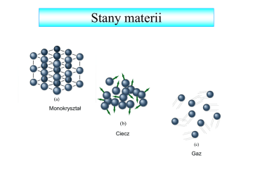 Stany materii Monokryształ Ciecz Gaz Masa i rozmiary cząstek •Masą atomową pierwiastka chemicznego nazywamy stosunek masy atomu tego pierwiastka do masy 1/12 atomu węgla 12C (12C - izotop węgla o liczbie masowej 12). •Masą cząsteczkową nazywamy stosunek masy cząsteczkowej danej substancji do 1/12 masy atomu węgla 12C. •Jednostkę masy równą 1/12 masy atomu węgla 12C nazywamy atomową jednostką masy. Masa i rozmiary cząstek Ilość substancji, zawierająca taką samą liczbę cząstek (atomów, cząstek, jonów, elektronów itp.) co 0.012 kg węgla 12C, nazywamy MOLEM. Liczba cząstek w molu to liczba AVOGADRA NA = 6.022x1023 Masa molowa – masa jednego mola danej substancji m- masa ciała (gazu), nmol-liczba moli, µ-masa molowa N-liczba cząstek nmol N = NA nmol = m µ Gaz doskonały •Objętość cząstek gazu jest o wiele mniejsza niż objętość zajmowana przez gaz. •Zasięg sił działających między dwiema cząsteczkami jest o wiele mniejszy niż średnia odległość międzycząsteczkowa. •Oddziaływania międzycząsteczkowe są pomijalnie małe. •Cząsteczki gazu zderzają się doskonale sprężyście ze ściankami naczynia, w którym znajduje się gaz. Prawo gazów doskonałych Równanie stanu gazu doskonałego (równanie Clapeyrona) Stan danej ilości gazu jest określony przez wartości trzech parametrów tzw. parametrów stanu gazu, którymi są ciśnienie p, objętość V i temperatura T. Są to parametry stanu gazu. Są one związane następującym równaniem : pV = nmol RT Gdzie: nmol - oznacza liczbę moli R = 8.31 J/mol K p - ciśnienie v - objętość T - temperatura Prawo gazów doskonałych c.d. Warunki normalne: Za warunki normalne przyjęto uważać: • temperaturę T0=273K, • ciśnienie p0=1.1 105 Pa, Objętość 1 mola każdego gazu jest stała i wynosi: • objętość normalna V0=22,4 10-3 m3 Stała gazowa R wynosi więc: p 0V0 J R= = 8,31 T0 mol ⋅ K Temperatura • Temperatura jest miarą energii kinetycznej cząstek. • Zderzenia pomiędzy cząstkami powodują redystrybucję energii Stopnie swobody Liczba stopni swobody = liczba niezależnych parametrów potrzebnych do opisania położenia cząstek układu n post = 3 nobr = 2 noscyl = 1 i = n post + nobr + 2noscyl Podstawowy wzór kinetycznej teorii gazów Z założeń dla gazu doskonałego wynika podstawowy wzór kinetycznej teorii gazów: 2 p = nE k 3 p- ciśnienie wywierane przez cząstki gazu na ścianki naczynia n – koncentracja cząstek, Ek- średnia energia kinetyczna cząstek wynosi: 3 E k = kT 2 k-stała Boltzmanna k = 1.38 ⋅ 10 −23 J / K Ciśnienie wywierane przez gaz na ścianki naczynia a) jedna cząstka założenie: zderzenia doskonale sprężyste mv12 mv22 = ⇒ v1 = v2 = v x 2 2 r r v2 = v2 zmiana pędu w wyniki zderzenia: r r r r r r ∆p 2mv x ∆p = mv2 − mv1 ⇒ F = = ∆t ∆t r 2mv x F= F = ∆t b) gaz doskonały o koncentracji n ∆N - ilość cząstek uderzających w czasie ∆t w fragment ściany o powierzchni ∆S 1 ∆N = n v x ∆t ∆S 2 2mv x 1 F= ⋅ n v x ∆t ∆S ∆t 2 mv x2 F p= = 2n ⋅ ∆S 2 Cząstki w gazie poruszają się całkowicie chaotycznie, stąd v x2 = v 2y = v z2 Ek = v 2 = v x2 + v 2y + v z2 = 3v x2 m ( v x2 + v 2y + v z2 ) 2 3mv 2 = 2 2 3 ⋅ mv 1 2 x p = 2n ⋅ ⋅ = n ⋅ Ek 3 2 3 2 2 3 p = n ⋅ Ek = n ⋅ kT = nkT 3 3 2 Równanie gazu doskonałego p = nkT n mol N n mol N A n= = ⇒ p= N A kT V V V R nmol - ilość moli gazu Równanie gazu doskonałego pV = nmol RT Pojemność cieplna gazu doskonałego • Energia wewnętrzna jednego mola gazu doskonałego i i U m = N A ⋅ E = N AkT = RT 2 2 • Pojemność cieplna przy stałej objętości i ∆U m 2 R ⋅ ∆T i CV = = = R ∆T ∆T 2 U m = CV T ⇒ U (T ) = nnol CV T Energia wewnętrzna Energia wewnętrzna – suma energii kinetycznych i potencjalnych atomów ( molekuł) tworzących układ Energia wewnętrzna jest funkcją stanu. Jej wartość nie zależy od sposobu ( rodzaju procesów termodynamicznych) w jaki stan układu został osiągnięty. Zależy jedynie od parametrów makroskopowych określających stan układu. Energia wewnętrzna Energia wewnętrzna jest funkcją stanu. Podczas dowolnego procesu, w wyniku którego układ wraca do stanu wyjściowego, całkowita zmiana jego energii wewnętrznej równa się zero. Energia wewnętrzna zależy jedynie od parametrów makroskopowych określających stan układu. Praca i ciepło podobnej zależności nie spełniają. Praca gazu •Tłok przesuwa się na odległość dl w wyniku ekspansji gazu o ciśnieniu p •Siła działająca na tłok: F = p·A •Wykonana przez gaz praca: dW = F ⋅ dl = pA ⋅ dl dW = p ⋅ dV • Praca wykonana przez gaz w czasie rozprężania od objętości Vp do Vk : W = ∫ dW = Vk ∫ p dV Vp Praca gazu Wykonana praca zależy od rodzaju przemiany. VB W= ∫ PdV VA = pole pod krzywą p - V Zerowa zasada termodynamiki Jeżeli ciało A i ciało B są w równowadze termodynamicznej z ciałem C to ciała A i B są w równowadze termodynamicznej ze sobą. Pierwsza zasada termodynamiki Q = ∆U + W Ciepło dostarczone do układu jest zużywane na przyrost energii wewnętrznej tego układu i na wykonanie przez układ pracy nad zewnętrznymi siłami. Pierwsza zasada termodynamiki Q = ∆U + W Układ pobiera Q>0 ciepło W<0 Siły zewnętrzne wykonują pracę nad układem W>0 Q<0 Układ oddaje ciepło Przemiany gazowe p Przejście gazu ze stanu 1 określonymi parametrami p1,v1,T1 do stanu 2 określonego parametrami p2,v2,T2 może odbywać się po różnych drogach, np. po drodze a, lub po drodze b (rys) 1 b a 2 V Przemiana izotermiczna T= const Jest to przemiana , która zachodzi w stałej temperaturze Prawo Boyle’a-Mariotte’a p 1V 1 = p 2 V 2 = const pV=const równanie izotermy p p2 T=const izoterma p1 V1 V2 V Przemiana izotermiczna Przemiana izobaryczna p=const Jest to przemiana , która zachodzi przy stałym ciśnieniu. V V1 V2 = = const T1 T2 p=const V1 V2 T1 V = const T jest to równa