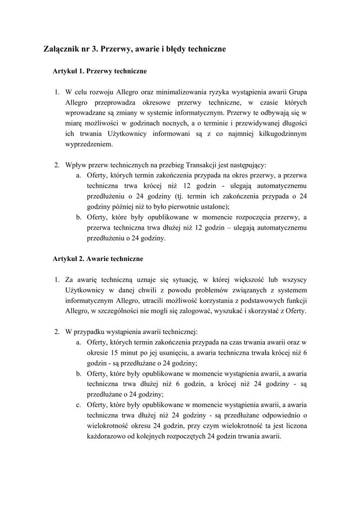 Załącznik nr 3. Przerwy, awarie i błędy techniczne Artykuł 1. Przerwy techniczne 1. W celu rozwoju Allegro oraz minimalizowania ryzyka wystąpienia awarii Grupa Allegro przeprowadza okresowe przerwy techniczne, w czasie których wprowadzane są zmiany w systemie informatycznym. Przerwy te odbywają się w miarę możliwości w godzinach nocnych, a o terminie i przewidywanej długości ich trwania Użytkownicy informowani są z co najmniej kilkugodzinnym wyprzedzeniem. 2. Wpływ przerw technicznych na przebieg Transakcji jest następujący: a. Oferty, których termin zakończenia przypada na okres przerwy, a przerwa techniczna trwa krócej niż 12 godzin ulegają automatycznemu przedłużeniu o 24 godziny (tj. termin ich zakończenia przypada o 24 godziny później niż to było pierwotnie ustalone); b. Oferty, które były opublikowane w momencie rozpoczęcia przerwy, a przerwa techniczna trwa dłużej niż 12 godzin – ulegają automatycznemu przedłużeniu o 24 godziny. Artykuł 2. Awarie techniczne 1. Za awarię techniczną uznaje się sytuację, w której większość lub wszyscy Użytkownicy w danej chwili z powodu problemów związanych z systemem informatycznym Allegro, utracili możliwość korzystania z podstawowych funkcji Allegro, w szczególności nie mogli się zalogować, wyszukać i skorzystać z Oferty. 2. W przypadku wystąpienia awarii technicznej: a. Oferty, których termin zakończenia przypada na czas trwania awarii oraz w okresie 15 minut po jej usunięciu, a awaria techniczna trwała krócej niż 6 godzin są przedłużane o 24 godziny; b. Oferty, które były opublikowane w momencie wystąpienia awarii, a awaria techniczna trwa dłużej niż 6 godzin, a krócej niż 24 godziny są przedłużane o 24 godziny; c. Oferty, które były opublikowane w momencie wystąpienia awarii, a awaria techniczna trwa dłużej niż 24 godziny są przedłużane odpowiednio o wielokrotność okresu 24 godzin, przy czym wielokrotność ta jest liczona każdorazowo od kolejnych rozpoczętych 24 godzin trwania awarii. Niezależnie od długości awarii technicznej, jeżeli którejkolwiek z Ofert z przyczyn technicznych nie udało się przedłużyć i zakończyła się w czasie awarii, wówczas opłaty i prowizje dotyczące tej Oferty nie są naliczane, a pobrane są zwracane w terminie nie dłuższym niż 14 dni od daty wystąpienia awarii. Artykuł 3. Błędy techniczne Za błąd techniczny uznaje się każdy problem techniczny związany z funkcjonowaniem systemu informatycznego Allegro inny niż wskazany w art. 2 powyżej. Decyzję o ewentualnych rekompensatach i zwrotach Grupa Allegro podejmuje każdorazowo po usunięciu błędu technicznego, uwzględniając jego rodzaj, długość trwania i skalę negatywnych skutków. Artykuł 4. Informacje Informacje dotyczące przerw technicznych, wystąpienia awarii lub błędów technicznych umieszczane są w sekcji "Centrum Pomocy" w dziale "Aktualności".