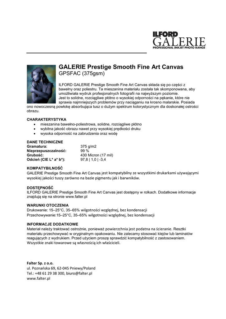 GALERIE Prestige Smooth Fine Art Canvas GPSFAC (375gsm) ILFORD GALERIE Prestige Smooth Fine Art Canvas składa się po części z bawełny oraz poliestru. Ta mieszanina materiału została tak skomponowana, aby umożliwiała wydruk profesjonalnych fotografii na najwyższym poziomie. Jest to solidne, rozciągliwe płótno o wysokiej odporności na pękanie, które nie sprawia najmniejszych problemów przy naciąganiu na krosno malarskie. Posiada ono nowoczesną powłokę absorbująca tusz o dużym spektrum kolorystycznym dla doskonałej ostrości obrazu. CHARAKTERYSTYKA • mieszanina bawełno-poliestrowa, solidne, rozciągliwe płótno • wybitna jakość obrazu nawet przy wysokiej prędkości druku • wysoka odporność na zabrudzenia oraz wodę DANE TECHNICZNE Gramatura: Nieprzepuszczalność: Grubość: Odcień (CIE L* a* b*): 375 g/m2 99 % 430 Micron (17 mil) 97,8 | 1,0 | -3,4 KOMPATYBILNOŚĆ GALERIE Prestige Smooth Fine Art Canvas jest kompatybilny ze wszystkimi drukarkami używającymi wysokiej jakości tuszy zarówno na bazie pigmentu jak i barwników. DOSTĘPNOŚĆ ILFORD GALERIE Prestige Smooth Fine Art Canvas jest dostępny w rolkach. Dodatkowe informacje znajdują się na stronie www.falter.pl WARUNKI OTOCZENIA Drukowanie: 15–25°C, 35–65% wilgotności względnej, bez kondensacji Przechowywanie:15–25°C, 35–65% wilgotności względnej, bez kondensacji INFORMACJE DODATKOWE Materiał należy traktować ostrożnie, ponieważ powierzchnia jest podatna na ścieranie. Resztki materiału przechowywać w oryginalnym opakowaniu. Nie zalecamy stosować klejów lub laminatów reagujących z wydrukiem. Przed użyciem proszę sprawdzić kompatybilność z zastosowaniem. Wszystkie znaki towarowe są własnością ich właścicieli. Falter Sp. z o.o. ul. Poznańska 69, 62-045 Pniewy/Poland Tel.: +48 61 29 38 300, [email protected] www.falter.pl