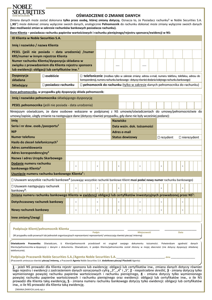 OŚWIADCZENIE O ZMIANIE DANYCH Zmiana danych może zostać dokonana tylko przez osobę, której zmiany dotyczą. Oznacza to, że Posiadacz rachunku1 w Noble Securities S.A. („NS”) może dokonać zmiany wyłącznie swoich danych, analogicznie Pełnomocnik do rachunku dokonać może zmiany wyłącznie swoich danych (bez możliwości zmian w zakresie rachunków bankowych posiadacza rachunku). Dane Klienta – posiadacza rachunku papierów wartościowych i rachunku pieniężnego/rejestru sponsora/ewidencji w NS: ID Klienta w Noble Securities S.A. Imię i nazwisko / nazwa Klienta PESEL (jeśli nie posiada – data urodzenia) /numer KRS/numer w innym rejestrze Klienta Numer rachunku Klienta/dyspozycja składana w związku z prowadzeniem dla Klienta rejestru sponsora lub ewidencji: obligacji lub certyfikatów inw. 2 Dyspozycja składana Składający osobiście telefonicznie (możliwa tylko w zakresie zmiany: adresu e-mail, numeru telefonu, telefaksu, adresu do korespondencji, numeru rachunku bankowego - dotyczy również dodania kolejnego rachunku bankowego) posiadacz rachunku pełnomocnik do rachunku (tylko w zakresie danych pełnomocnika do rachunku) Dane pełnomocnika, w przypadku gdy dyspozycję składa pełnomocnik: Imię i nazwisko pełnomocnika składającego dyspozycję PESEL pełnomocnika (jeśli nie posiada - data urodzenia) Niniejszym oświadczam, że dane osobowe wskazane w podpisanej z NS umowie/oświadczeniach do umowy/pełnomocnictwie do umowy/zapisie, uległy zmianie na następujące dane (dotyczy również przypadku, gdy dane nie były wcześniej podane): Imię Nazwisko 2 Seria i nr dow. osob./paszportu Data ważn. dok. tożsamości NIP Numer telefonu Adres e-mail Status dewizowy rezydent nierezydent Hasło do zleceń telefonicznych3 Adres zameldowania Adres korespondencyjny4 Nazwa i adres Urzędu Skarbowego Dodanie numeru rachunku bankowego Klienta3 Usunięcie numeru rachunku bankowego Klienta3 : - - - - - Usuwam wszystkie rachunki bankowe3 (usuwając wszystkie rachunki bankowe Klient musi podać nowy numer rachunku bankowego) Usuwam następujący rachunek bankowy3: Zmiana numeru rachunku bankowego Klienta w ewidencji obligacji lub certyfikatów inwestycyjnych prowadzonej przez NS5: Dotychczasowy rachunek bankowy - - - - - - Nowy rachunek bankowy - - - - - - Inne zmiany/Uwagi Podpisuje Klient/pełnomocnik Klienta __________________________________ ____________________ Podpis Miejscowość (W przypadku osób prawnych lub jednostek organizacyjnych reprezentanci reprezentant/ umieszczają również pieczęć imienną) ____________________ Data Oświadczenie Pracownika: Oświadczam, iż Klient/pełnomocnik przedstawił mi oryginał swojego dokumentu tożsamości. Potwierdzam zgodność danych Klienta/pełnomocnika w dyspozycji z danymi z dokumentu. Oświadczam, iż podpis Klienta/pełnomocnika został złożony w mojej obecności (nie dotyczy dyspozycji składanej telefonicznie). Podpisuje Pracownik Noble Securities S.A./Agenta Noble Securities S.A.__________________________________, dnia _________________ (Pracownik umieszcza również pieczęć imienną, a Pracownik Agenta Noble Securities S.A. dodatkowo pieczęć Placówki Agenta) 1 - jeżeli NS prowadzi dla Klienta rejestr sponsora lub ewidencję: obligacji lub certyfikatów inw., zmiana danych dotyczy również tego rejestru i ewidencji z zastrzeżeniem danych oznaczonych cyfrą „3”, „4” i „5”, 2 - niepotrzebne skreślić, 3 - zmiany dotyczą tylko wymienionego powyżej rachunku papierów wartościowych i rachunku pieniężnego, 4 - zmiana dotyczy tylko wymienionego powyżej rachunku papierów wartościowych i rachunku pieniężnego oraz ewidencji: obligacji lub certyfikatów inw., o ile NS prowadzi dla Klienta taką ewidencję, 5 - zmiana numeru rachunku bankowego dotyczy tylko ewidencji: obligacji lub certyfikatów inw., o ile NS prowadzi dla Klienta taką ewidencję. ZMIANA.DANYCH.2016.142.1