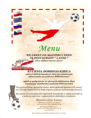 Menu WE GREET ON MASTERLY FEED IN RESTAURANT “ LANSE “ Give abduct soccer fever! KUCHNIA DOBREGO KIBICA „sekret dobrej kondycji tkwi we właściwym odżywianiu się podczas kibicowania” sport w połączeniu ze zdrowym jedzeniem daje maximum możliwości podczas kibicowania Przygotowaliśmy specjalne menu, które podczas sportowych emocji nie obciąży organizmu a doda wigoru podczas futbolowego ferworu dla fanów emocjonujących rozgrywek transmisje w miłej atmosferze z pełnym talerzem i odpowiednio dobranym trunkiem. Restauracja Lanse catering, przyjęcia, bankiety rezerwacja: tel./ fax.: 022 629 78 06 Warszawa, Pl. Konstytucji 1 wejście od ul. Marszałkowskiej 45/49 www.lanse.pl Do rachunku powyżej 200 zł doliczane jest 10 % serwisu przystawki zimne i gorące hot and cold starters Carpaccio z polędwicy wołowej – z balsamicznym sosem i tartym parmezanem – 30,00 Beef carpaccio with balsamic sauce and grated parmesan Mix serów z grilla na sałatach żurawinowym sosem polane– 25,00 grilled mix cheeses in a lettuce with cranberry sauce Małże nowozelandzkie po marynarsku – duszone W białym winie z dodatkiem śmietany – 34,00 New Zealand mussels sailor style, stewed in white wine with cream Krewetki „black tiger” podane z czosnkiem i pietruszką - 50,00 Black tiger shrimps served with garlic and parsley. Szparagi z grilla w szynce parmeńskiej na sosie dorblue – 30,00 Grilled asparagus with parma ham and dorblue sauce Pierogi domowe (6 szt.) – 21,00 -ruskie Home made stuffed polish dumplings -z mięsem Russian style (with white cheese and potatoes) with meat -z kapustą i grzybami with cabbage and mushrooms sałatki salads Sałatka z ruccollą, suszonymi pomidorami, sandwichami łososiowymi i sosem dijon - 24,00 Salad with rocket, sun dried tomatoes, salmon and dijon sauce Misa sałat z pikantnymi krewetkami i grzankami czosnkowymi - 30,00 Bowl of lettuce with spicy shrimps and garlic croutons „młodość” – 26,00 Chrupiące sałaty z bakaliami, marynowaną piersią kurczaka oraz wplecionymi cząstkami Cytrusów w asyście sosu miodowo – balsamicznego Crunchy lettuce with sweetmeats, marinated chicken breast and citrus pieces with honey-balsamic sauce Rumiana pierś – 24,00 Rumiano grillowane piersi kurczaka w kontekście zielonej sałaty z pachnącymi pomidorkami i prażonymi pestkami dyni, sos balsamiczny Golden grilled breast of chicken and green lettuce garnish with sweet baby tomatoes and roasted pumpkin seeds, with balsamic sauce Tercet egzotyczny – 25,00 Sałaty, melon, krwewtki, kraby, szyjki rakowe, kiełki, sos jogurtowo – pieprzowy Mix of lettuce, melon, shrimps, crabs, crayfish and beansprouts with a pepper-yoghurt sauce Sałatka Nerona – 22,00 Salata, warzywa, ser feta, oliwki, prażone pestki dyni sos balsamiczno miodowy Lettuce, vegetables, feta cheese, olives, roasted pumpkin seeds, honey-balsamic sauce zupy soups Zupa serowa z kwiatem brokuły i prażoną cebulką – 13,00 Cheese soup with broccoli florets and roasted onion Krem pomidorowy z serem – 13,00 Cream of tomato with cheese Dary lasu –krem borowikowy – 14,00 Forest’s goodness – cream of wild mushroom (boletus) Norweska zupa rybna – 15,00 Norwegian fish soup Żurek z białą kiełbasą i jajkiem – 15,00 Sour flour-based soup with white sausage and egg mięsa meat Soczysta pierś drobiowa na pierzynce szpinakowej z dorblu, ziemniaczki, młoda marchew – 34,00 Juicy breast of chicken on a bed of spinach with dorblu cheese, potatoes and baby carrots Grillowana pierś drobiowa faszerowana szynką parmeńską, serkiem philadelphia i papryczką chili, ziemniaki, bukiet sałat – 38,00 Grilled breast of chicken stuffed with parma ham, philadelphia cream cheese and chilli, served with potatoes and a mixed salad Wylansowana kaczka, ziemniaczki, buraczki – 56,00 Duck served with potatoes and beetroot Stek z polędwicy wołowej marynowany w ziołach, podany na sosie pieprzowym, ziemniaczki, warzywa z grilla – 55,00 Beef loin steak marinated in herbs, served in a pepper sauce, with potatoes and grilled vegetables Polędwica wołowa z grilla z krewetkami, ziemniaki, bykiet sałat - 59,00 Grilled beef loin with shrimps, potatoes and a mixed salad Przysmak św. Huberta – polędwiczki wieprzowe w sosie z leśnych grzybów, kopytka – 36,00 Saint hubert‘s delicacy – pork loins in a wild mushroom sauce with potato dumplings Cielęcina z kostką z grilla na sosie borowikowym z kluseczkami włoskimi i bukietem sałat 53,00 Grilled veal on the bone in wild mushroom sauce with gnocci and a mixed salad Polędwiczki wieprzowe faszerowane suszonymi pomidorami na sosie kurkowym, kluseczki włoskie, bukiet sałat - 44,00 Pork loins stuffed with sun dried tomatoes with chanterelle sauce, gnocci, mixed salad ryby fish desery deserts Sernik ciotki lucyny z białą czekoladą – 16,00 Łosoś z grilla w bekonie, ziemniaki opiekane, bukiet sałat – 42,00 Aunt lucyna’s cheesecake with white chocolate Grilled salmon and bacon with potatoes and mixed salad Tiramisu z orzechami – 19,00 Sandacz na sosie kurkowym z ziemniaczkami opiekanymi lub ryżem i bukietem sałat – 49,00 Tiramisu (with nuts) Panna cotta – 17,00 Panna cotta Sander in a chanterelle sauce with roasted potatoes or rice and mixed salad Creme brulee –17,00 Dorsz w śmietanie zapiekany z parezanem, ziemniaczki opiekane i warzywa blanszowane – 43,00 Sorbet mango na musie owocowym – 19,00 Creme brulee Mango sorbet in strawberry mousse Cod in cream baked with parmesan, with roasted potatoes and blanched vegetables Pstrąg z grilla z masełkiem czosnkowym, ziemniaczki opiekane, warzywa blanszowane - 39,00 Grilled trout with garlic butter, roasted potatoes and blanched vegetables pasty - spaghetti pasta dishes – spaghetti Pasta carbonara – 27,00 Pasta carbonara with carem, bacon, garlic and parmesan Pasta ze szpinakiem, serem dorblu i grillowanym kurczakiem – 28,00 Pasta with spinach, dorblu c