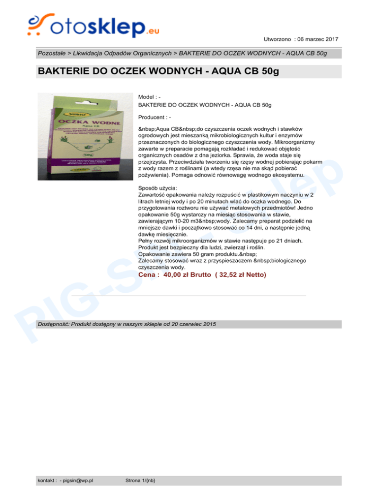 Utworzono : 06 marzec 2017 Pozostałe > Likwidacja Odpadów Organicznych > BAKTERIE DO OCZEK WODNYCH - AQUA CB 50g BAKTERIE DO OCZEK WODNYCH - AQUA CB 50g Model : BAKTERIE DO OCZEK WODNYCH - AQUA CB 50g Producent : Aqua CB do czyszczenia oczek wodnych i stawków ogrodowych jest mieszanką mikrobiologicznych kultur i enzymów przeznaczonych do biologicznego czyszczenia wody. Mikroorganizmy zawarte w preparacie pomagają rozkładać i redukować objętość organicznych osadów z dna jeziorka. Sprawia, że woda staje się przejrzysta. Przeciwdziała tworzeniu się rzęsy wodnej pobierając pokarm z wody razem z roślinami (a wtedy rzęsa nie ma skąd pobierać pożywienia). Pomaga odnowić równowagę wodnego ekosystemu. p e l k S Sposób użycia: Zawartość opakowania należy rozpuścić w plastikowym naczyniu w 2 litrach letniej wody i po 20 minutach wlać do oczka wodnego. Do przygotowania roztworu nie używać metalowych przedmiotów! Jedno opakowanie 50g wystarczy na miesiąc stosowania w stawie, zawierającym 10-20 m3 wody. Zalecamy preparat podzielić na mniejsze dawki i początkowo stosować co 14 dni, a następnie jedną dawkę miesięcznie. Pełny rozwój mikroorganizmów w stawie następuje po 21 dniach. Produkt jest bezpieczny dla ludzi, zwierząt i roślin. Opakowanie zawiera 50 gram produktu. Zalecamy stosować wraz z przyspieszaczem biologicznego czyszczenia wody. N I -S Cena : 40,00 zł Brutto ( 32,52 zł Netto) G I P Dostępność: Produkt dostępny w naszym sklepie od 20 czerwiec 2015 kontakt : - [email protected] Strona 1/{nb}